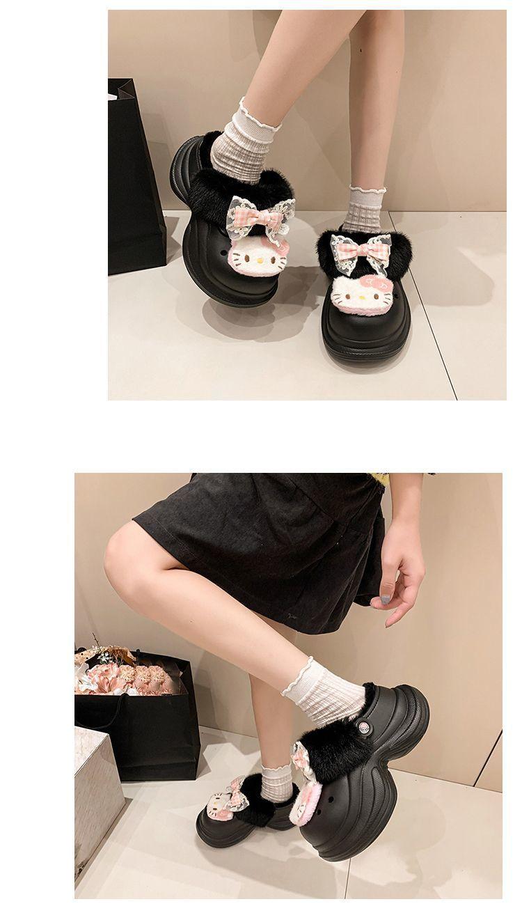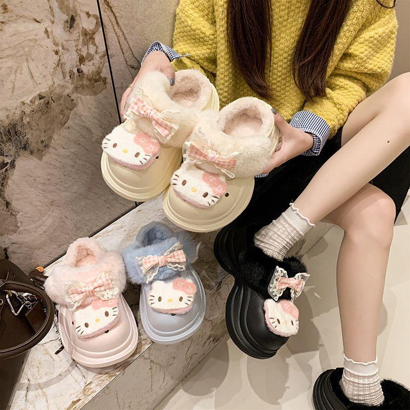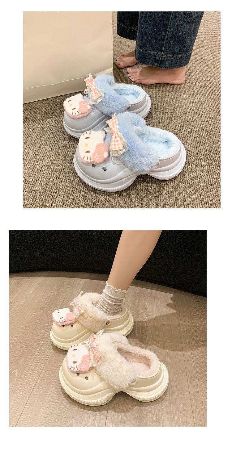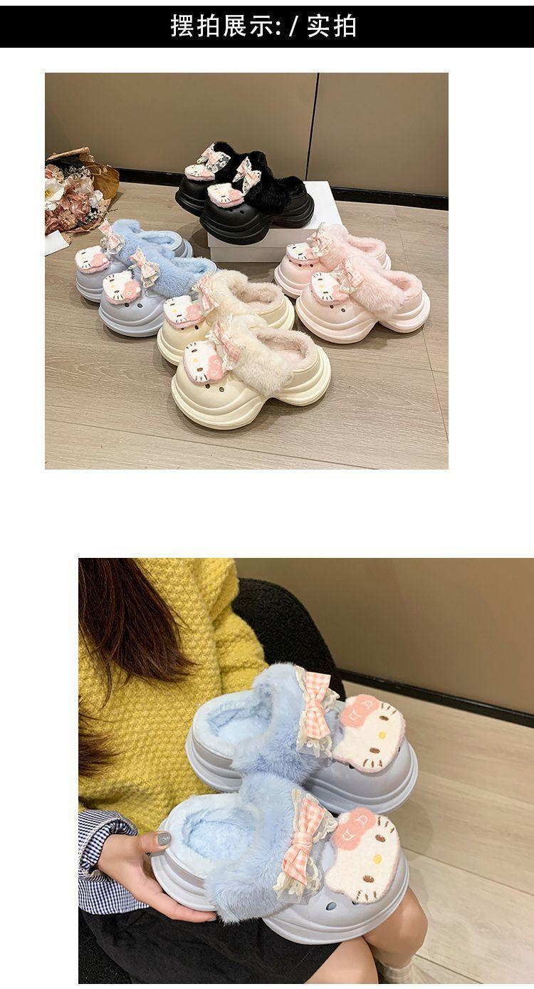 Pantufas de Gatinho de Desenho Animado Femininas Forradas com Lã Quentes para Exterior com Sola Plataforma Antiderrapante Pantufas Preguiçosas de Bico Fechado 2025 Outono/Inverno Novas