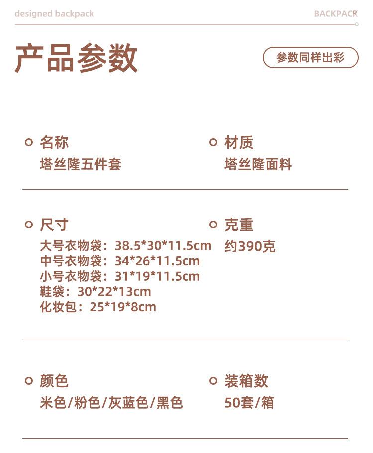 Tasslon five-piece set-off-white, Taslon Five-Piece Set - Pink, Taffeta five-piece set-blue, Taslan Five-Piece Set - Black