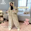 Pijama Macacão com Capuz de Lã Coral Estilo Doce Filhote de Orelhas Caídas para Mulheres Outono/Inverno Roupa de Casa Quente Macacão de Lã Coral