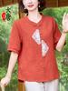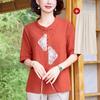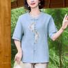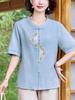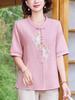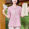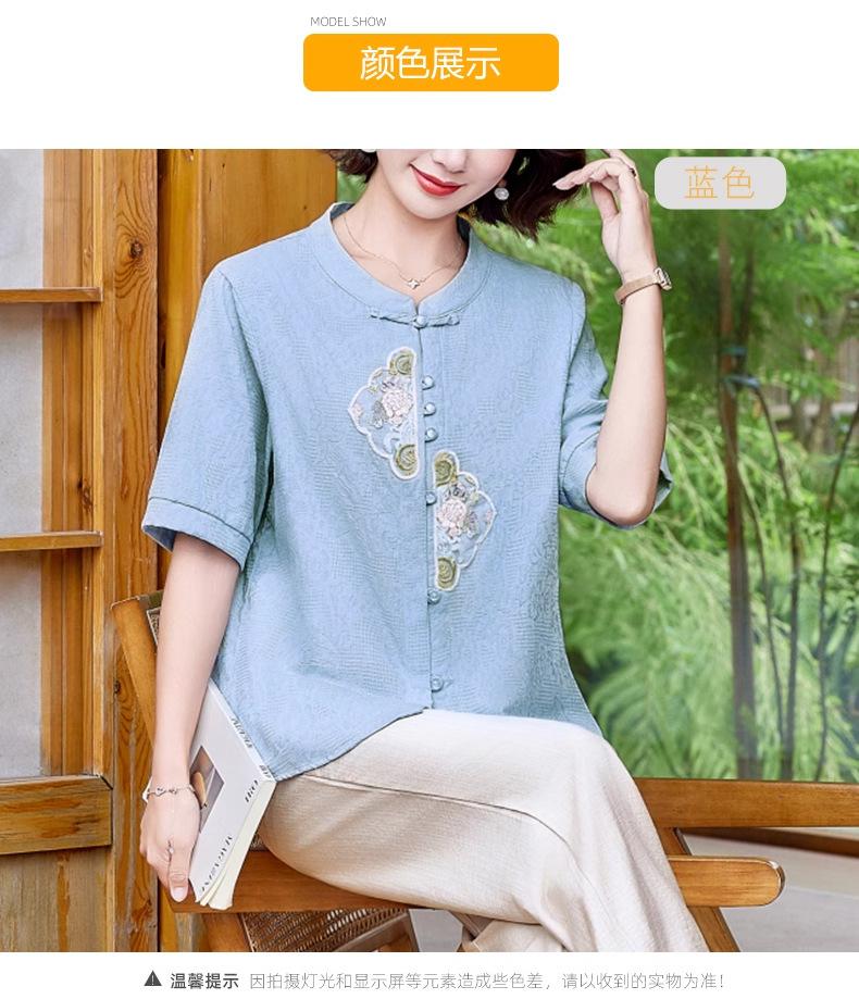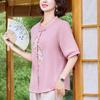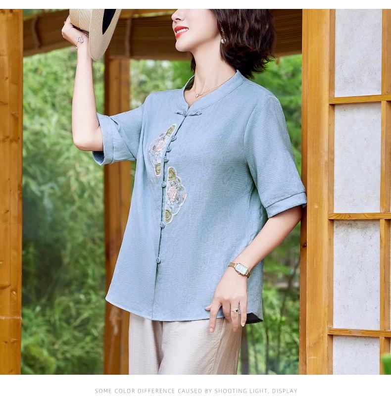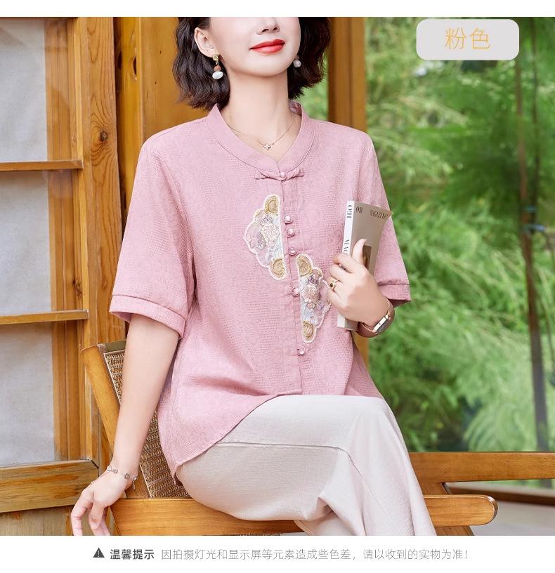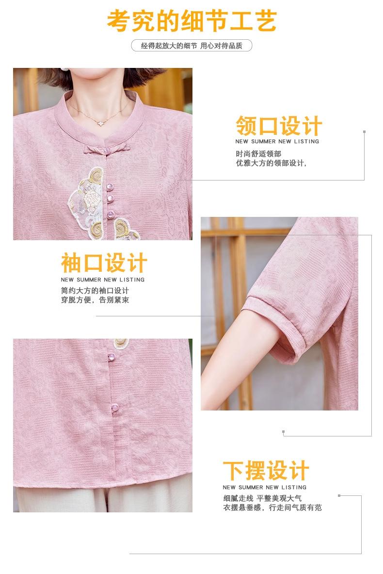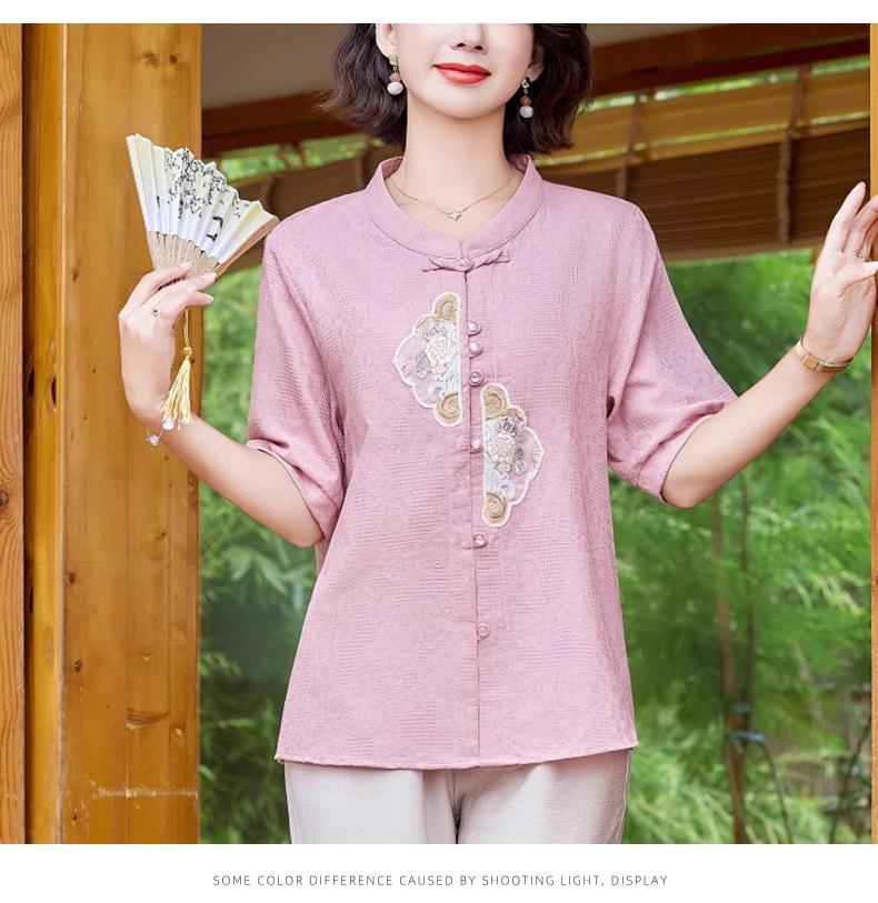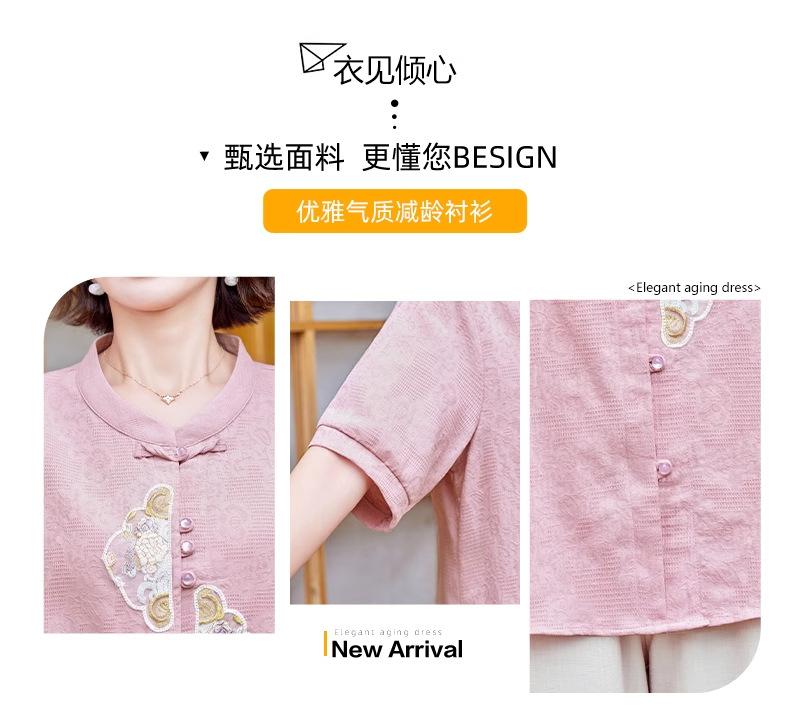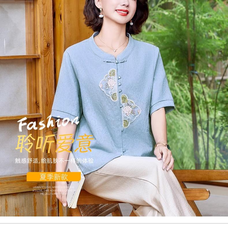 Novo Estilo Verão Conjunto de Camisa de Manga Curta Estilo Chinês para Mulheres de Meia Idade e Idosas, Blusa T-Shirt Elegante e Estilosa, Fina