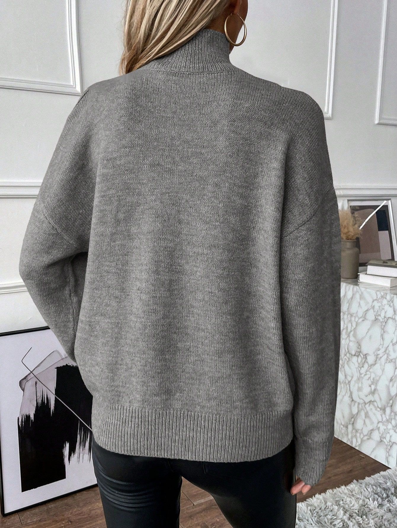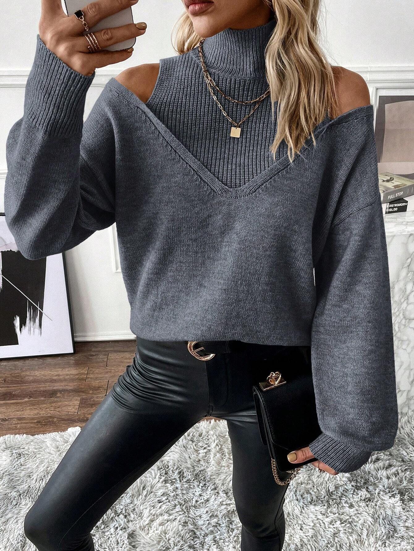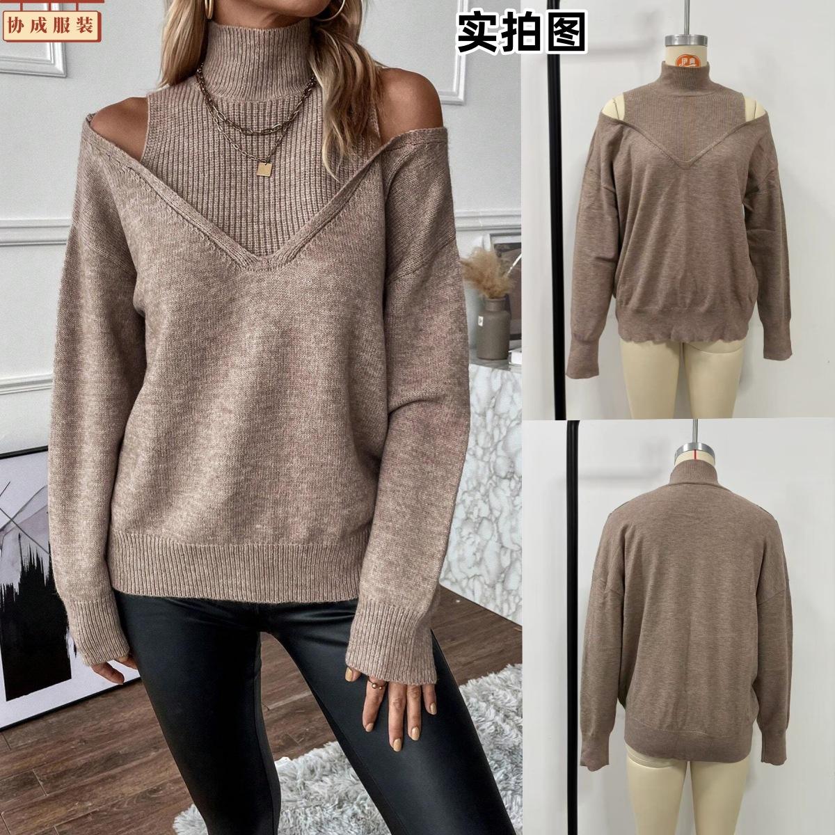 Compre 2025 Amazon Transfronteiriço Europeu e Americano Novo Outono e Inverno Cor Sólida Solto Moda Tricotado Ombro a Ombro Manga Longa Gola Alta Suéter no atacado no Joom.pro