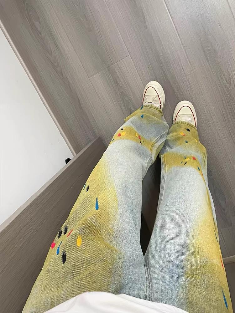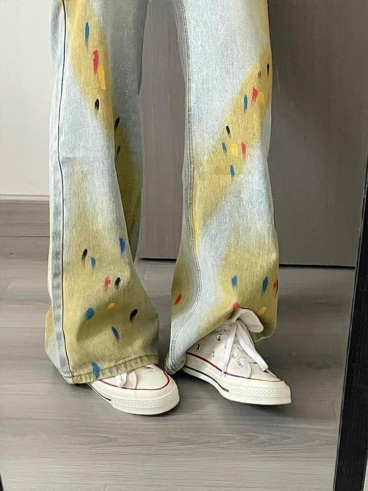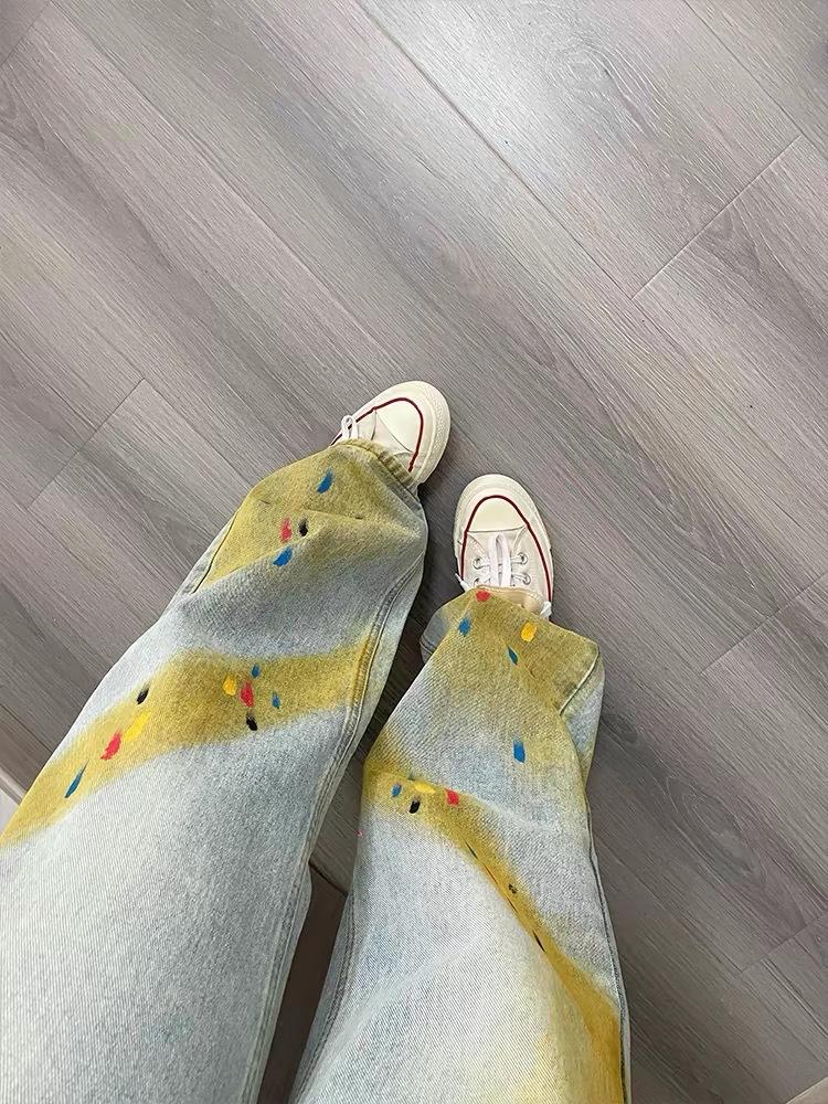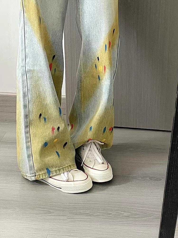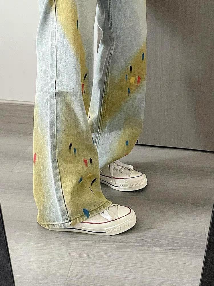 Jeans Feminino Estilo Americano High Street Senso de Design Grafiti Outono e Inverno Novo Solto Perna Reta Perna Larga Casual Calças Compridas