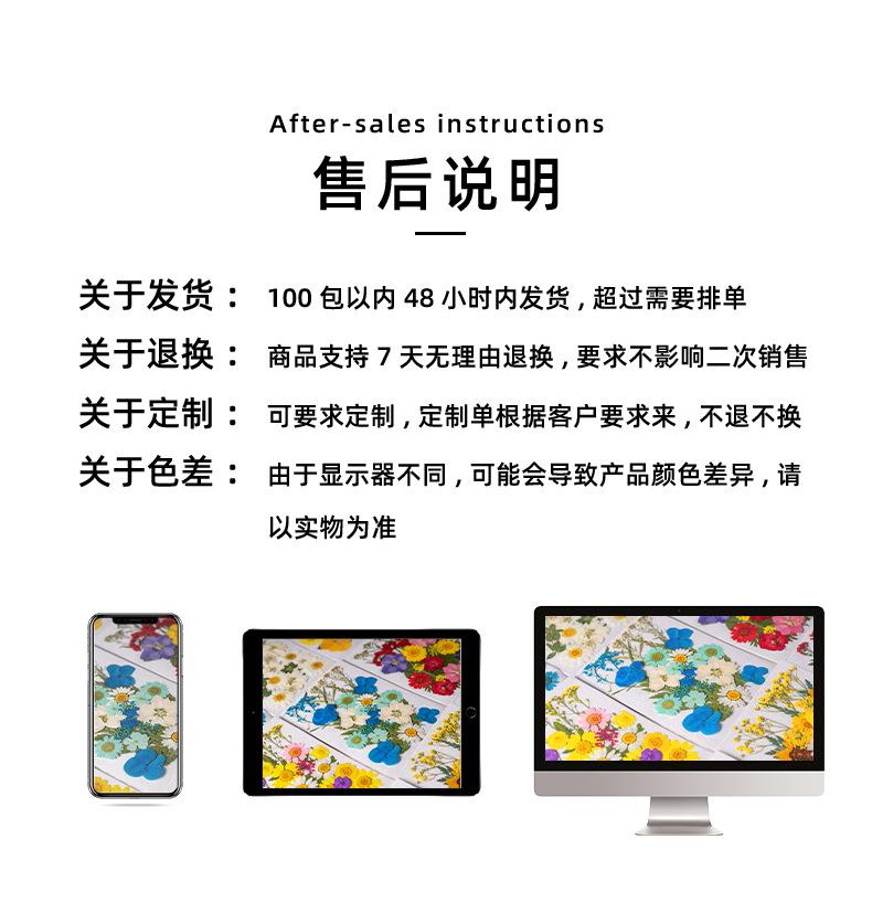1. Nossa loja oferece sete dias de devolução incondicional. Se você não gostar do produto após recebê-lo, não abra a embalagem. Flores secas são frágeis e podem ser facilmente danificadas durante a desembalagem e o transporte, o que afetará as vendas secundárias. Flores secas são facilmente afetadas pela umidade quando expostas ao ar por um longo tempo. Por favor, entenda que flores secas não podem ser devolvidas ou trocadas após a abertura da embalagem.