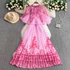 Vestido Blusa Retrô Francês Estampado Gola Redonda para Mulheres Verão Europeu e Americano High-End Emagrecimento da Cintura Saia Longa Plissada
