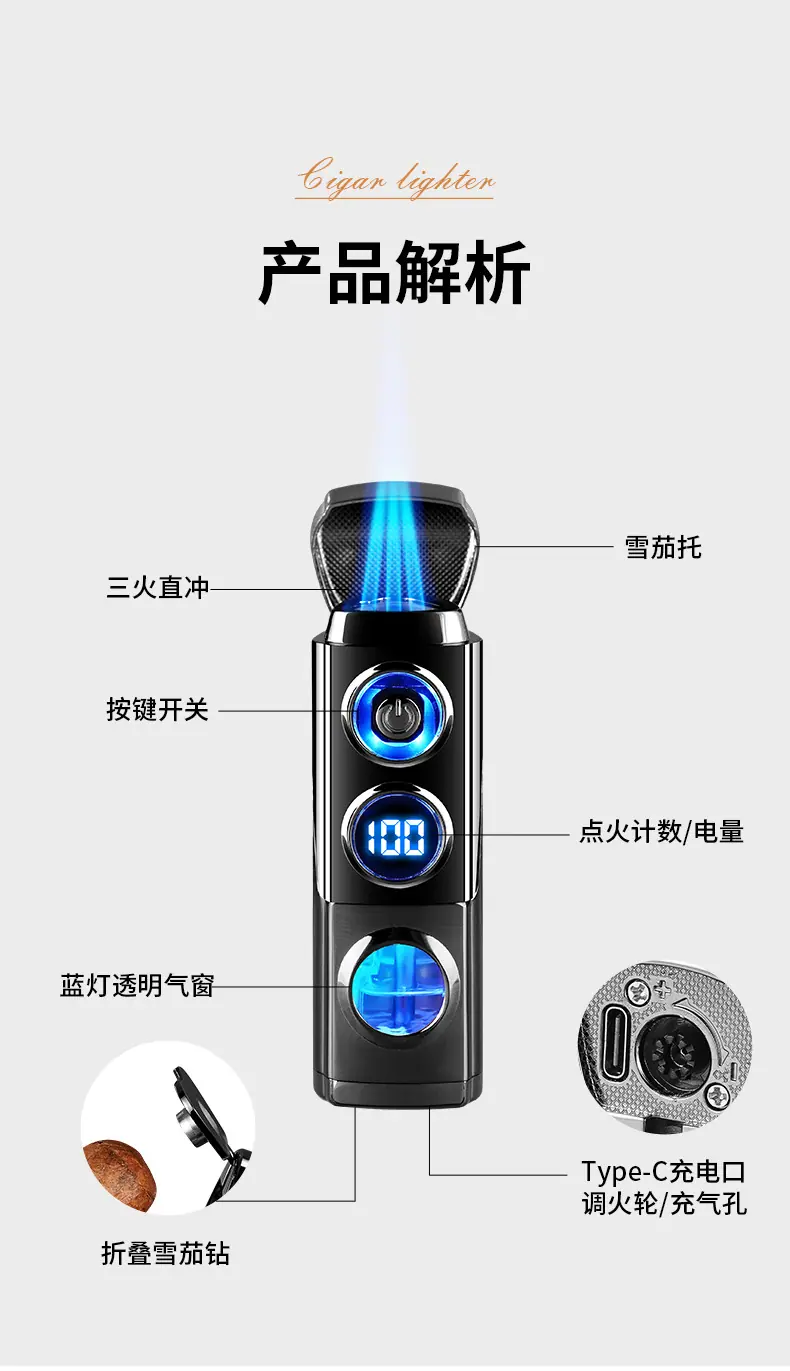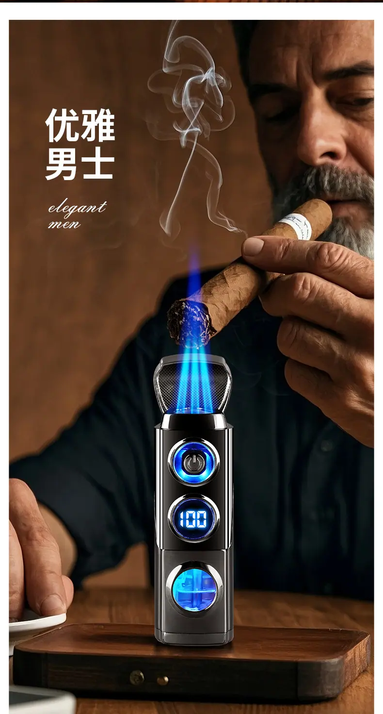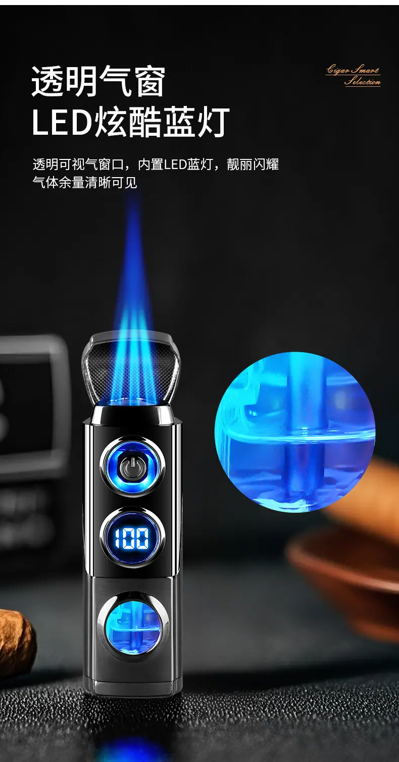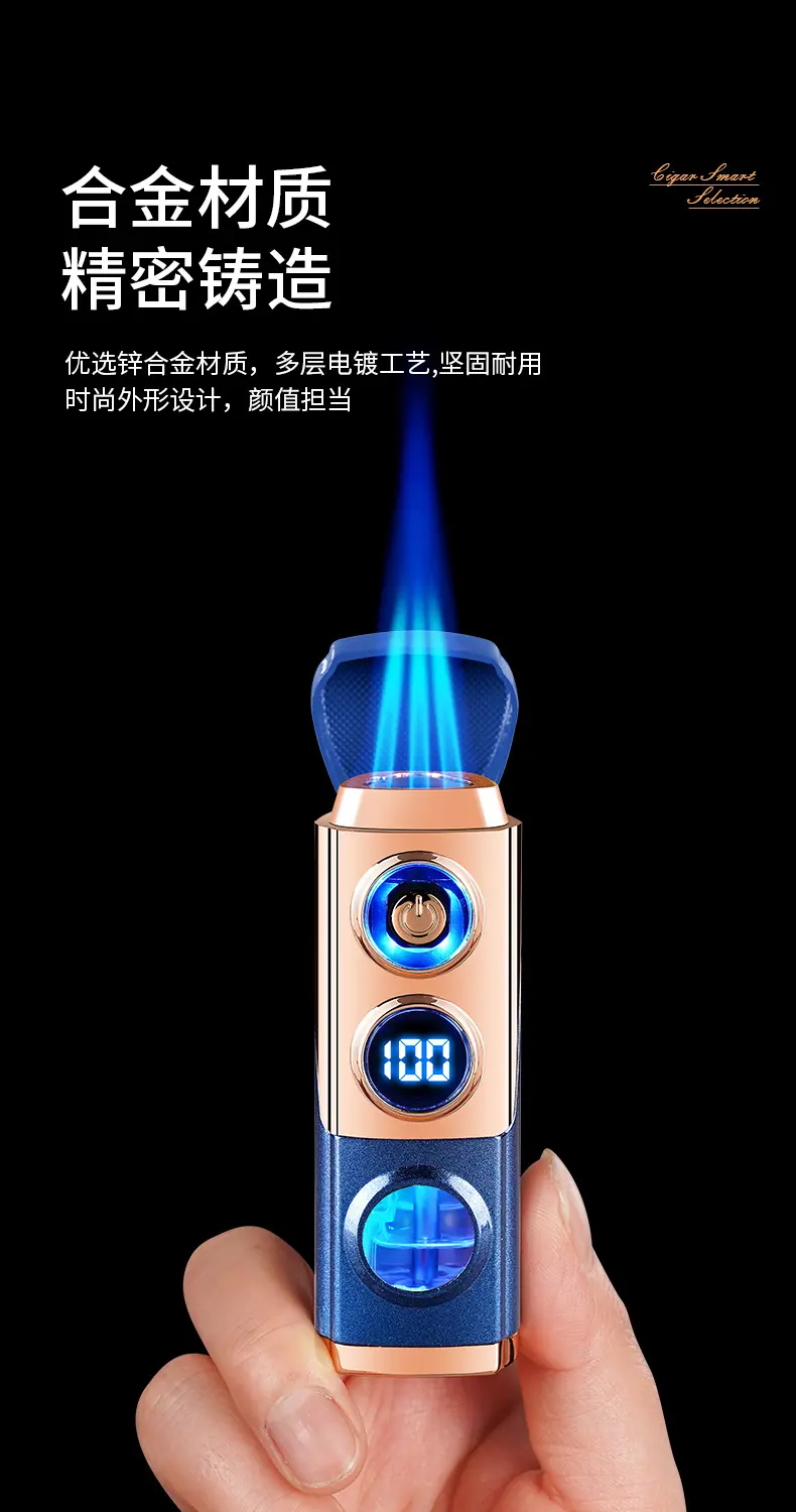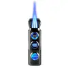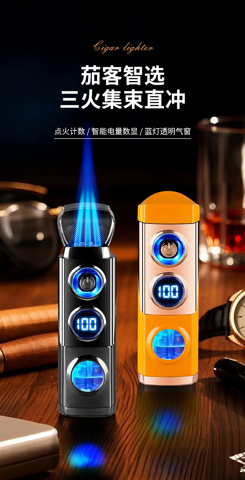 Isqueiro criativo de chama azul direta de três focos para charuto, isqueiro portátil dois em um a gás e elétrico para coleta de fogo, atacado