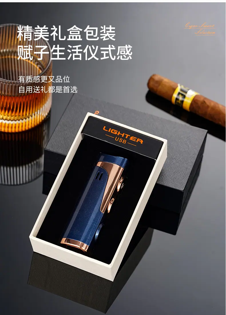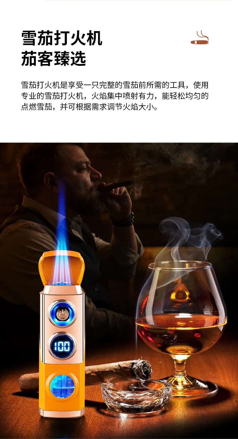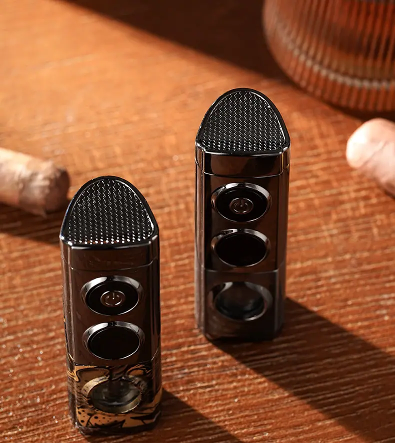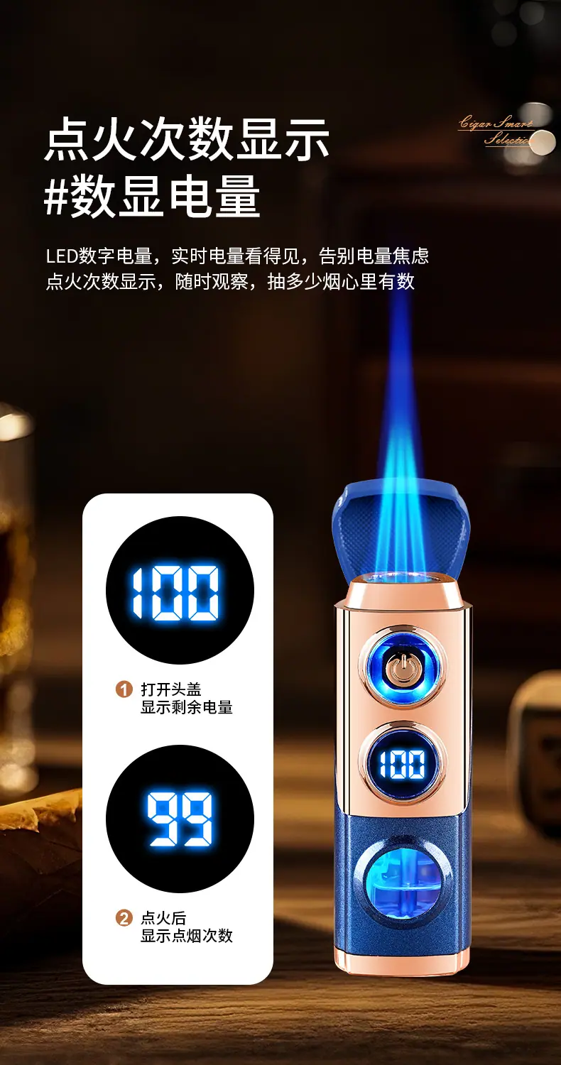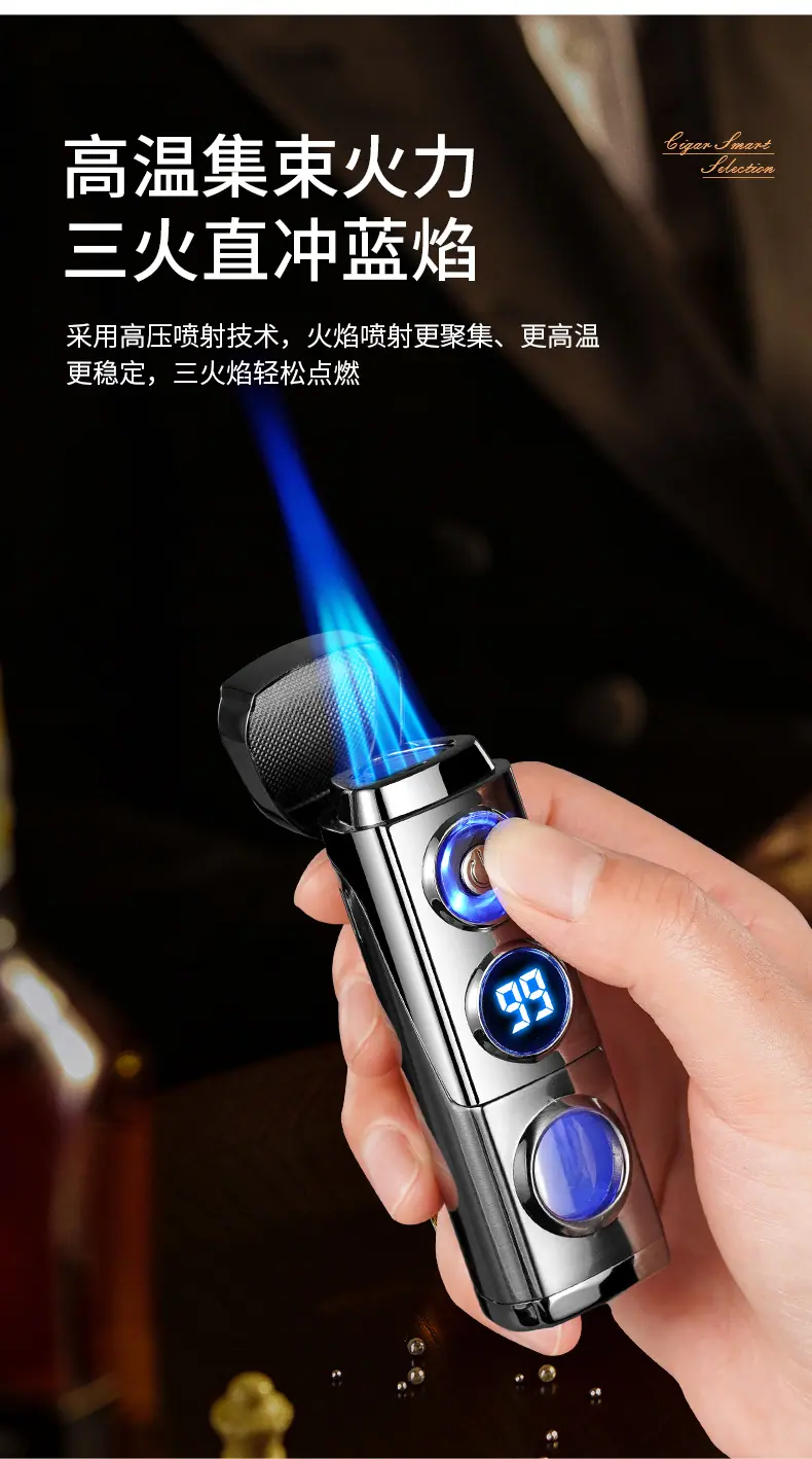 Isqueiro criativo de chama azul direta de três focos para charuto, isqueiro portátil dois em um a gás e elétrico para coleta de fogo, atacado