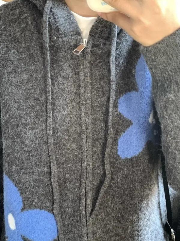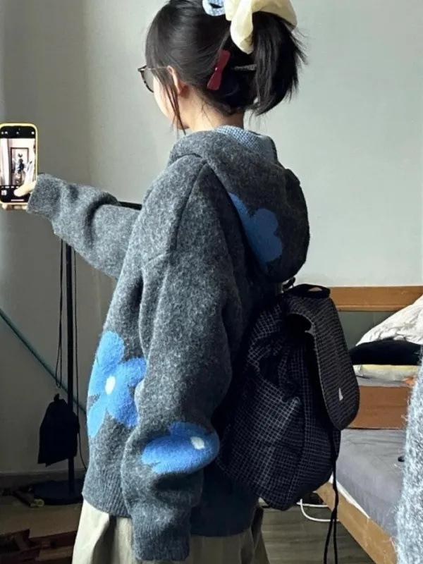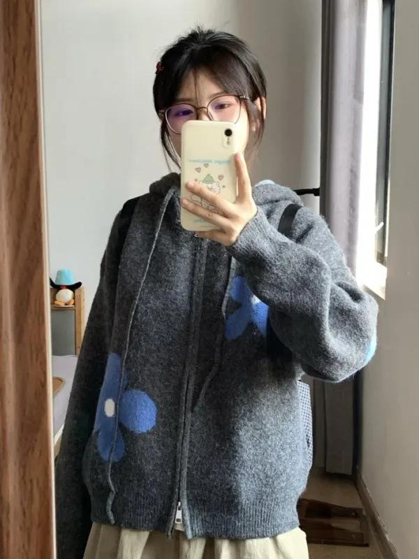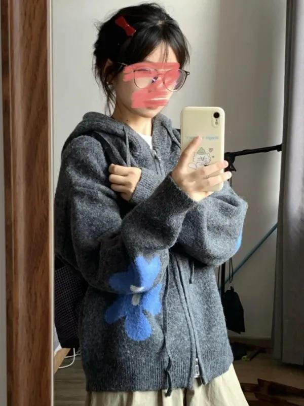 2025 Cinza Novo Zíper Retrô Contraste Casaco Suéter com Capuz Preguiçoso Solto Tricotado Cardigã Top