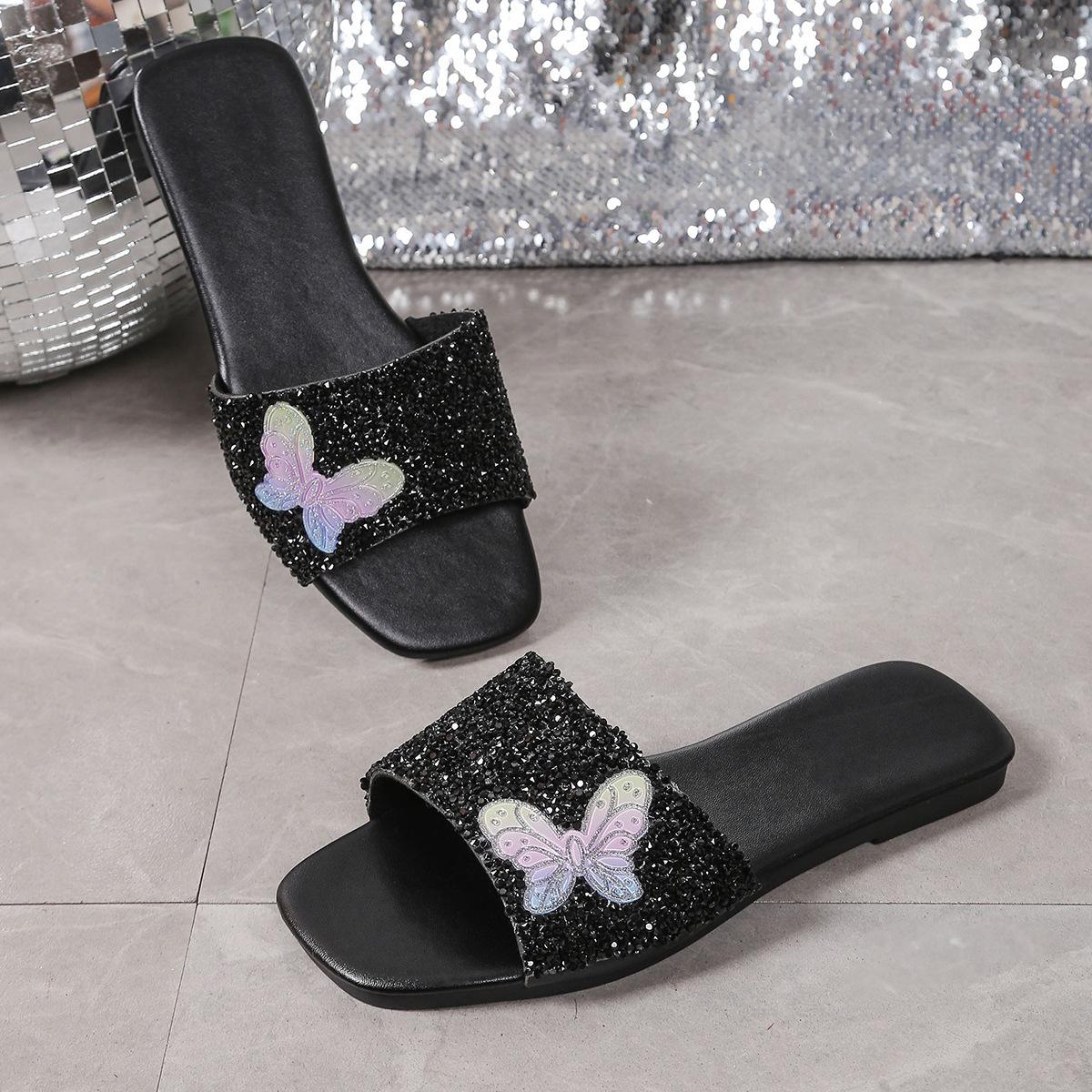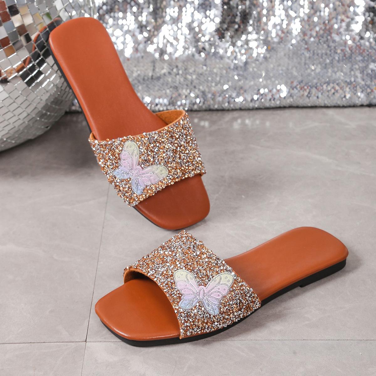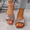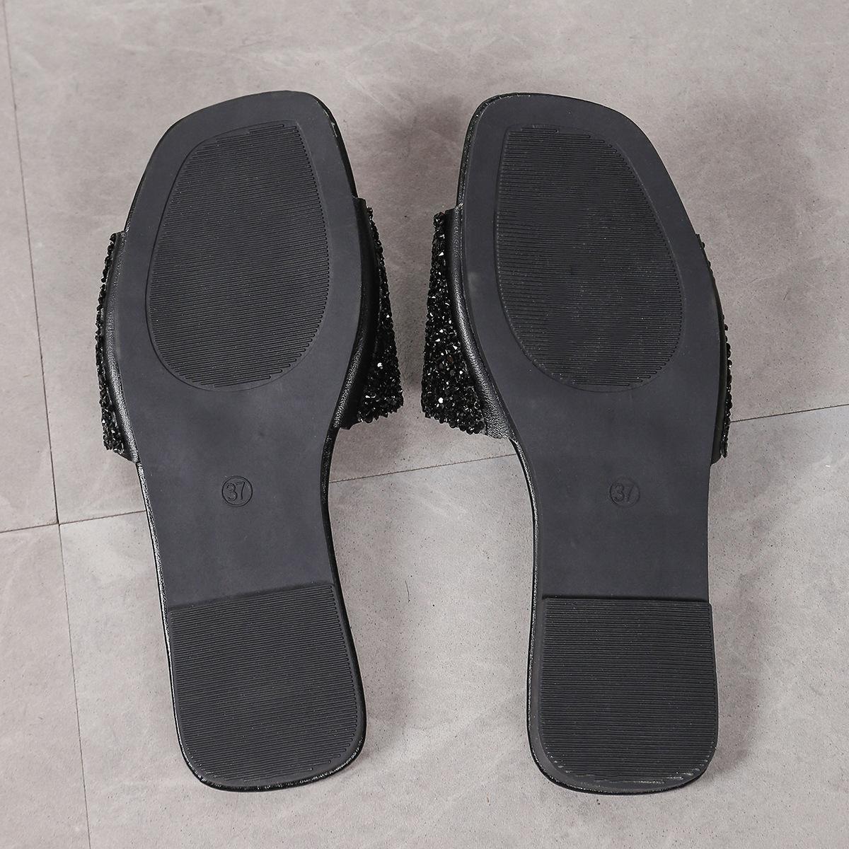 Sandálias Rasteirinhas de Praia Femininas para Comércio Exterior, 2025 Novo Bico Quadrado Transfronteiriças Tamanho Grande Confortáveis Versáteis Sandálias de Strass