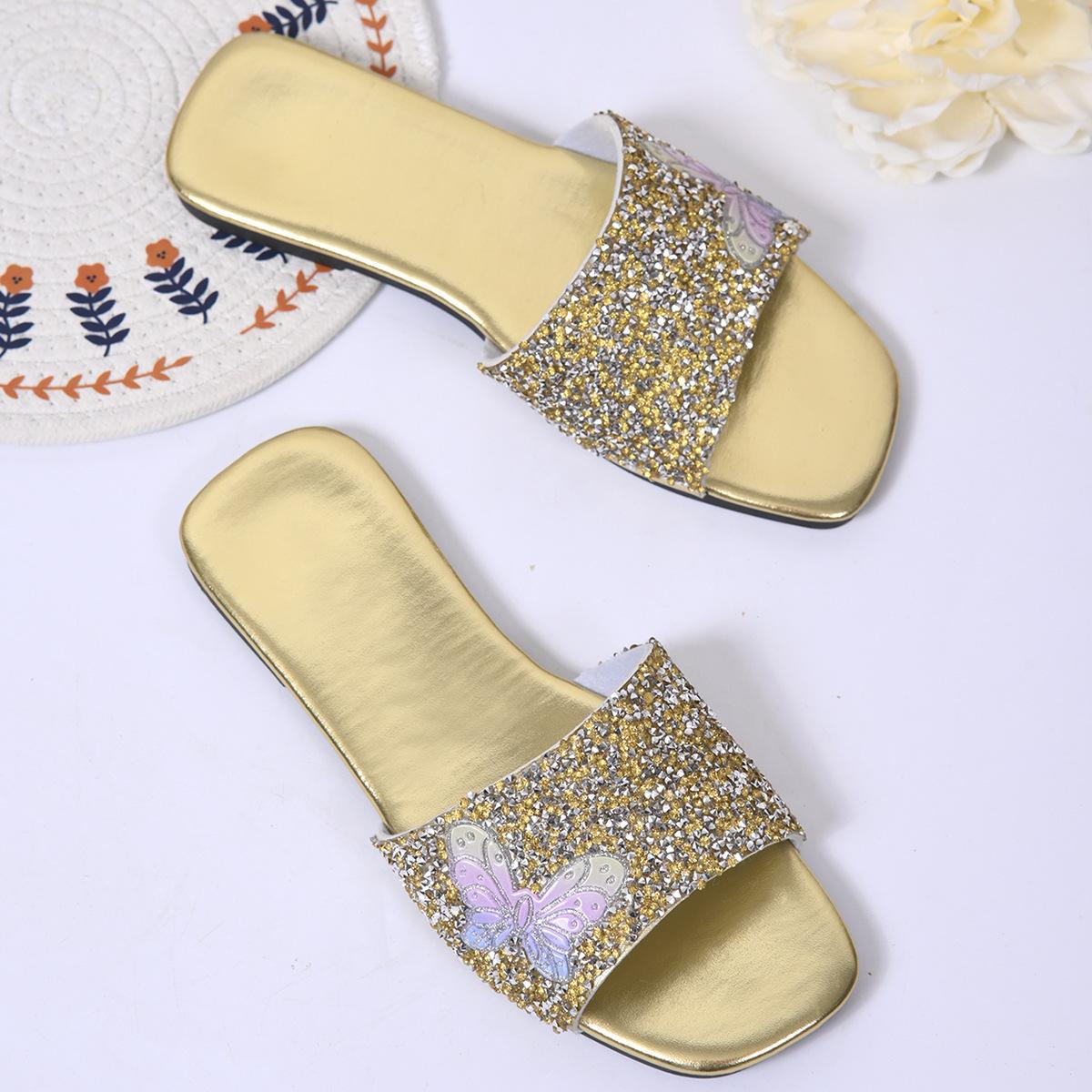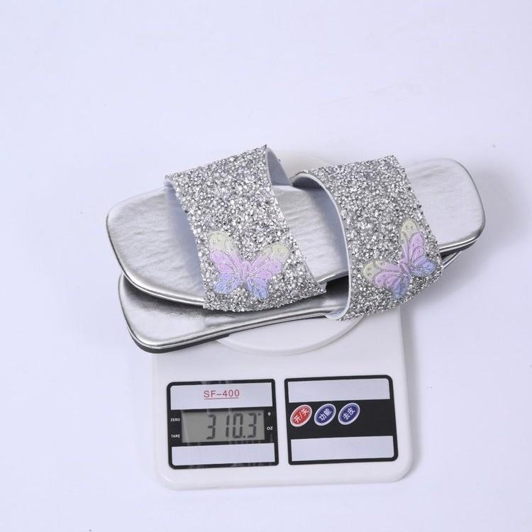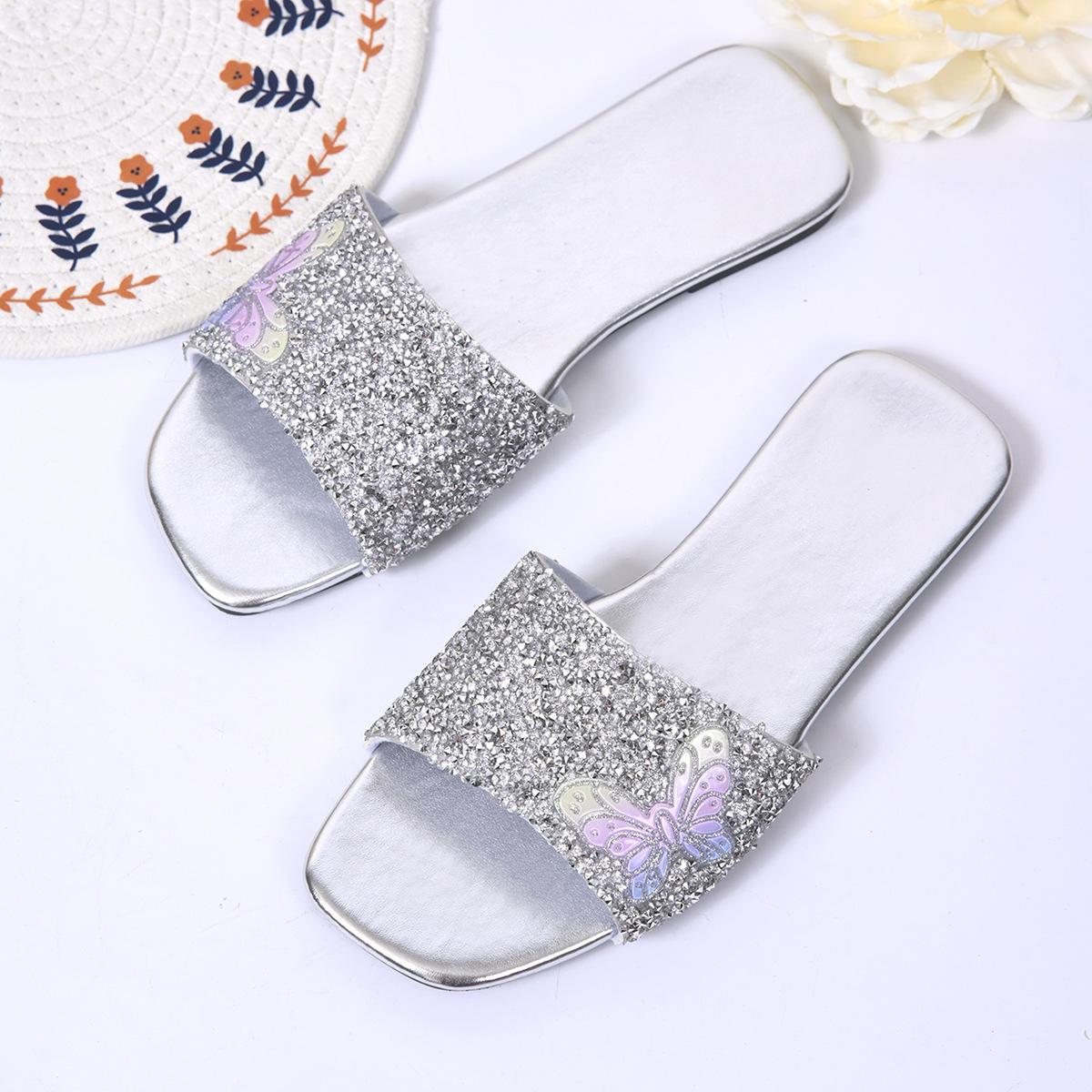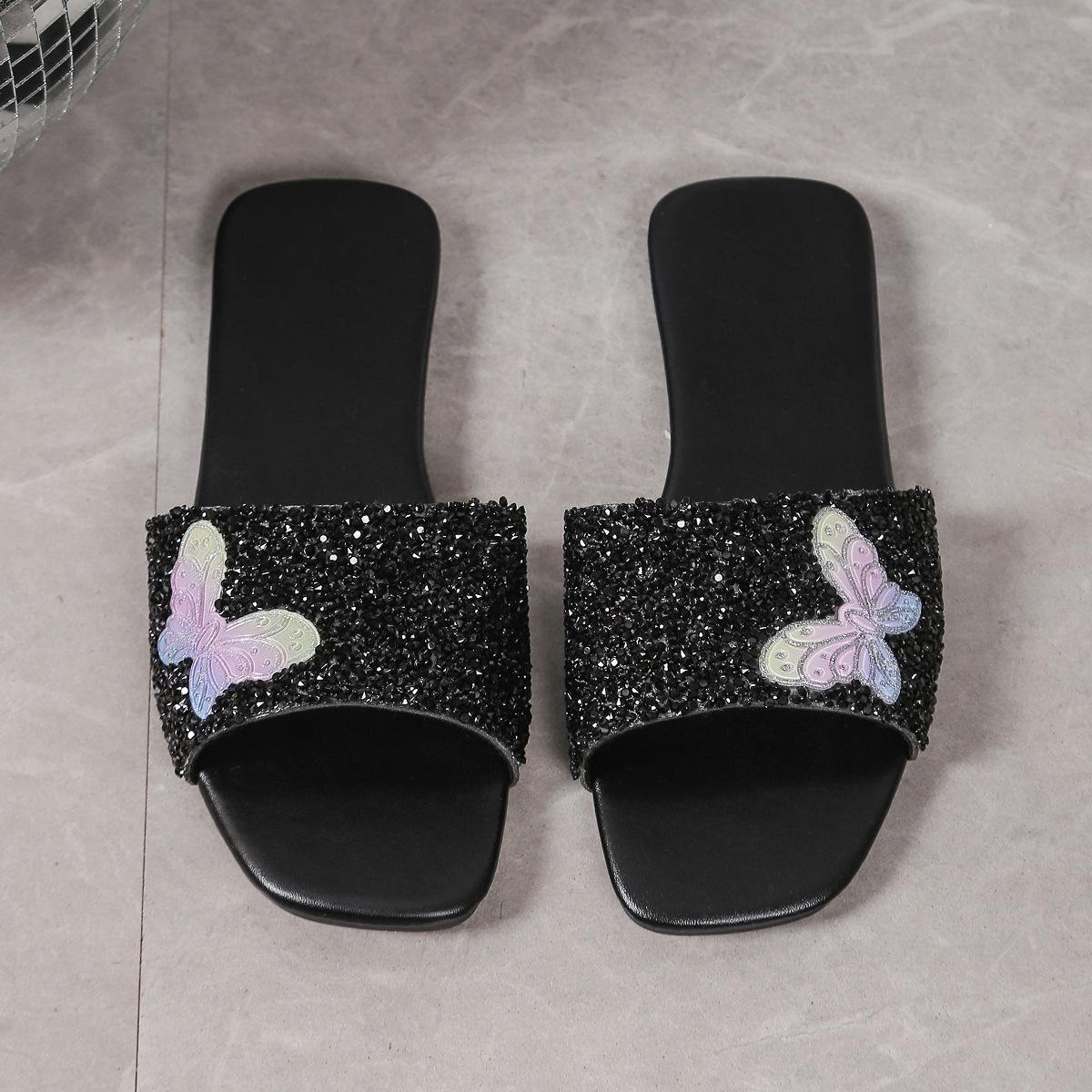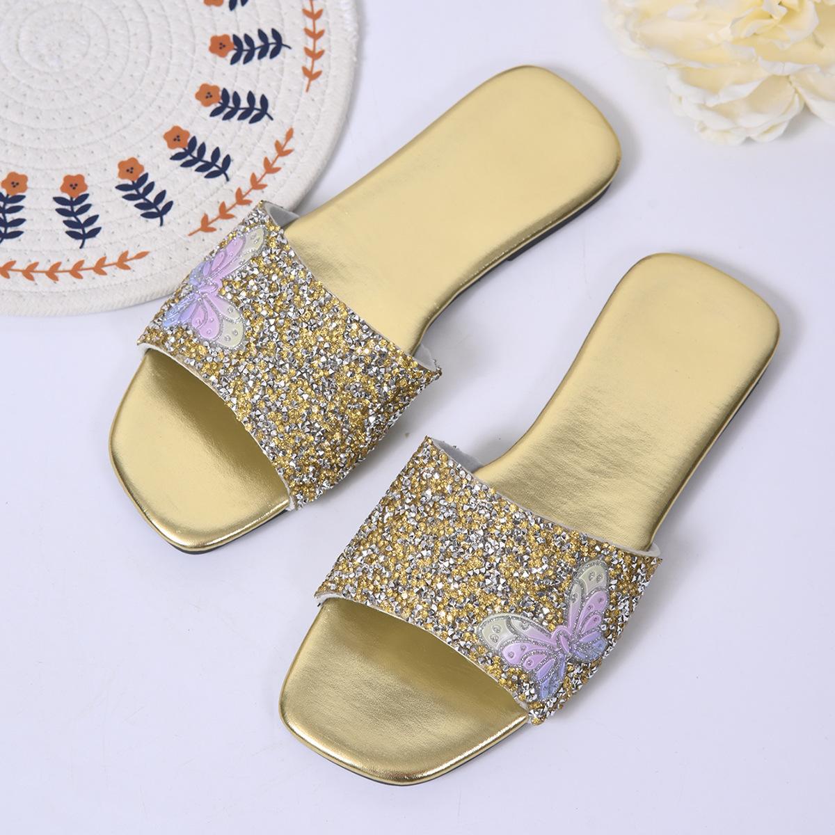 Sandálias Rasteirinhas de Praia Femininas para Comércio Exterior, 2025 Novo Bico Quadrado Transfronteiriças Tamanho Grande Confortáveis Versáteis Sandálias de Strass