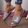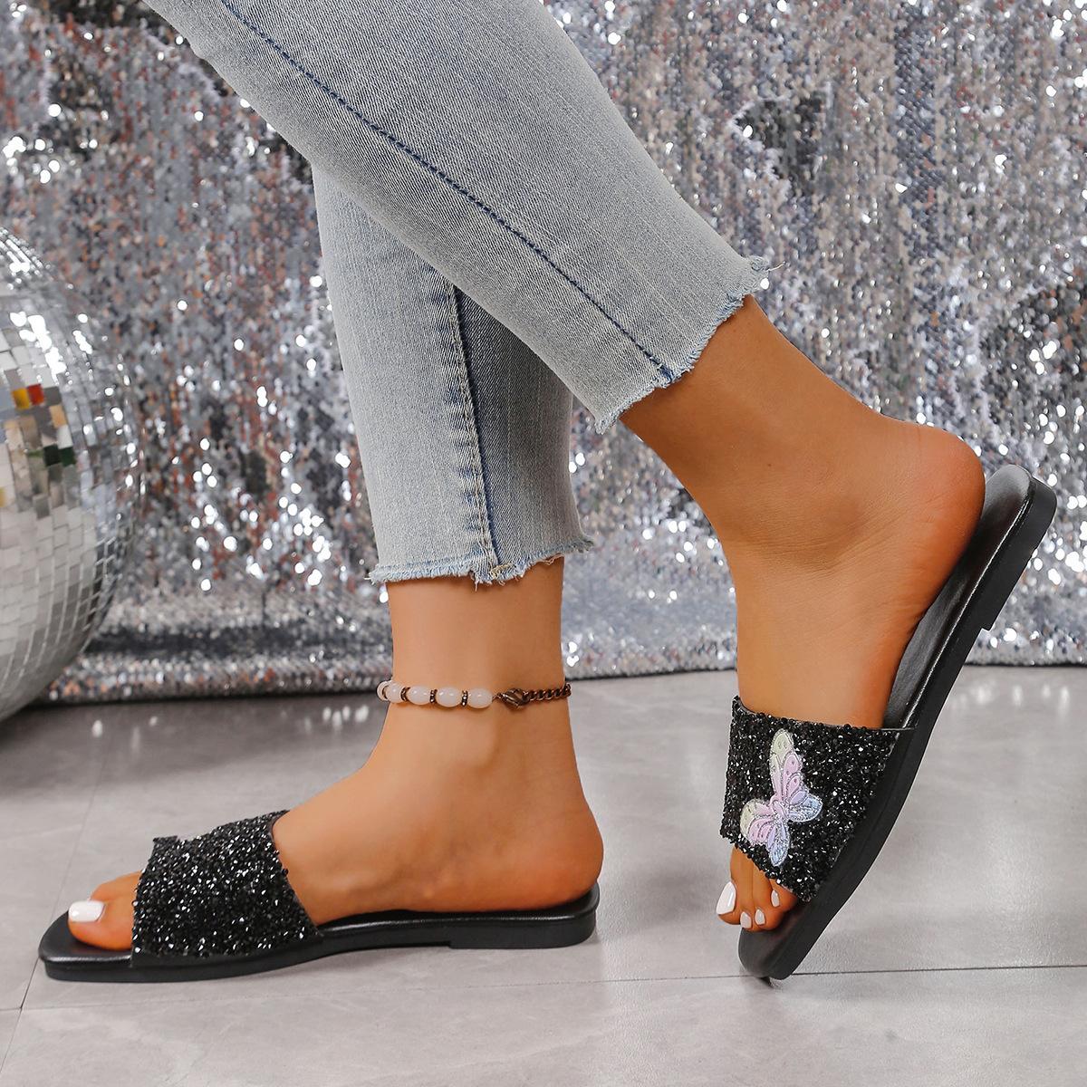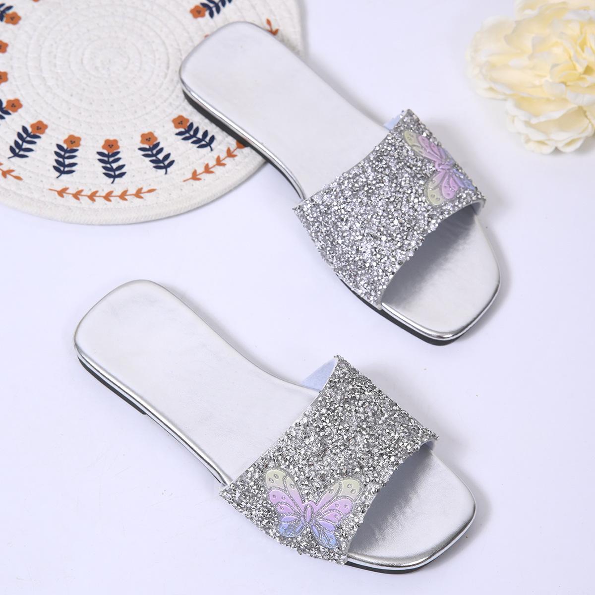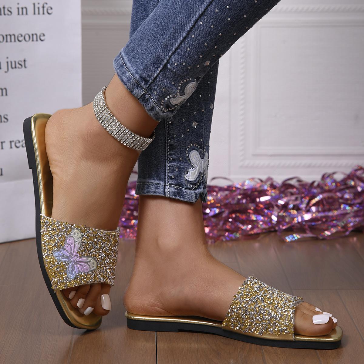 Sandálias Rasteirinhas de Praia Femininas para Comércio Exterior, 2025 Novo Bico Quadrado Transfronteiriças Tamanho Grande Confortáveis Versáteis Sandálias de Strass