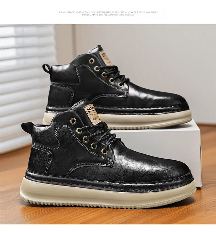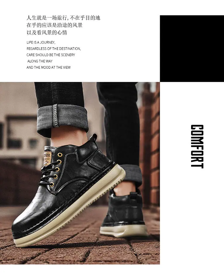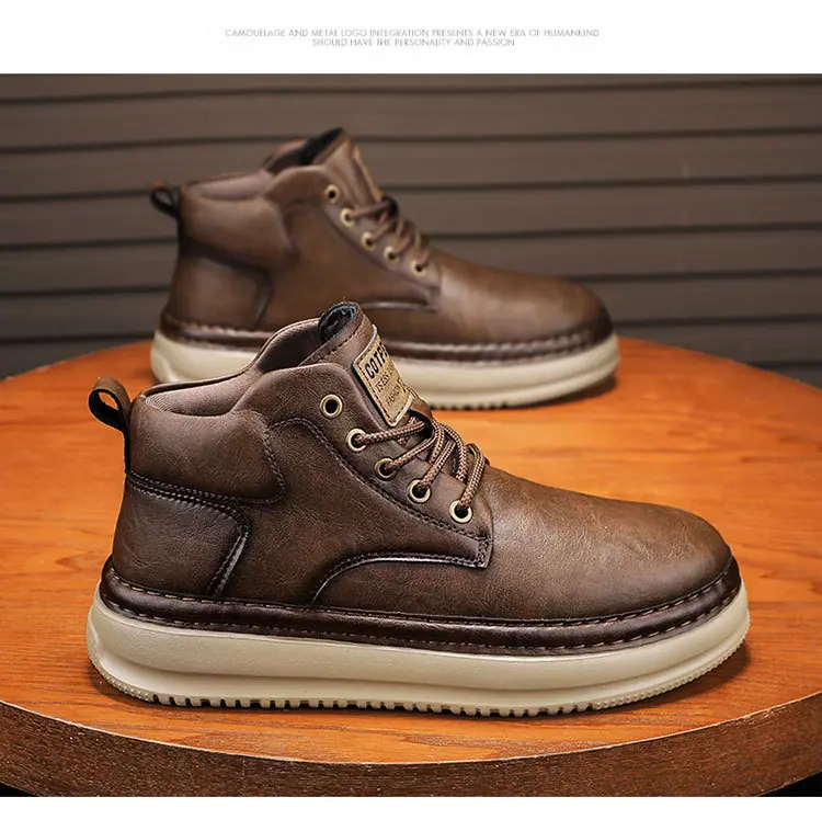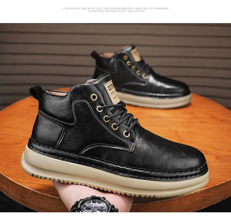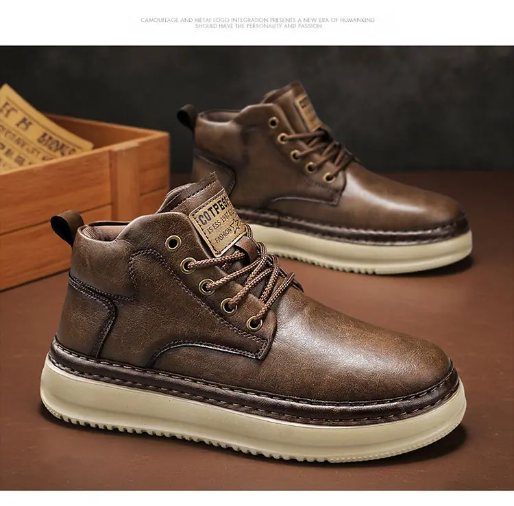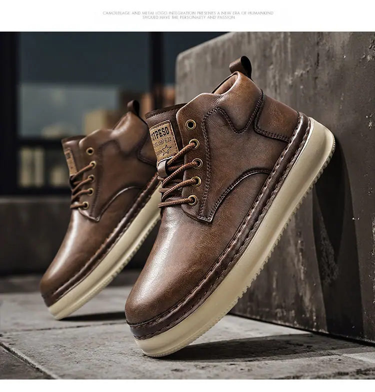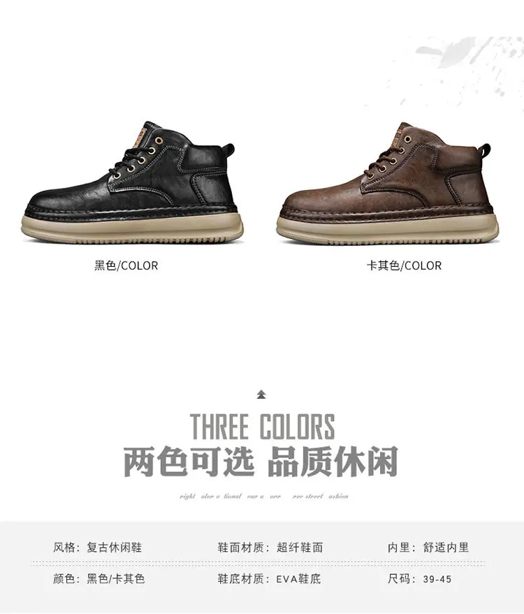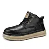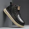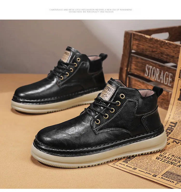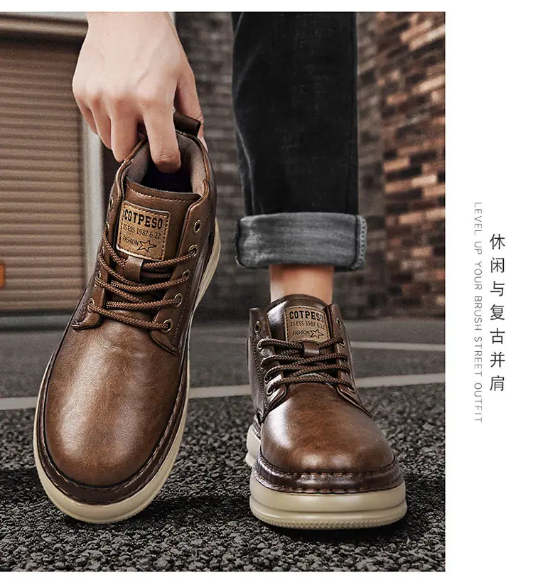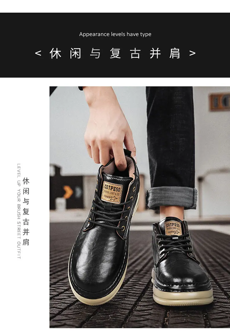 Botas Masculinas 2025 Novas Flat Leves Versáteis Botas de Couro Simples Retrô Cano Médio Botas Martin Masculinas Casuais para Trabalho