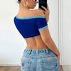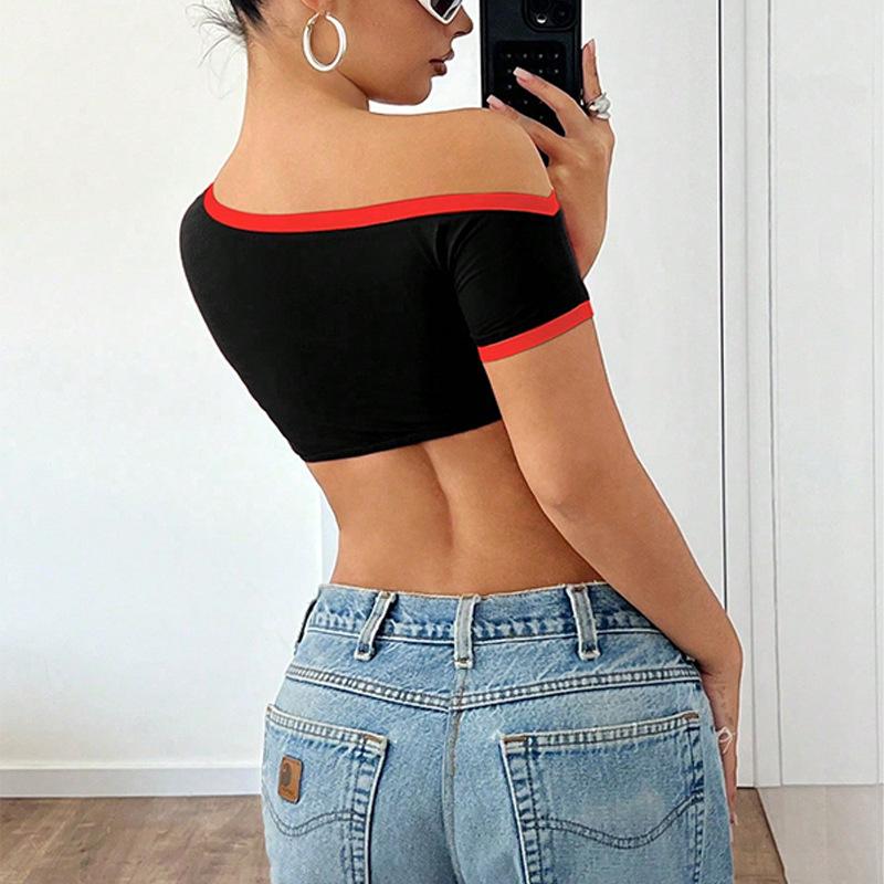 Europeu e Americano Transfronteiriço Sexy Hot Girl Feminino Assimétrico Ombro Inclinado Umbigo Exposto Estampa de Letras Contrastantes Camiseta Ultracurta de Manga Curta