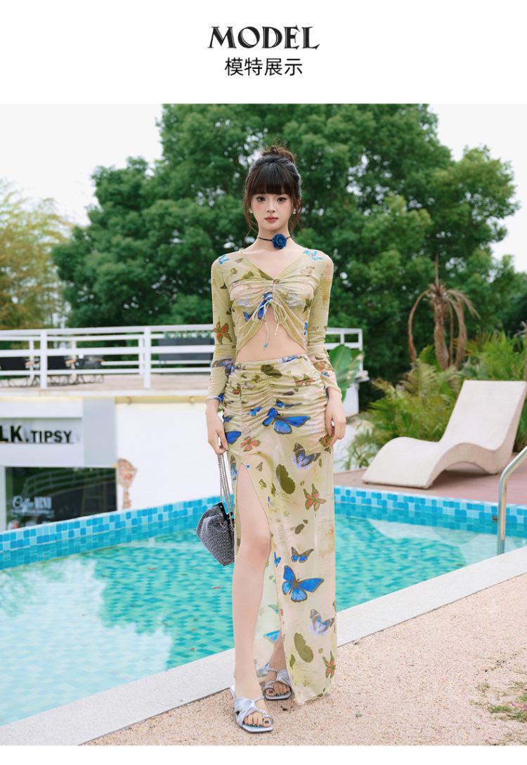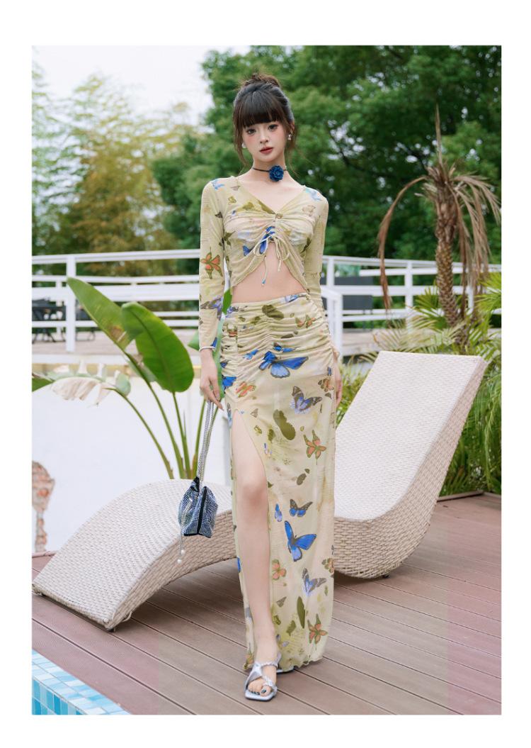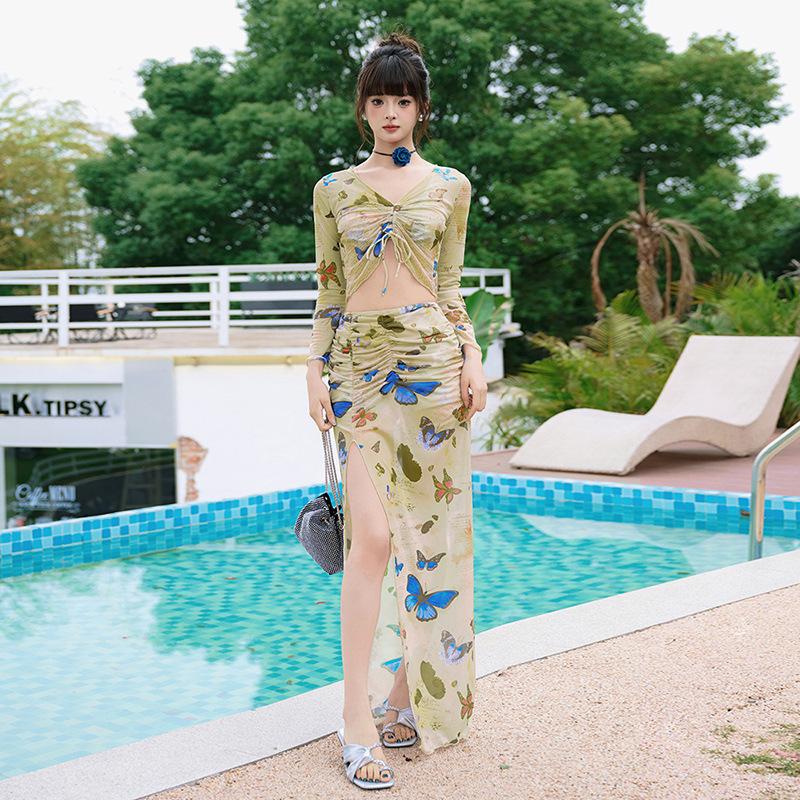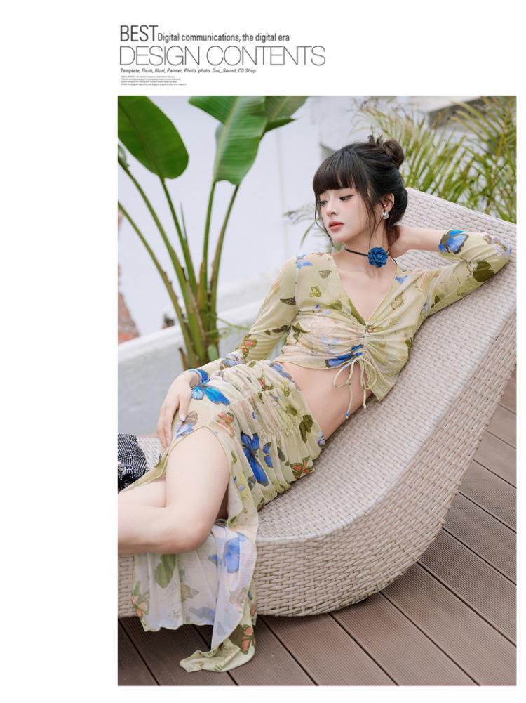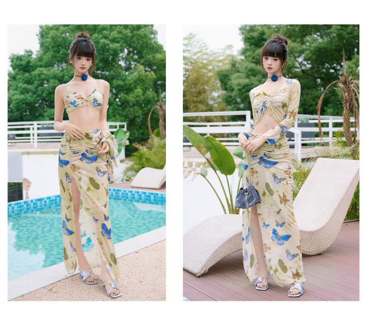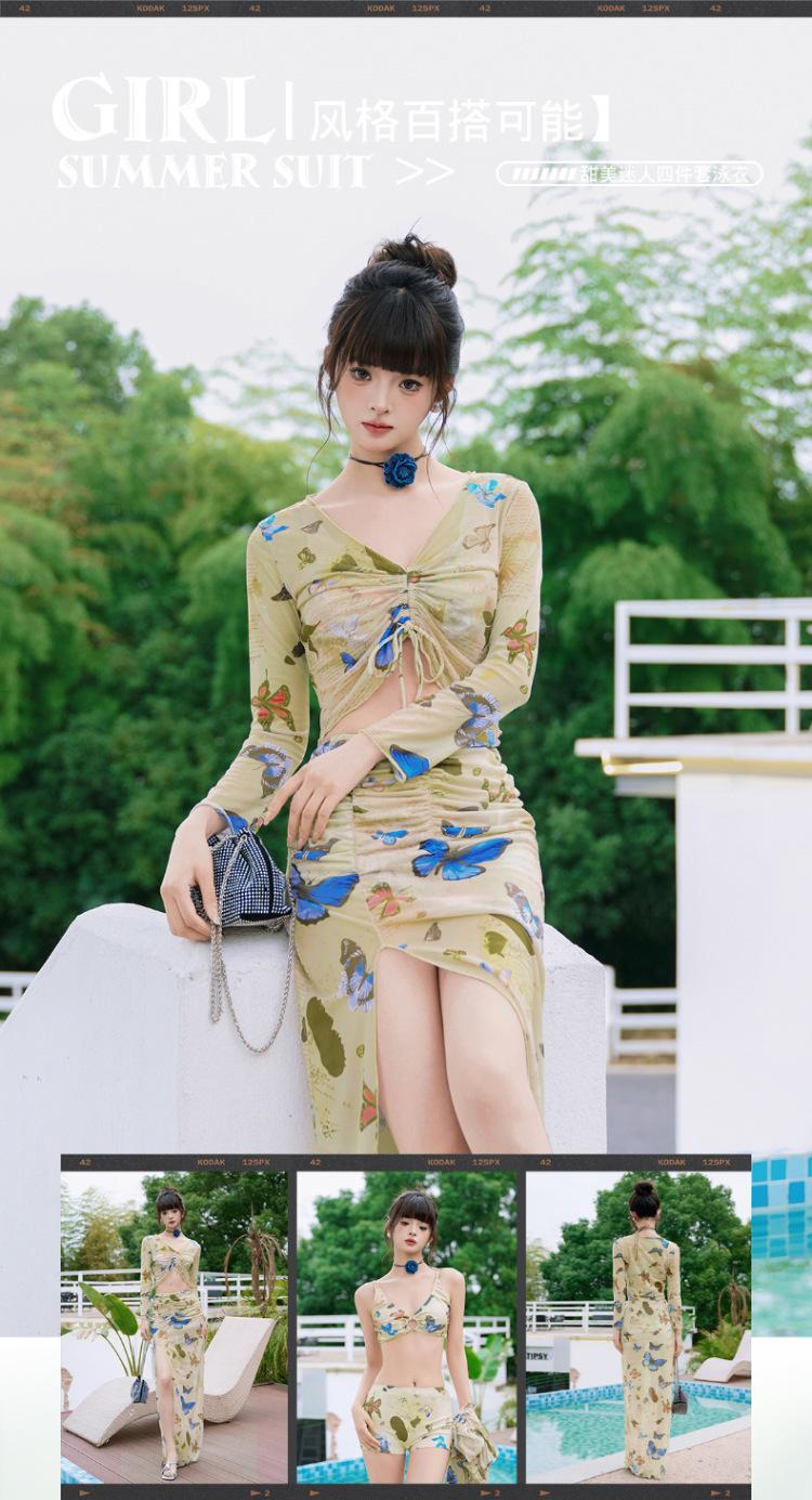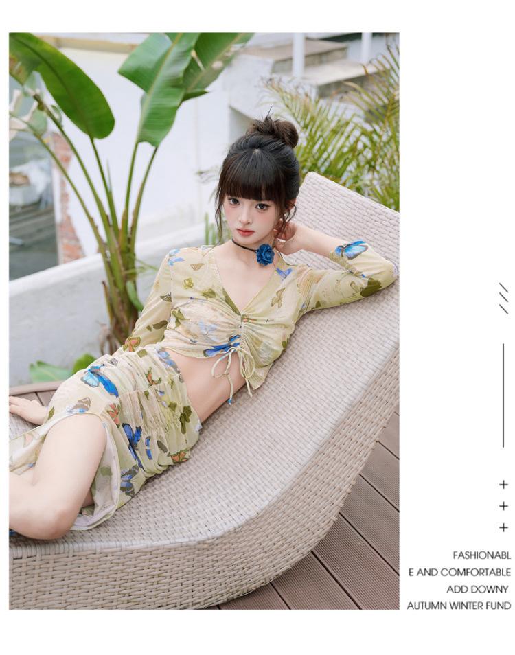 Biquíni Sexy Pure Desire Plus Size Estampado Manga Longa Saia Longa Conjunto de Quatro Peças Saia Plissada Cobre Cintura e Quadril Fato de Banho Feminino para Gordinhas