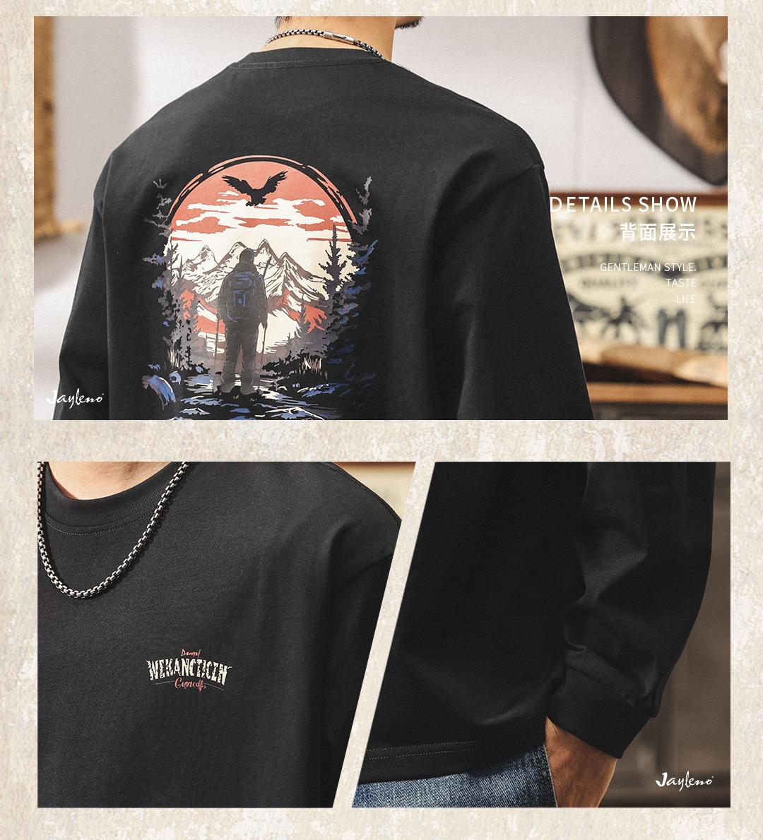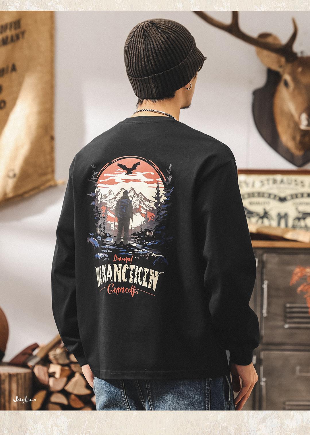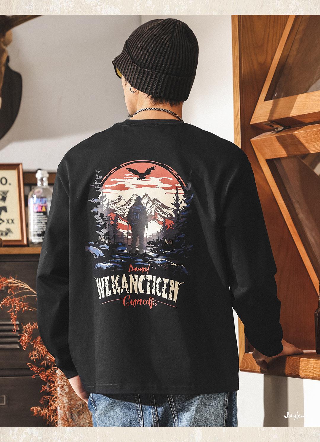 Camiseta Masculina Outdoor Manga Longa Estilo Montanha Americana 2025 Nova Tendência 300g Pesada Solta Plus Size Outono Top Masculino
