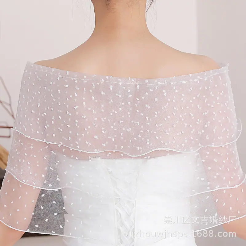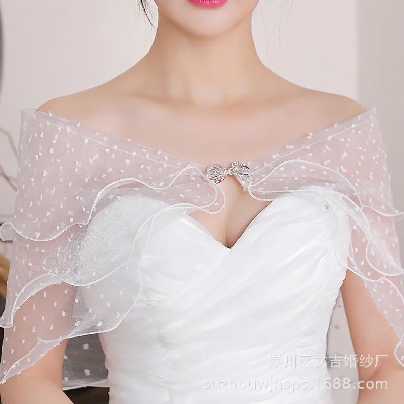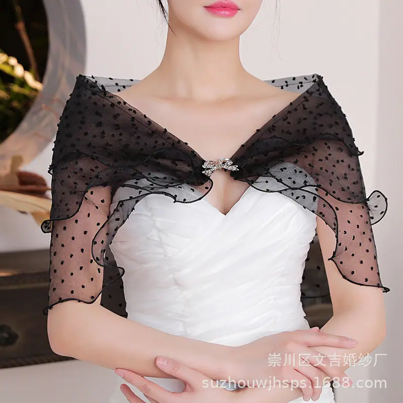 Xale de Vestido de Noiva Europeu e Americano Renda de Casamento Preto e Branco Bolinhas Laço Fivela de Diamante Tule Poncho