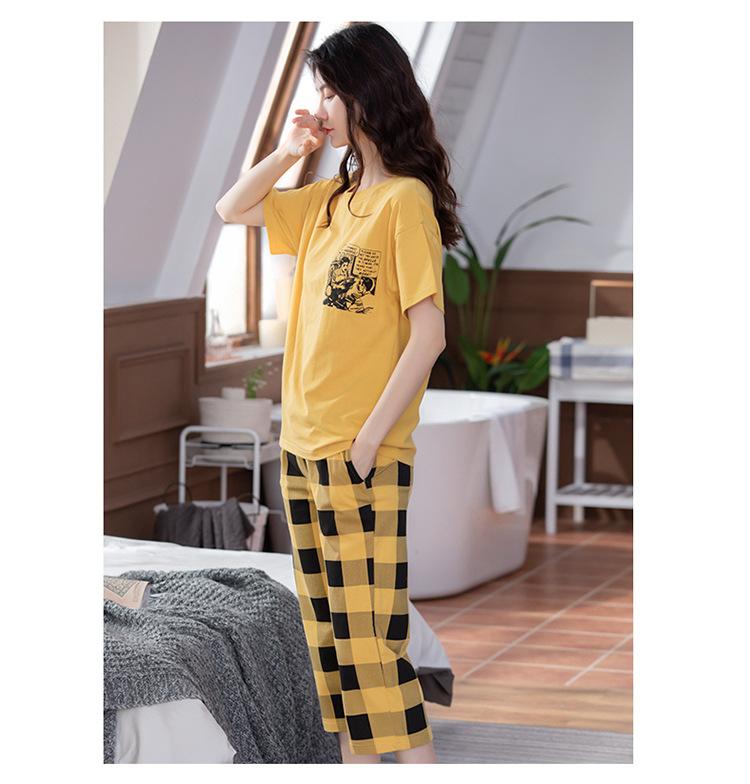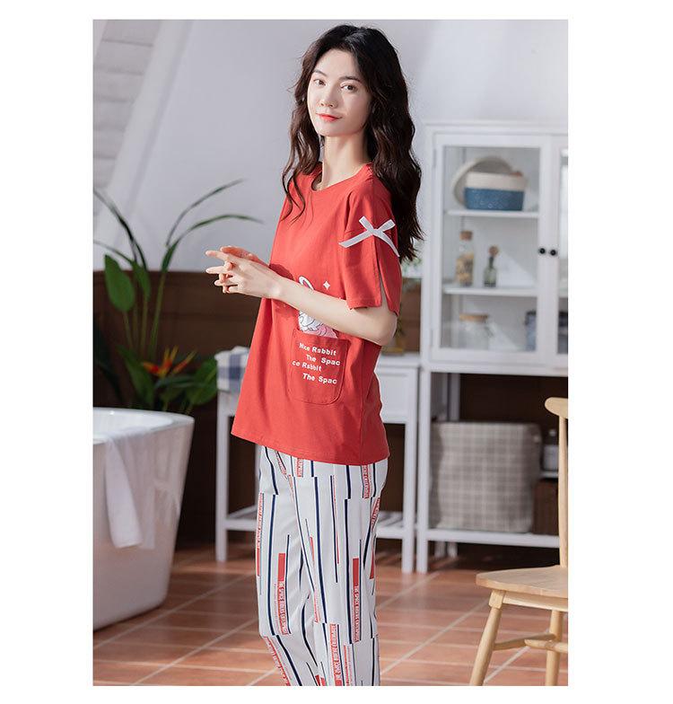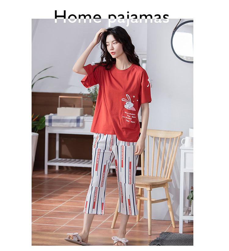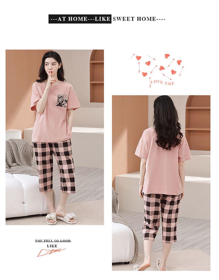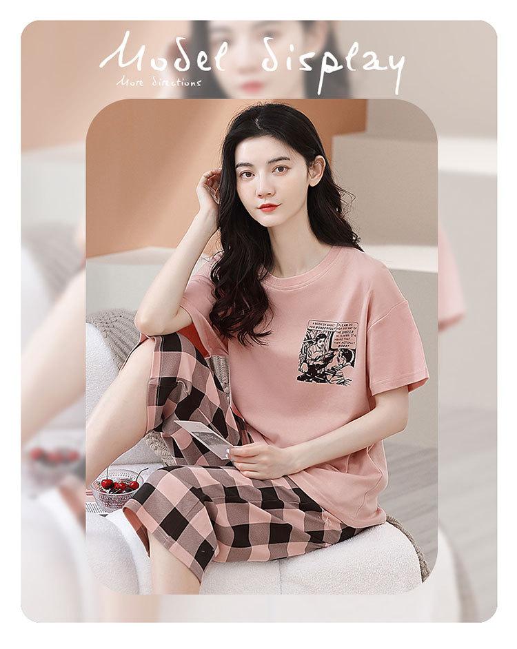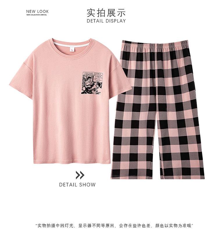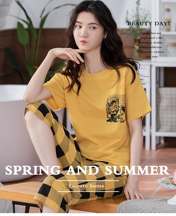 Compre Algodão Fino Roupa de Casa Duas Peças Casual Pulôver Gola Redonda Manga Curta Calças Cropped Pijama Feminino Verão Doce Novo Estilo no atacado no Joom.pro