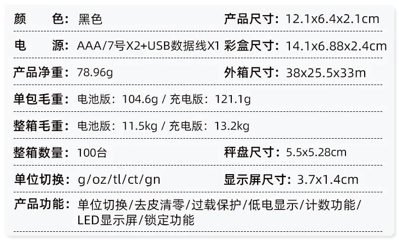 Funções do produto: comutação de unidade/limpeza de tara/proteção contra sobrecarga/display de bateria fraca/função de contagem/display LED/função de bloqueio