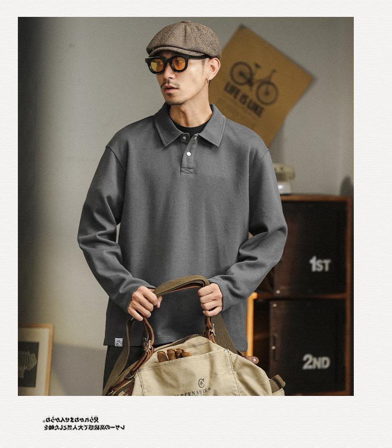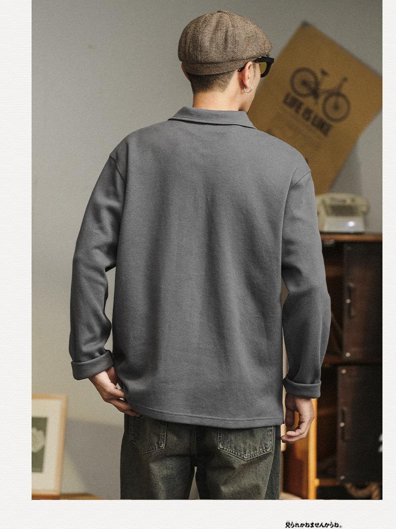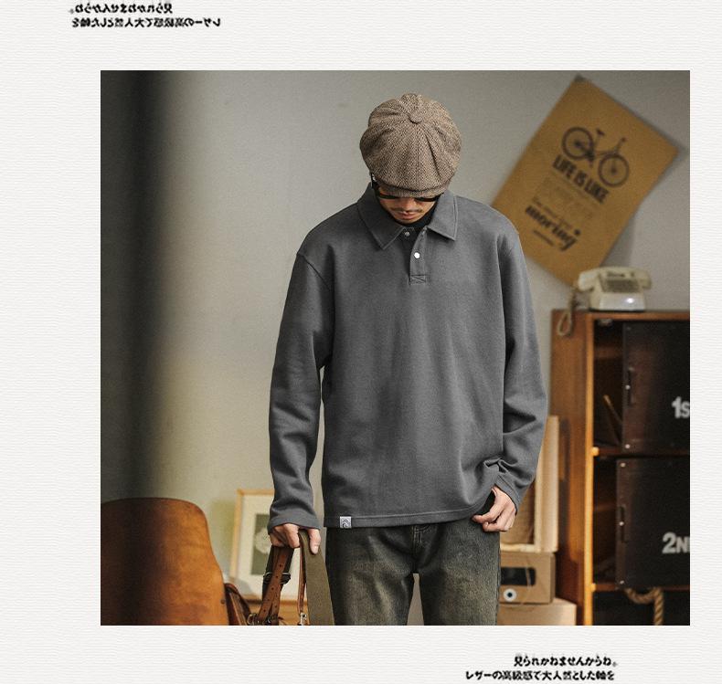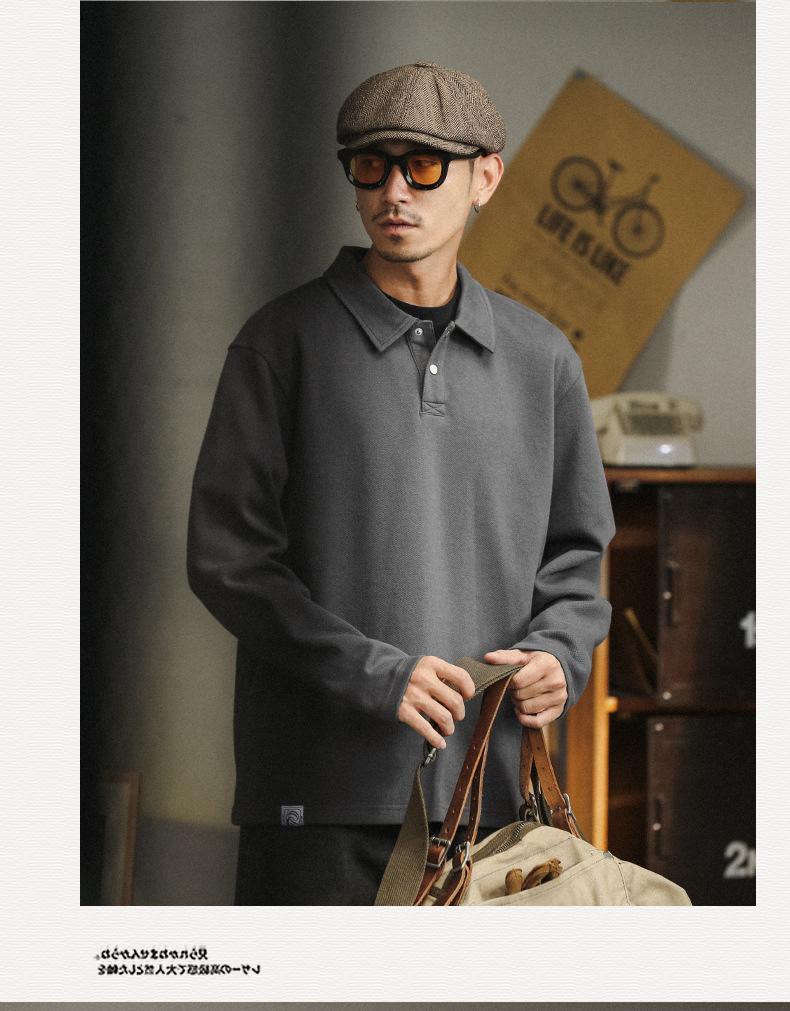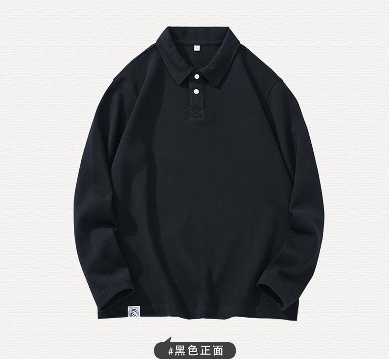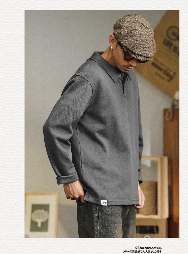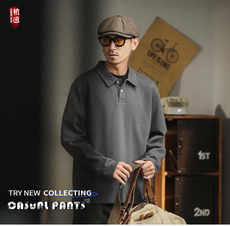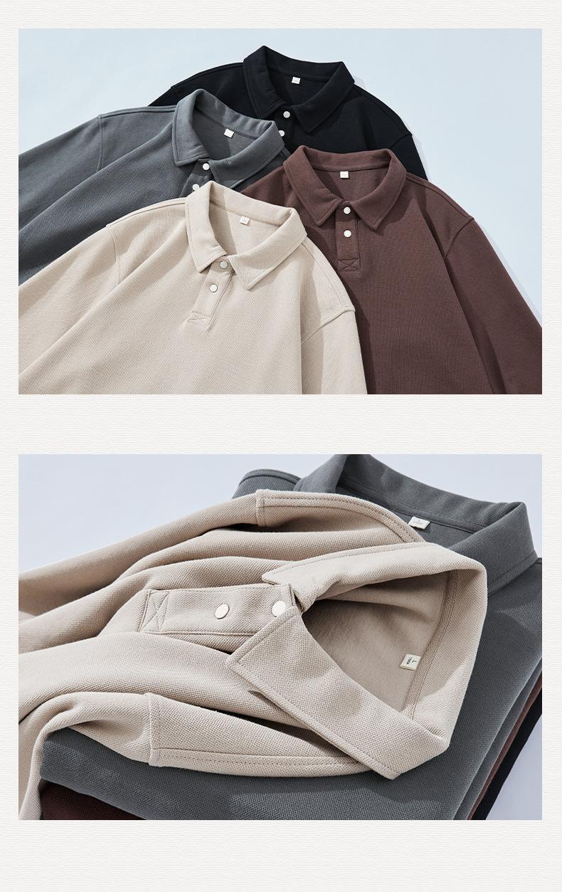 2025 Outono Novo Cor Sólida Manga Longa Camiseta Masculina Gola POLO Roupas Masculinas Casual Americano Solto Top Masculino