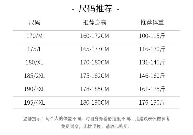 170/M (100-120 catties), 175/L (120-135 catties), 180/XL (135-150 catties), 185/2XL (150-165 catties), 190/3XL...