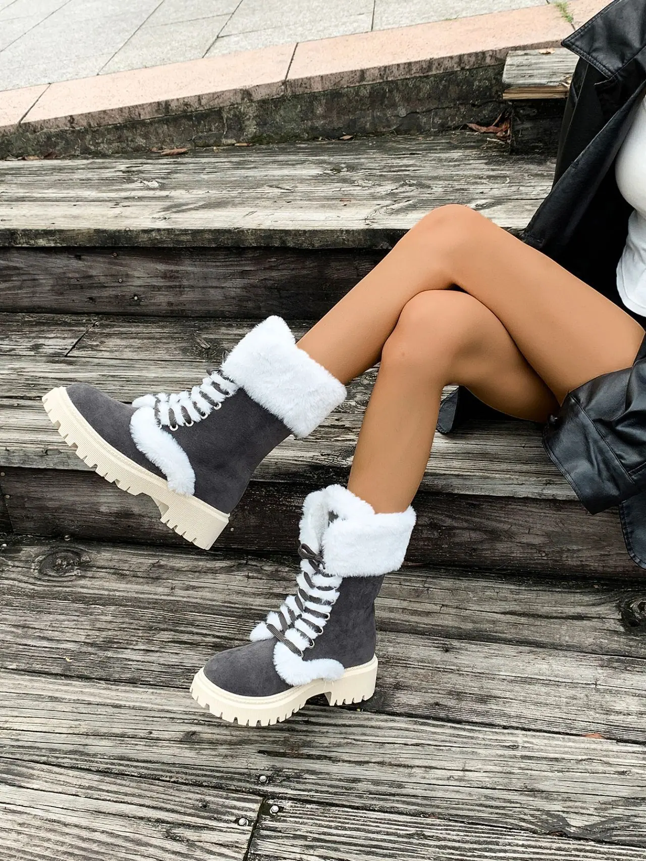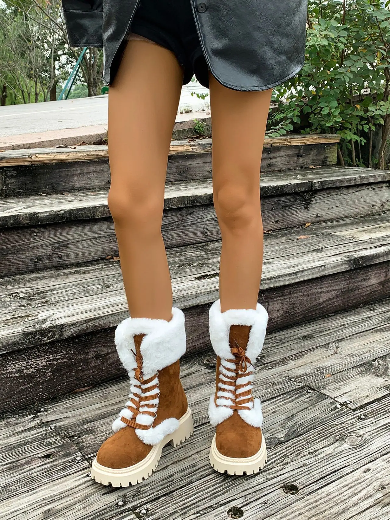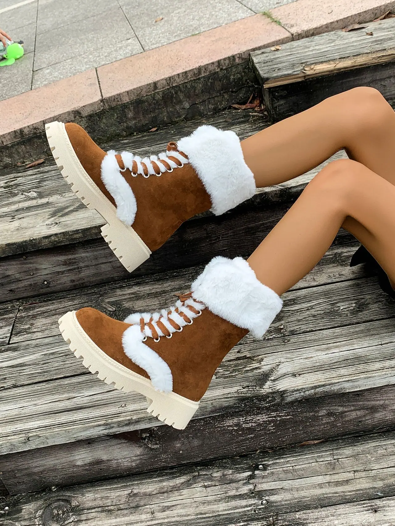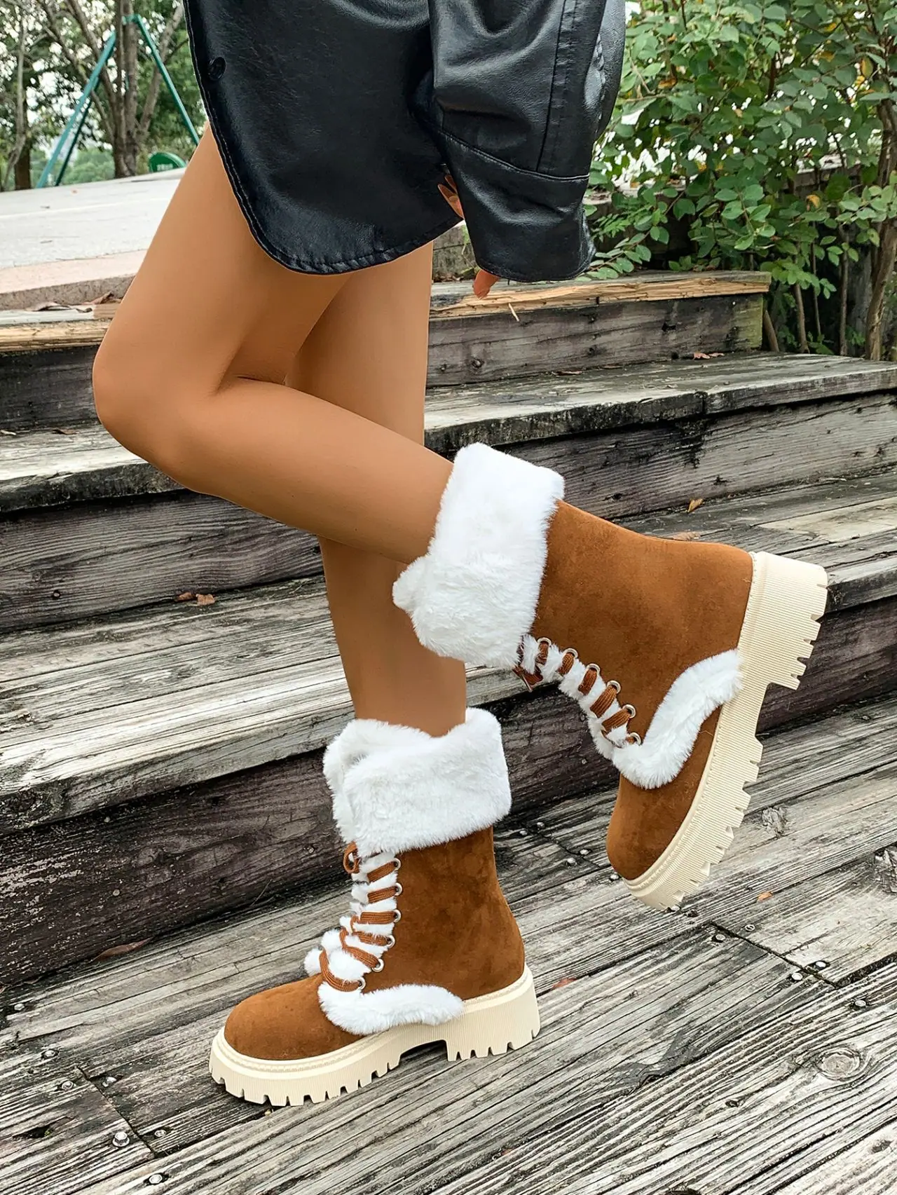 Inverno Quente Comércio Exterior Sola Grossa Botas de Neve 2024 Europeu e Americano Boca Peluda Tamanho Grande Camurça Forrada Cadarço Cano Médio Mulheres