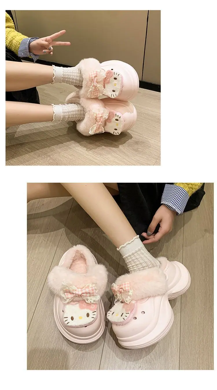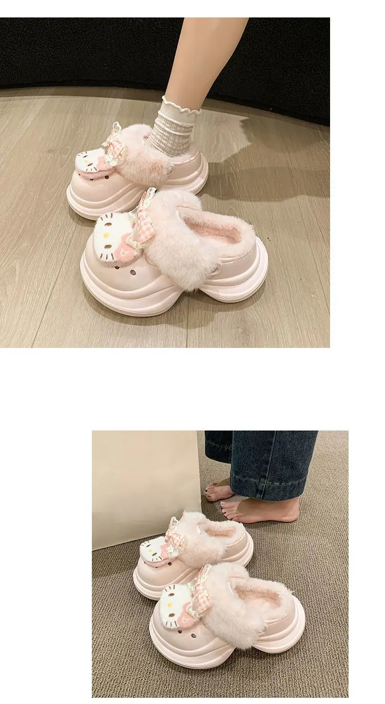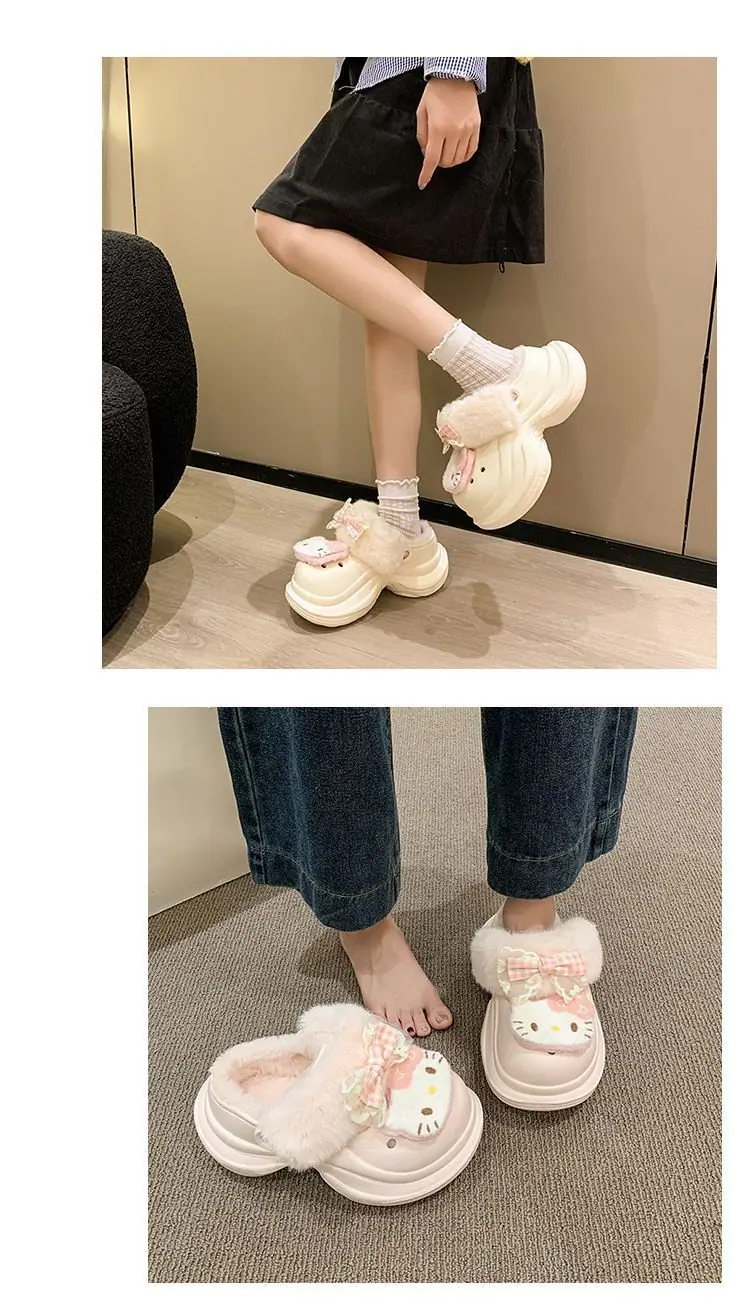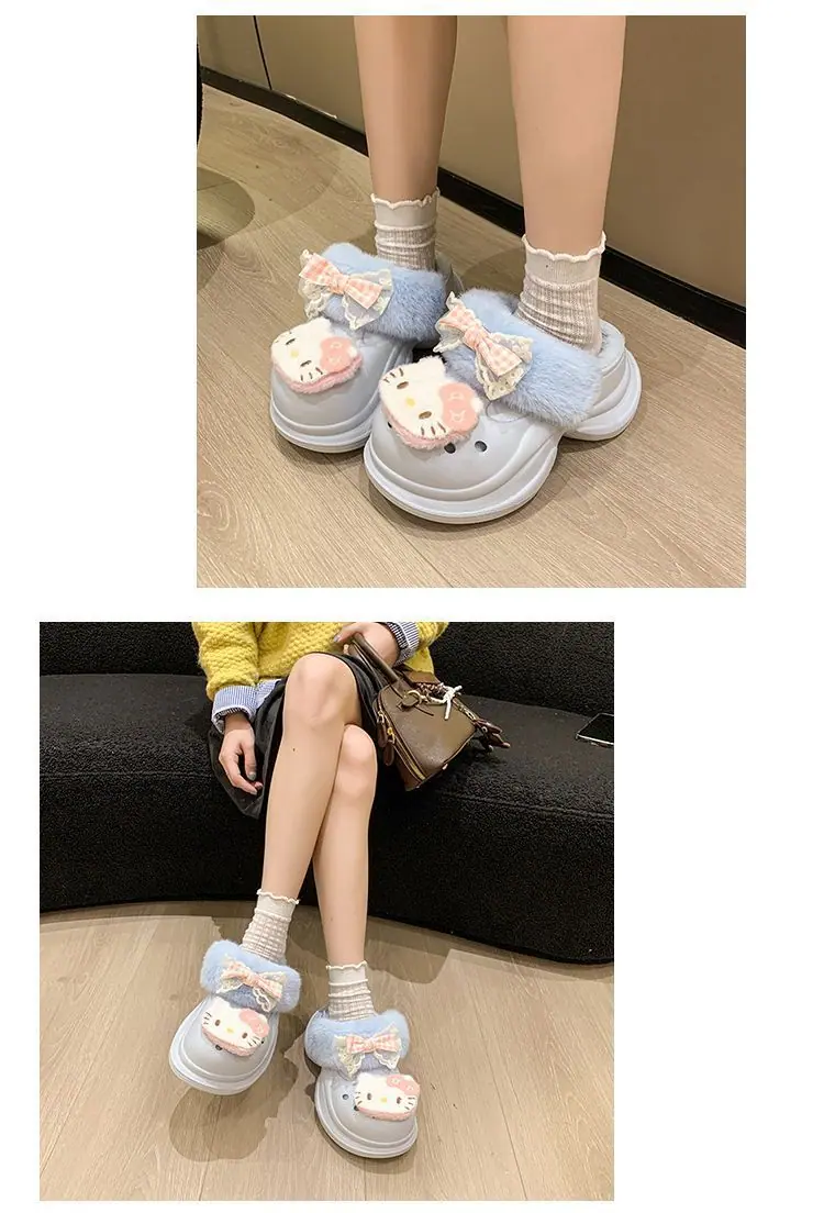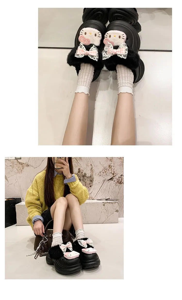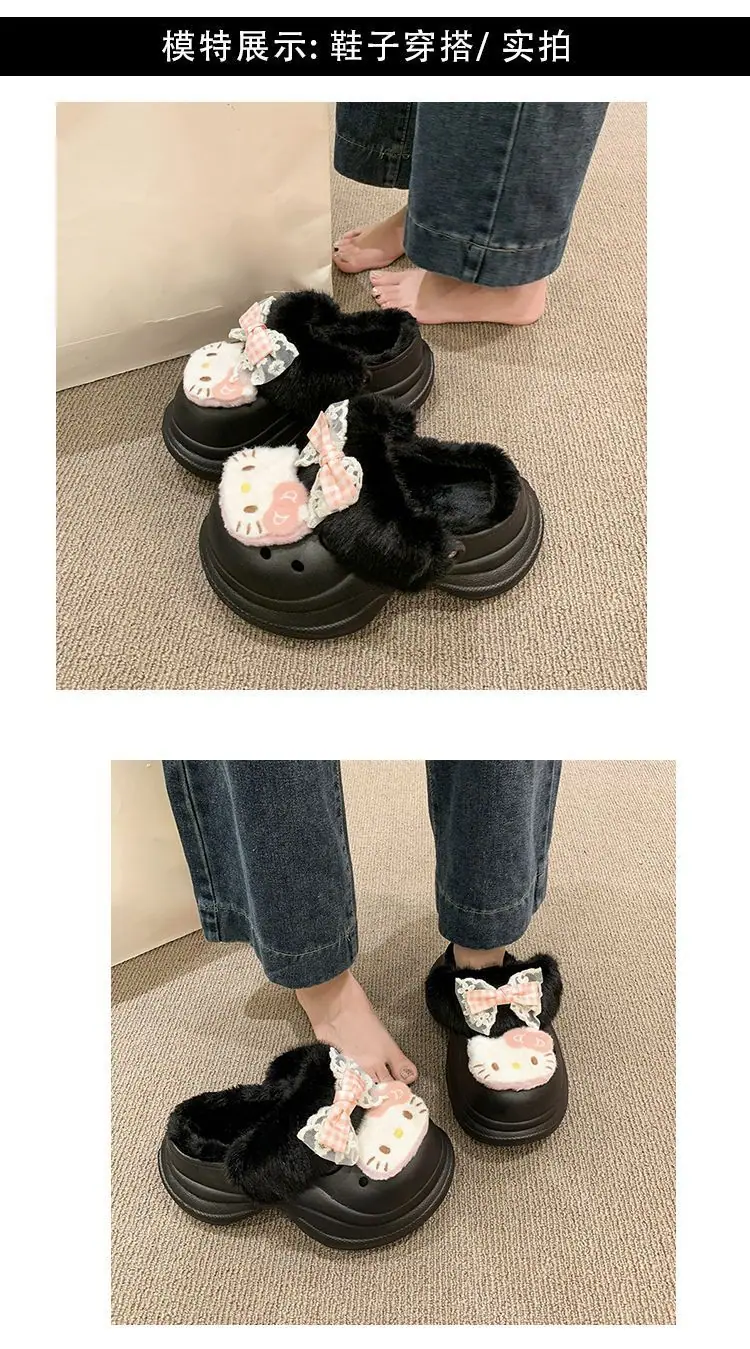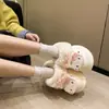Pantufas de Gatinho de Desenho Animado Femininas Forradas com Lã Quentes para Exterior com Sola Plataforma Antiderrapante Pantufas Preguiçosas de Bico Fechado 2025 Outono/Inverno Novas