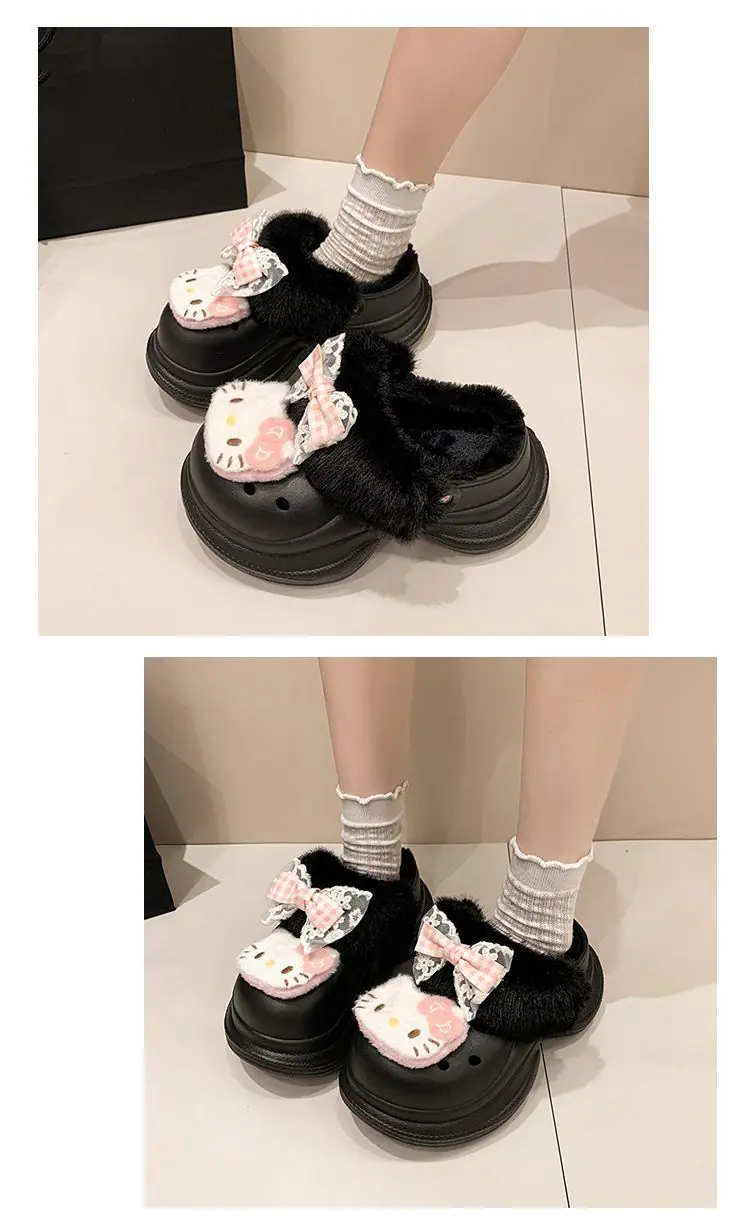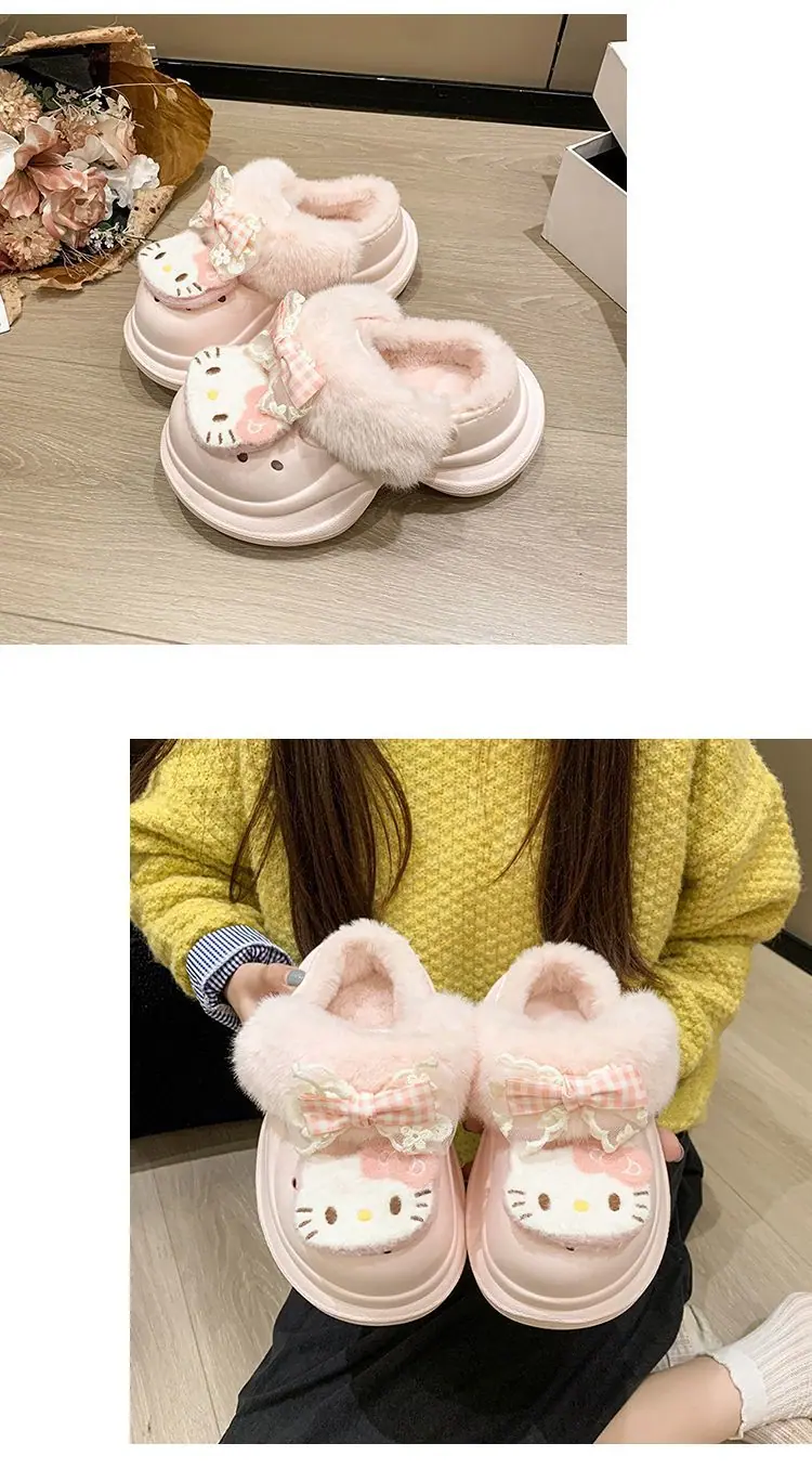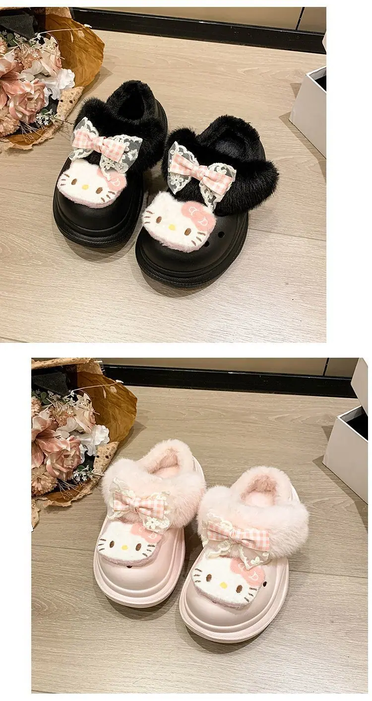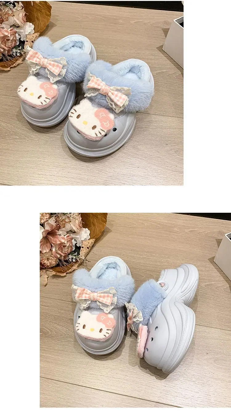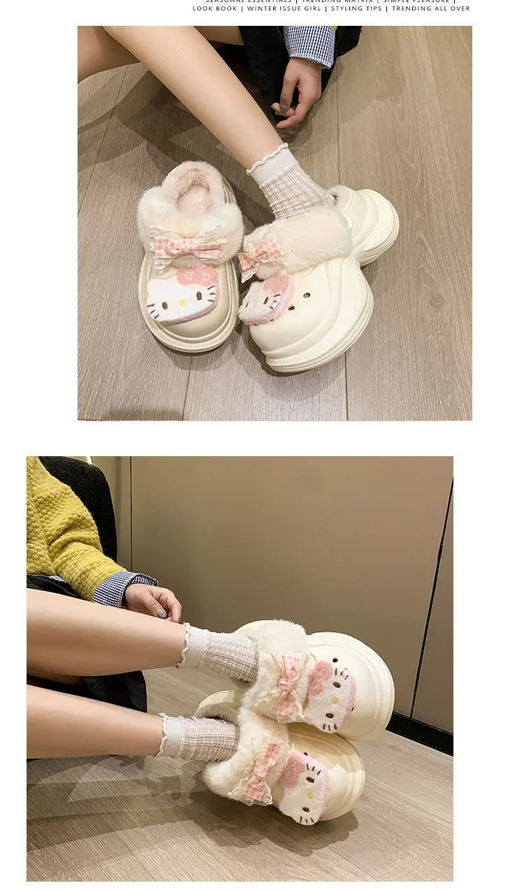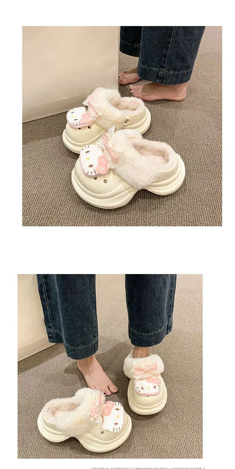 Pantufas de Gatinho de Desenho Animado Femininas Forradas com Lã Quentes para Exterior com Sola Plataforma Antiderrapante Pantufas Preguiçosas de Bico Fechado 2025 Outono/Inverno Novas