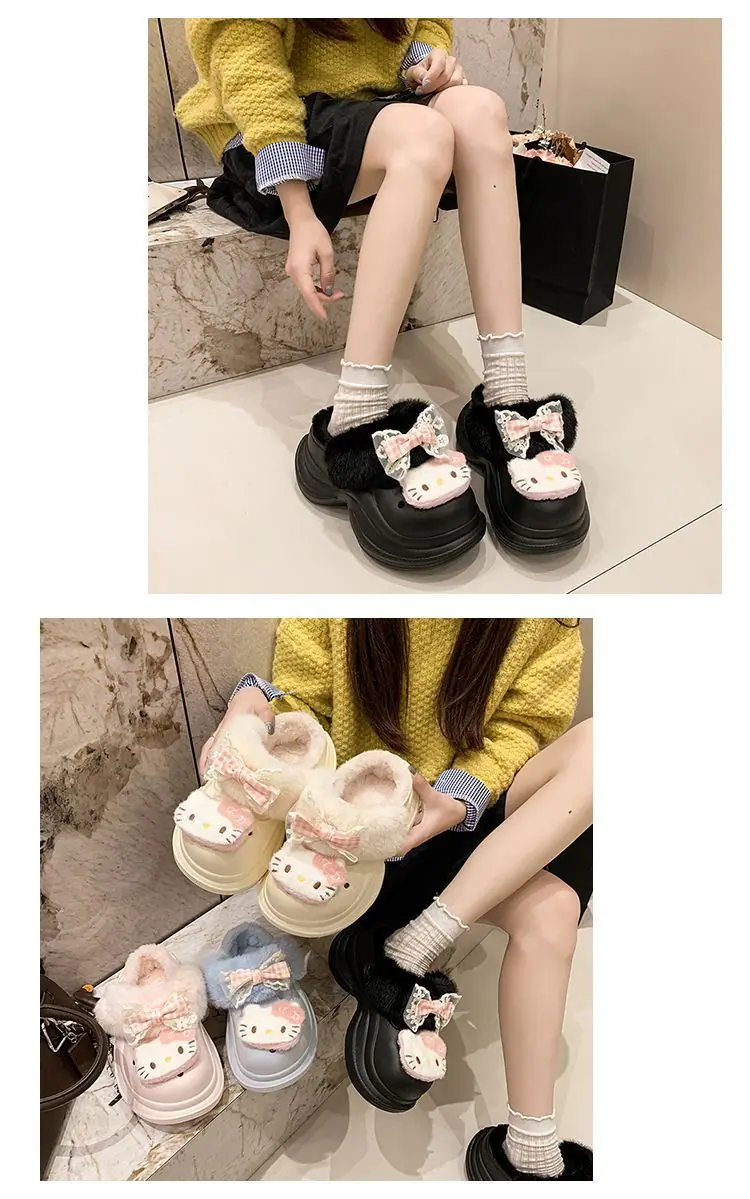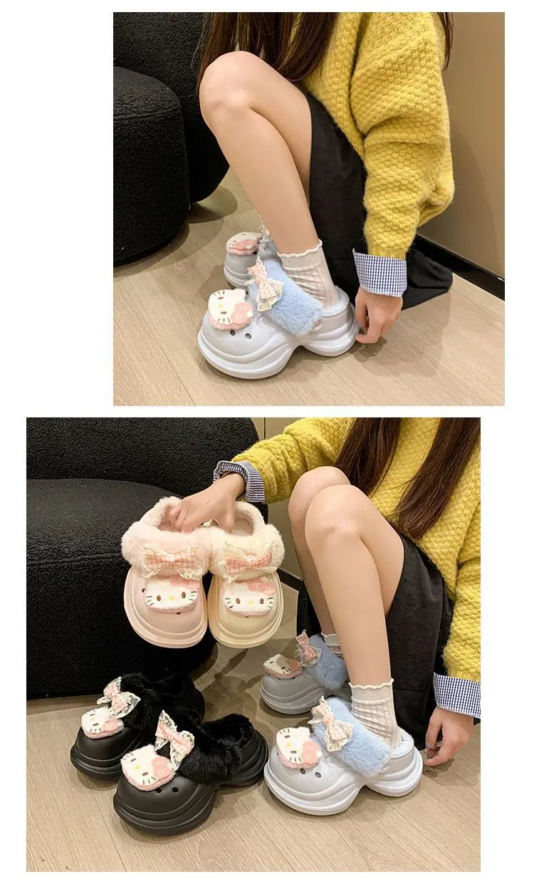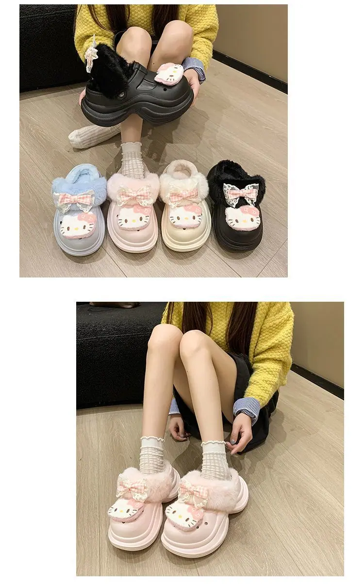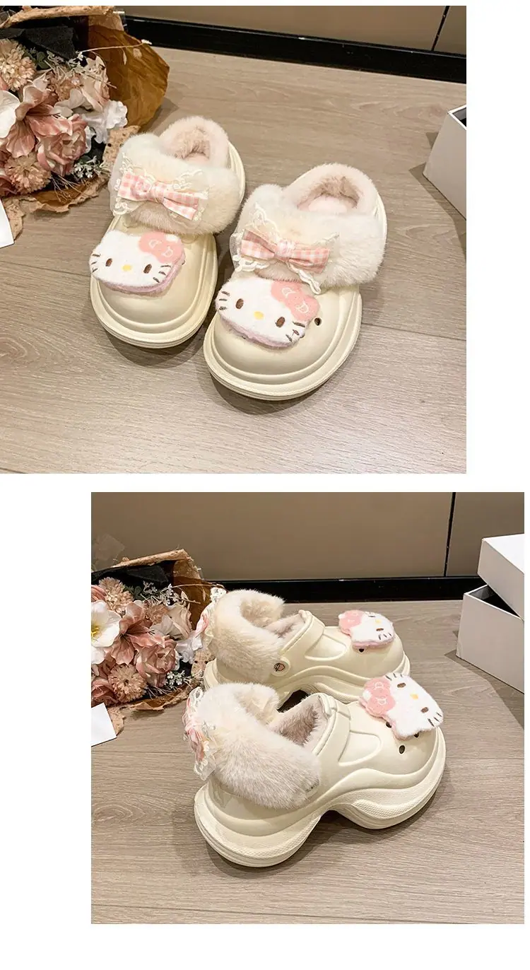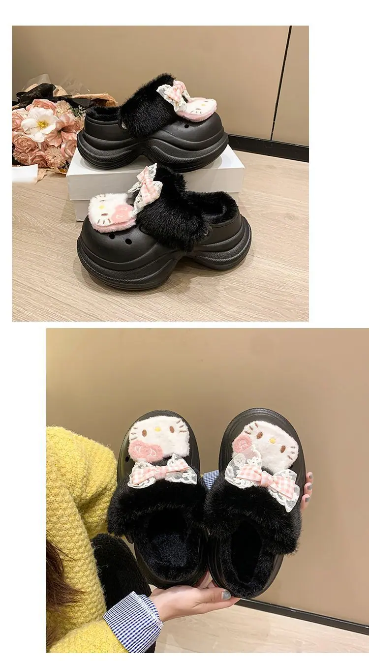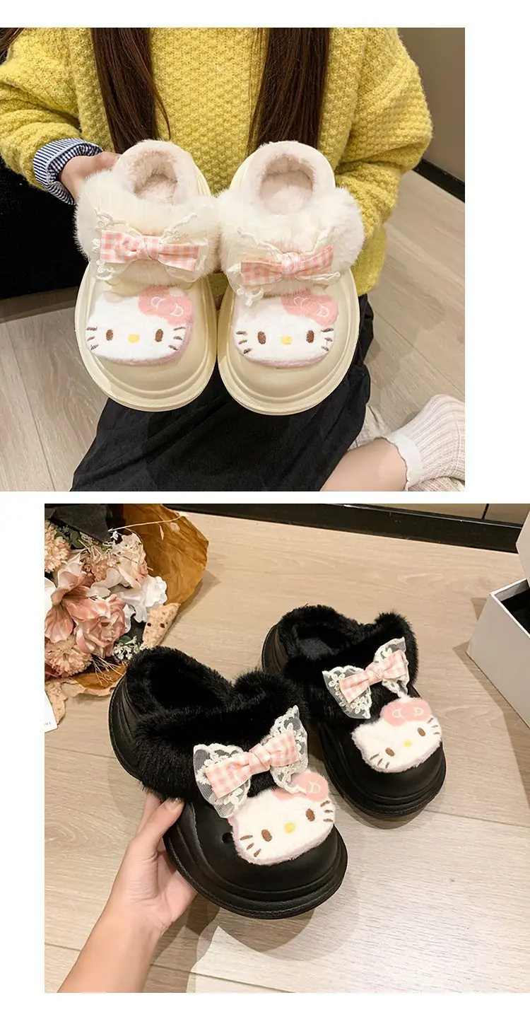 Pantufas de Gatinho de Desenho Animado Femininas Forradas com Lã Quentes para Exterior com Sola Plataforma Antiderrapante Pantufas Preguiçosas de Bico Fechado 2025 Outono/Inverno Novas
