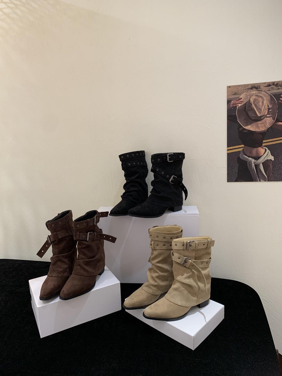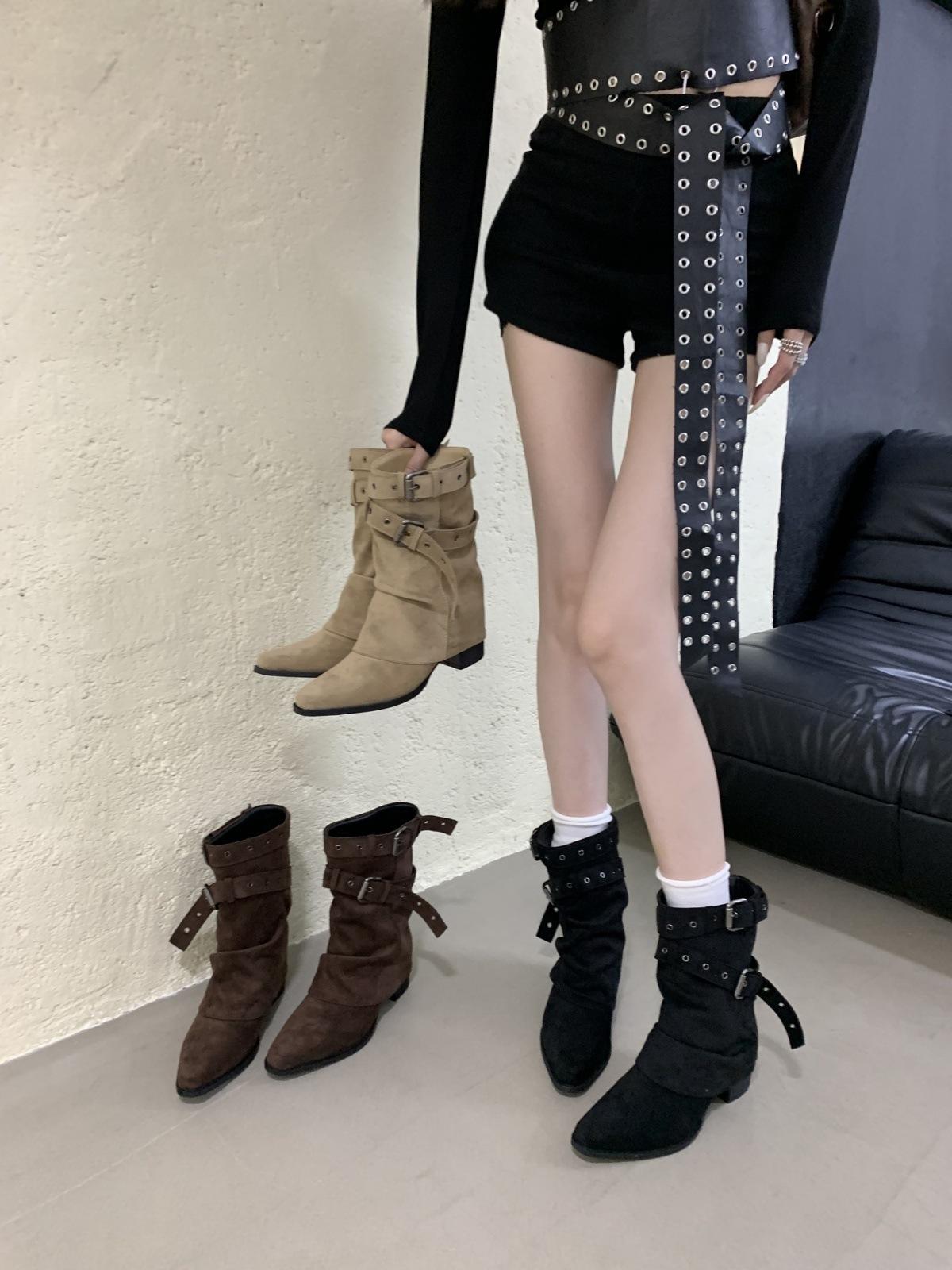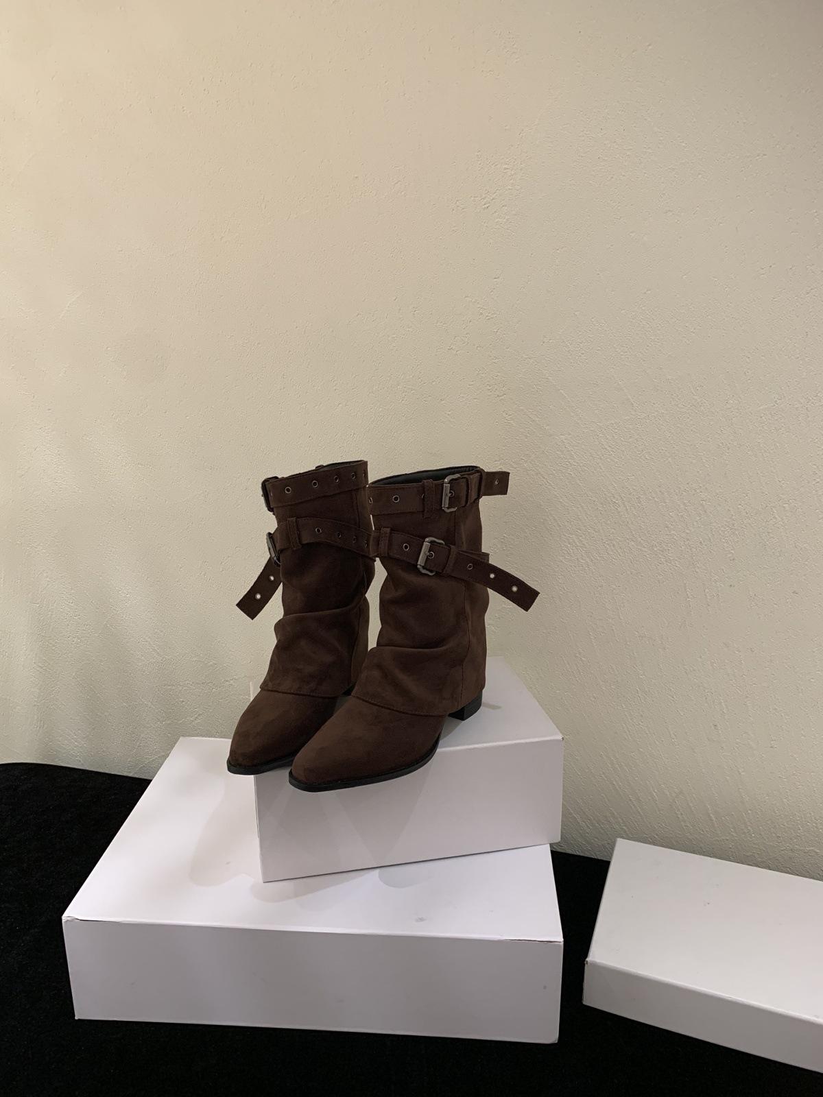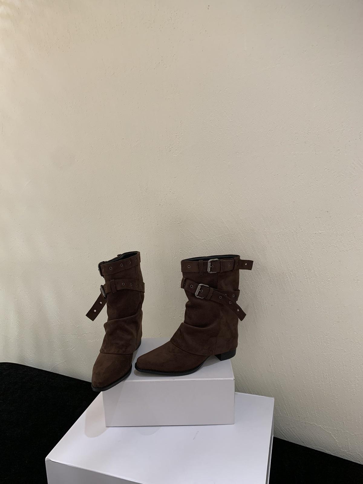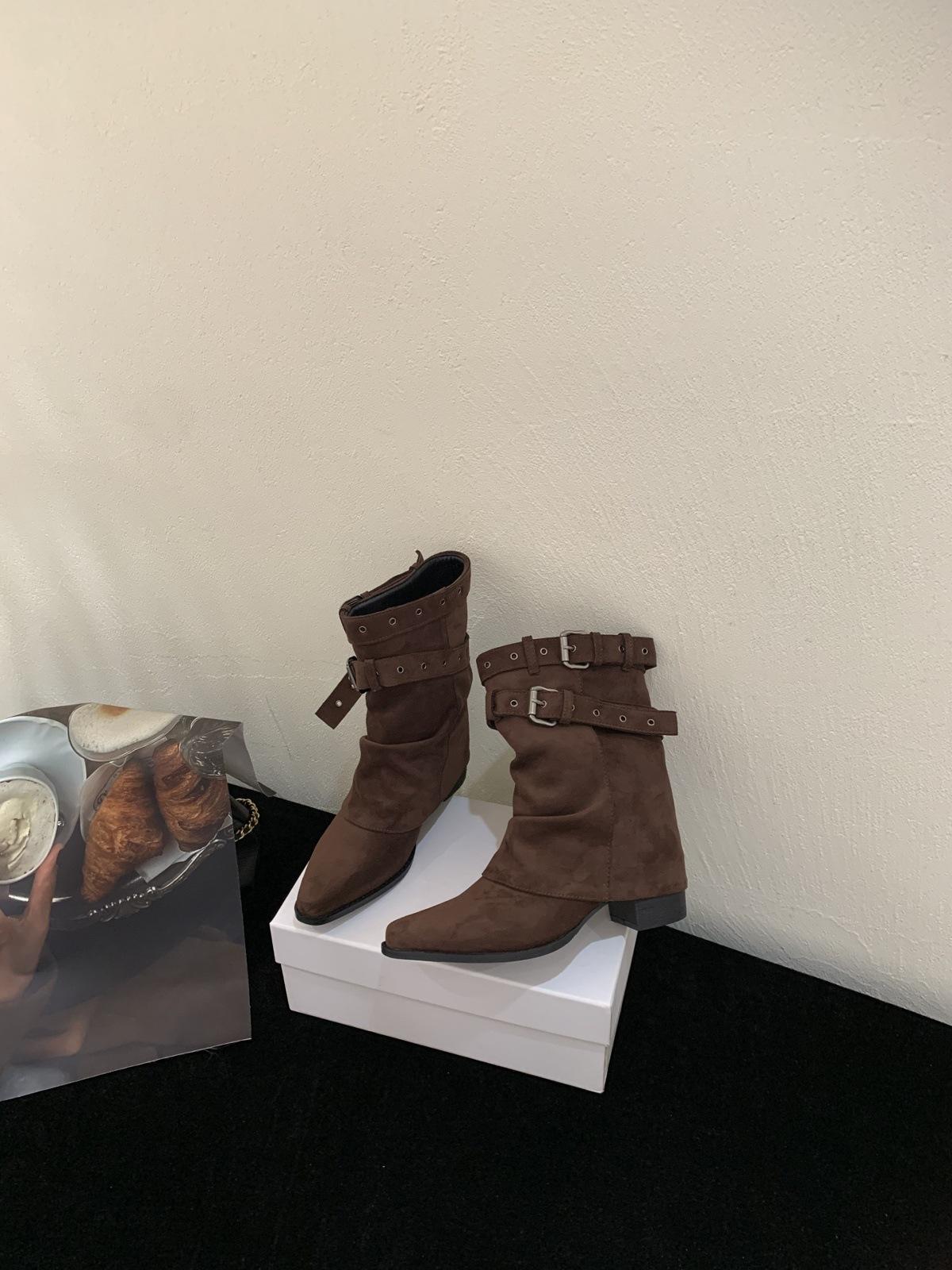 Botas de Tornozelo Novas Outono/Inverno 2025 Camurça Cor Café Femininas Bico Fino Cano Médio Botas Tamanho Plus Fivela de Cinto Sapatos de Bota