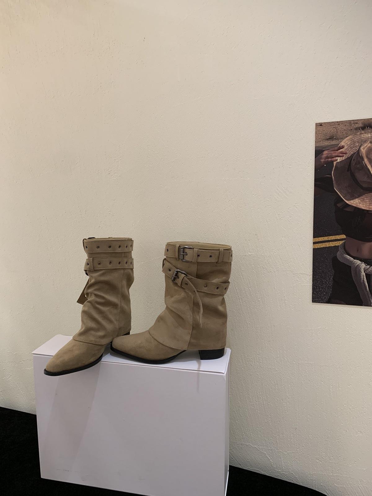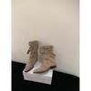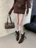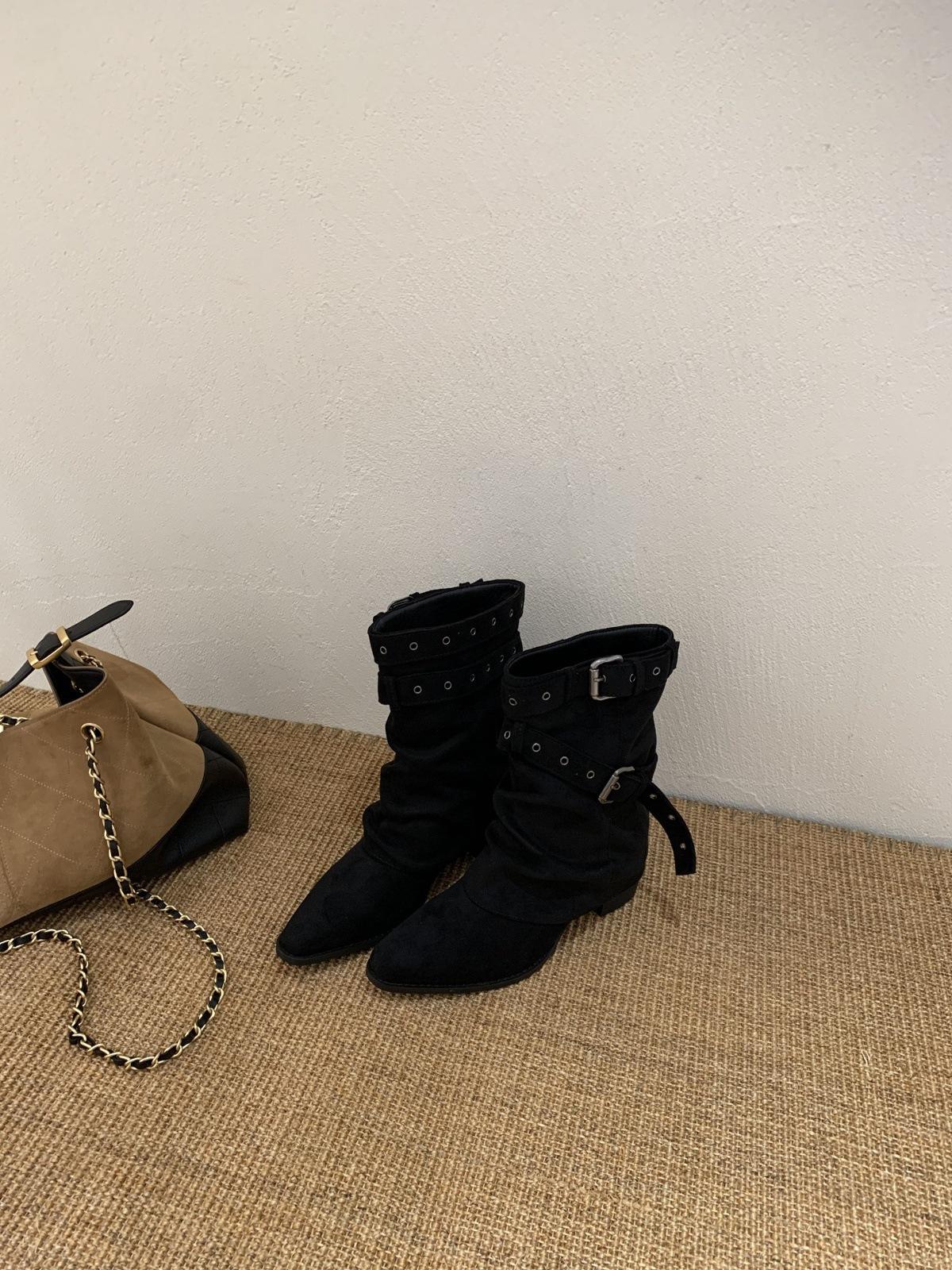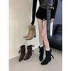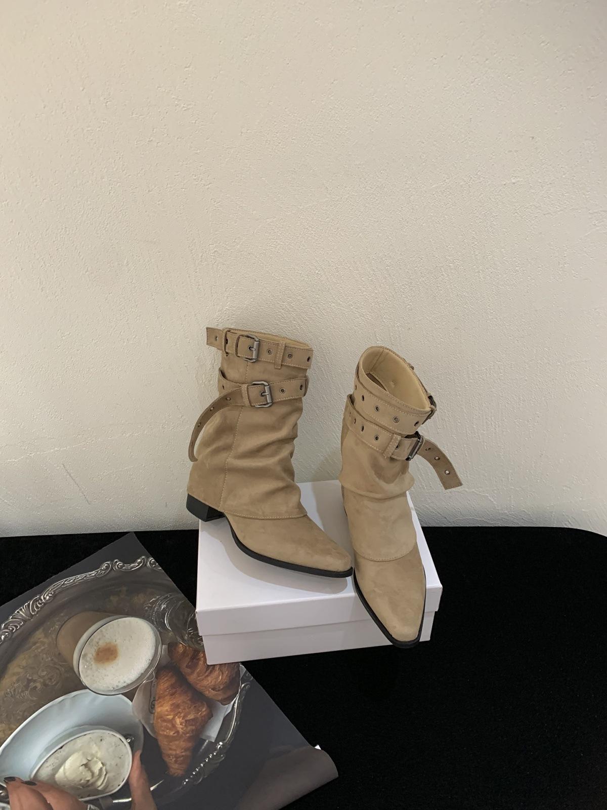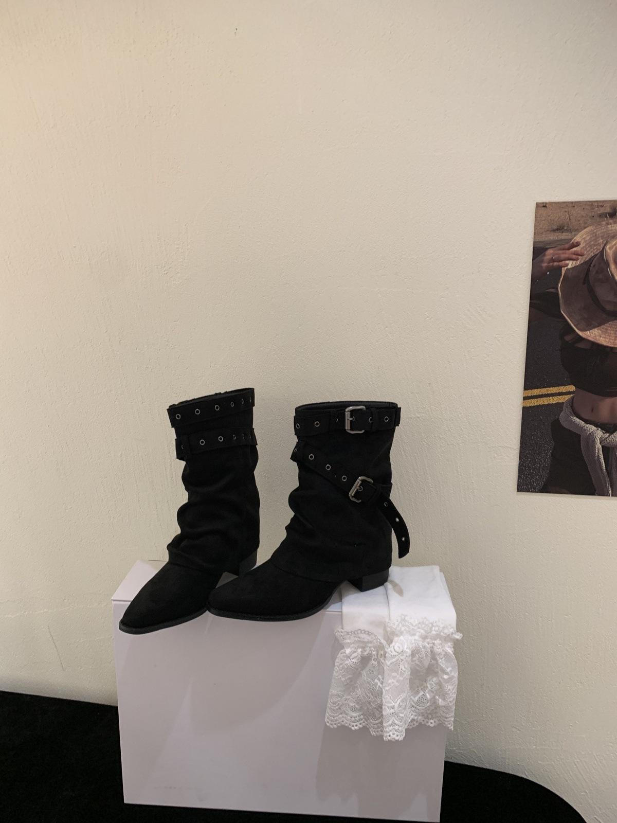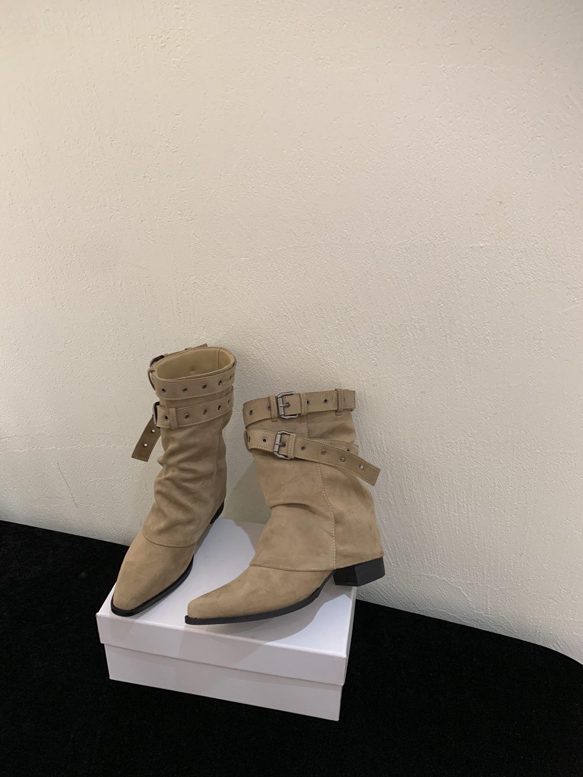 Botas de Tornozelo Novas Outono/Inverno 2025 Camurça Cor Café Femininas Bico Fino Cano Médio Botas Tamanho Plus Fivela de Cinto Sapatos de Bota
