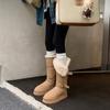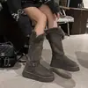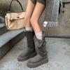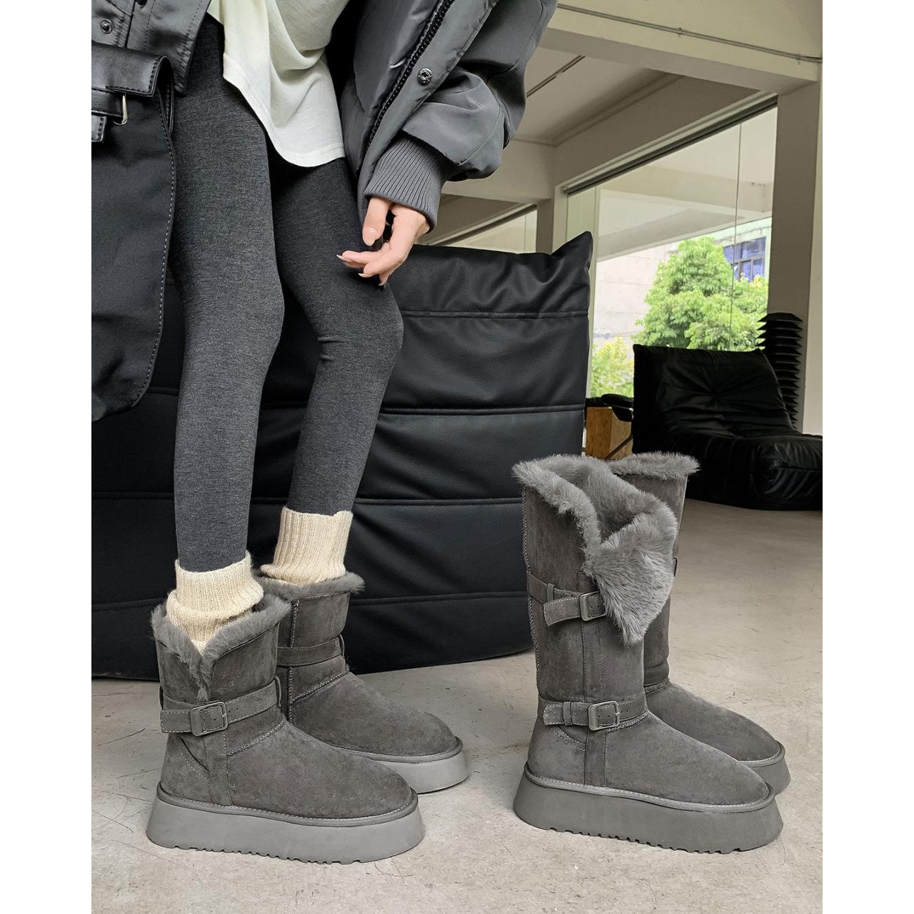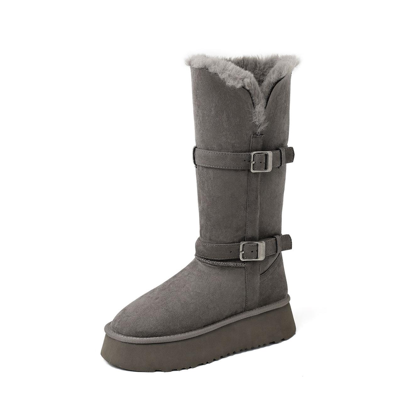 Botas de Neve Cinzas Femininas 2025 Inverno Novo Estilo Couro e Pele Peça Única Sola Grossa Aumenta a Altura Forro de Lã Espessas Cano Longo Neve Algodão Sapatos