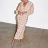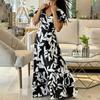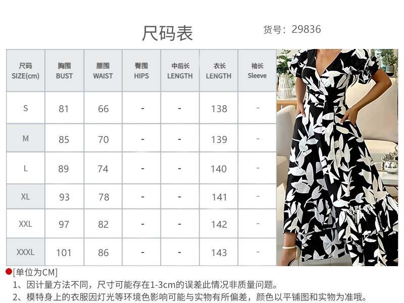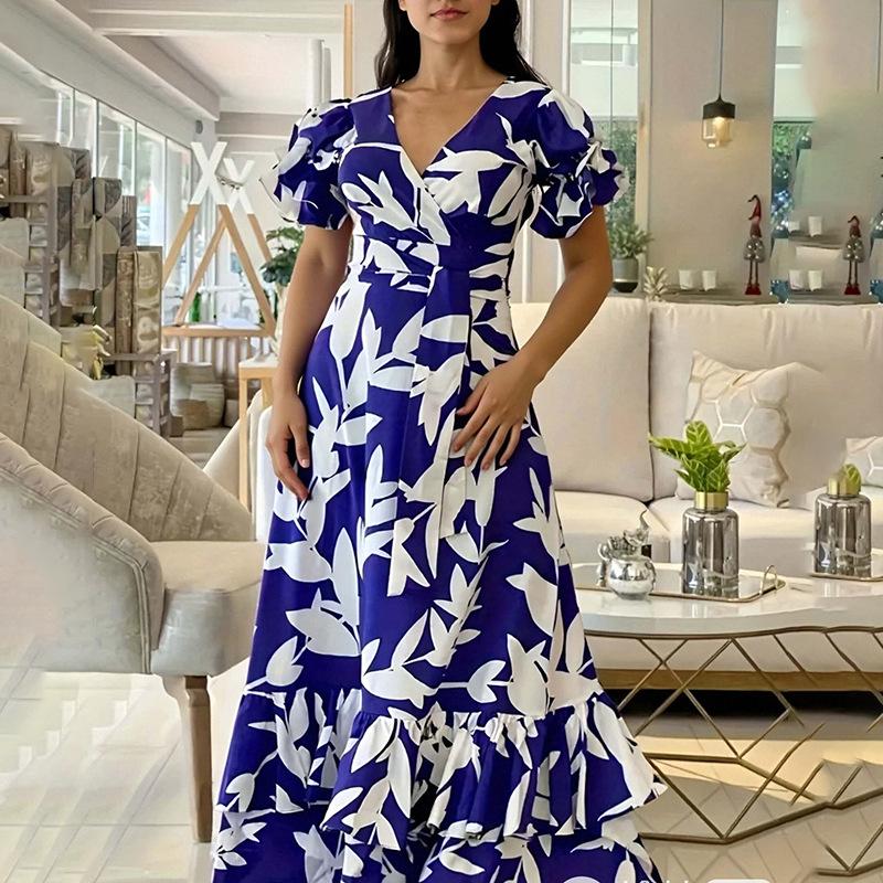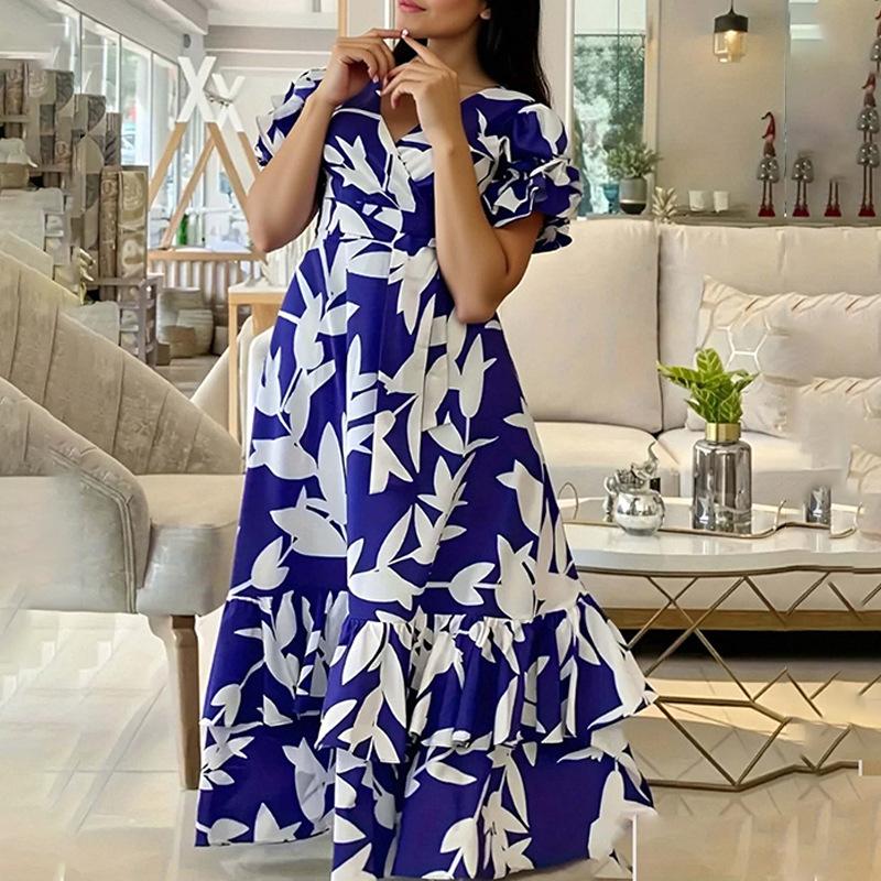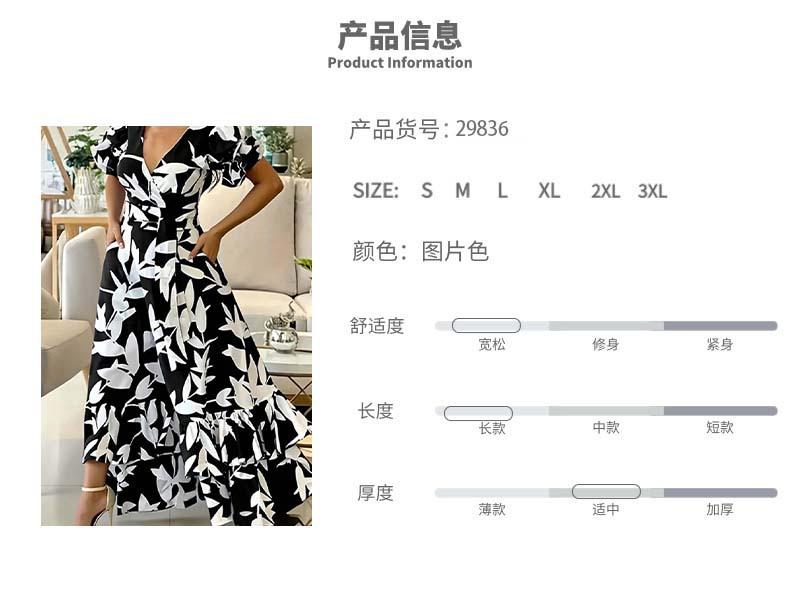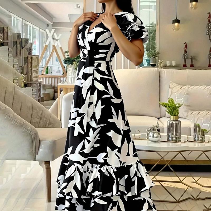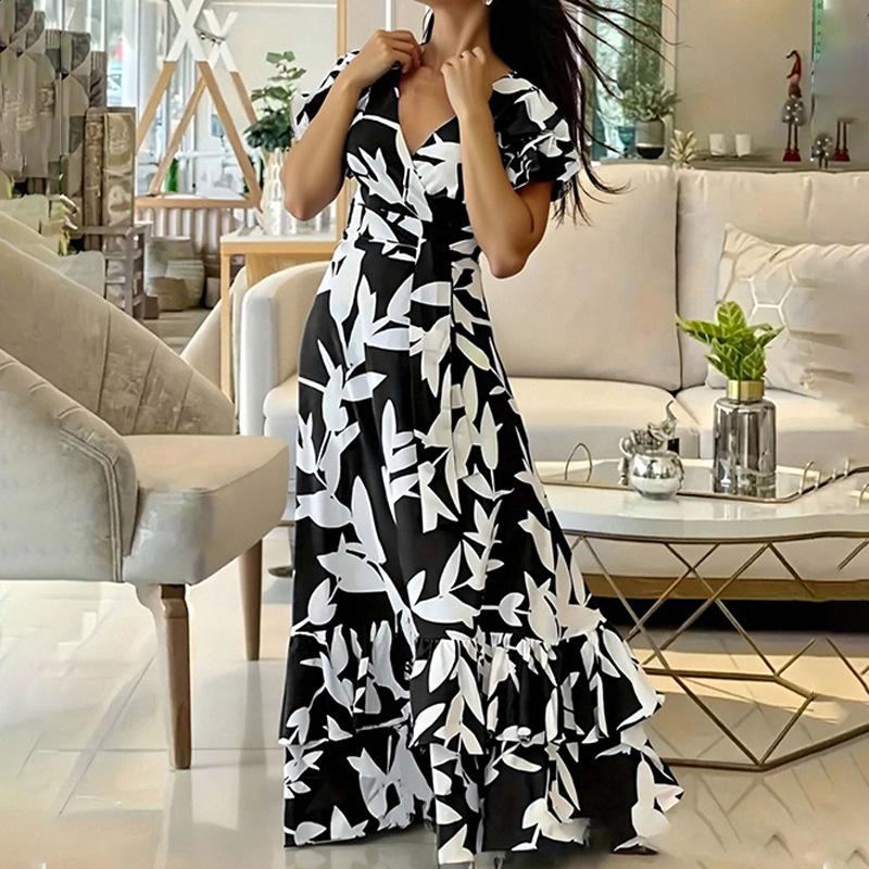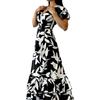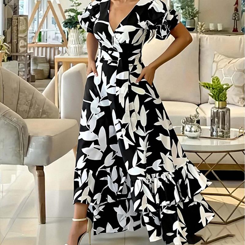 2025 Outono Novo Moda Transfronteiriça Europeia e Americana Casual Versátil Individual Estampado Decote em V Manga Curta Vestido Saia Longa Mulheres