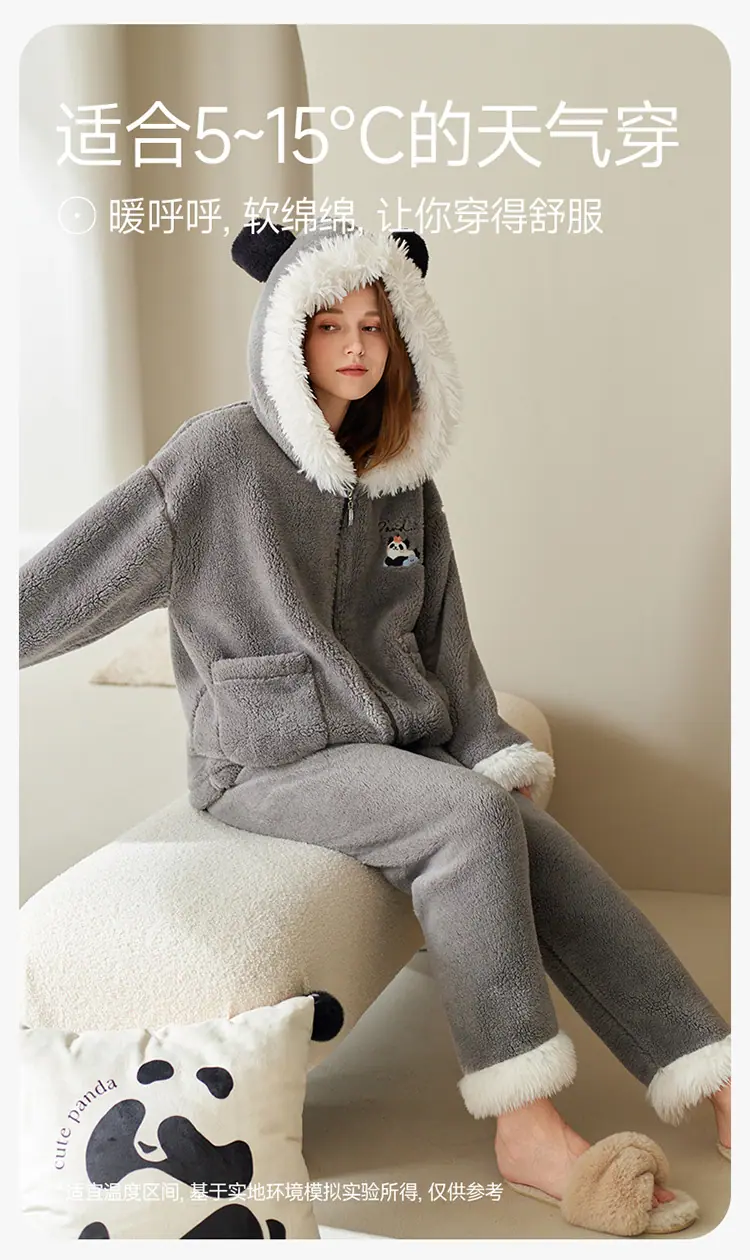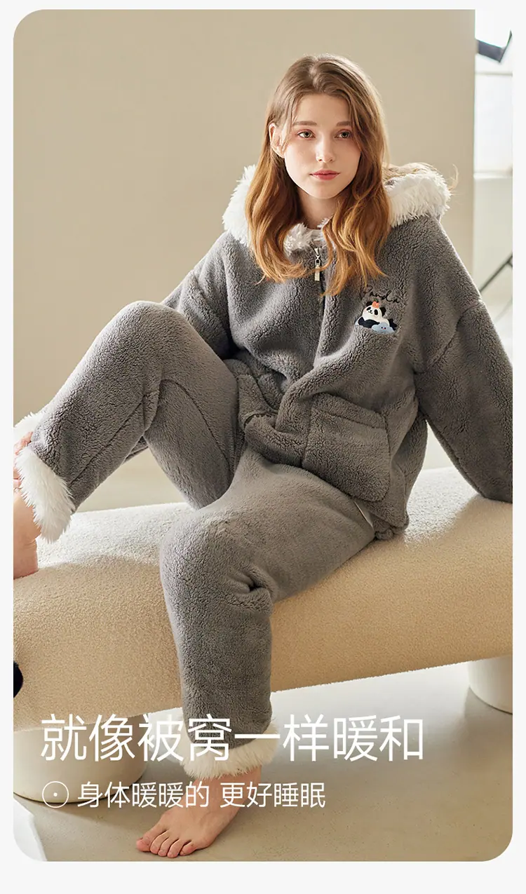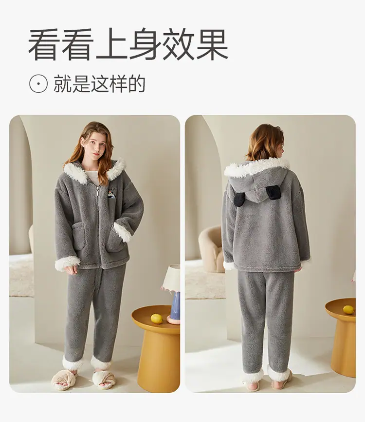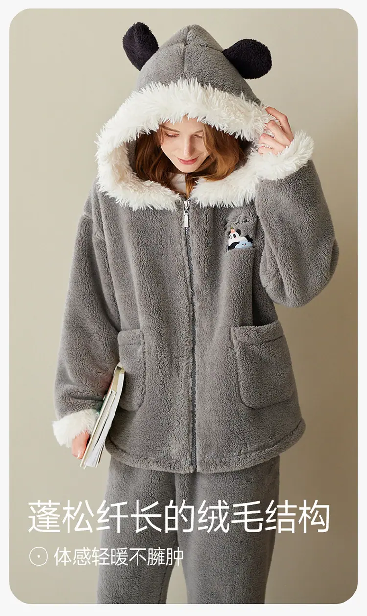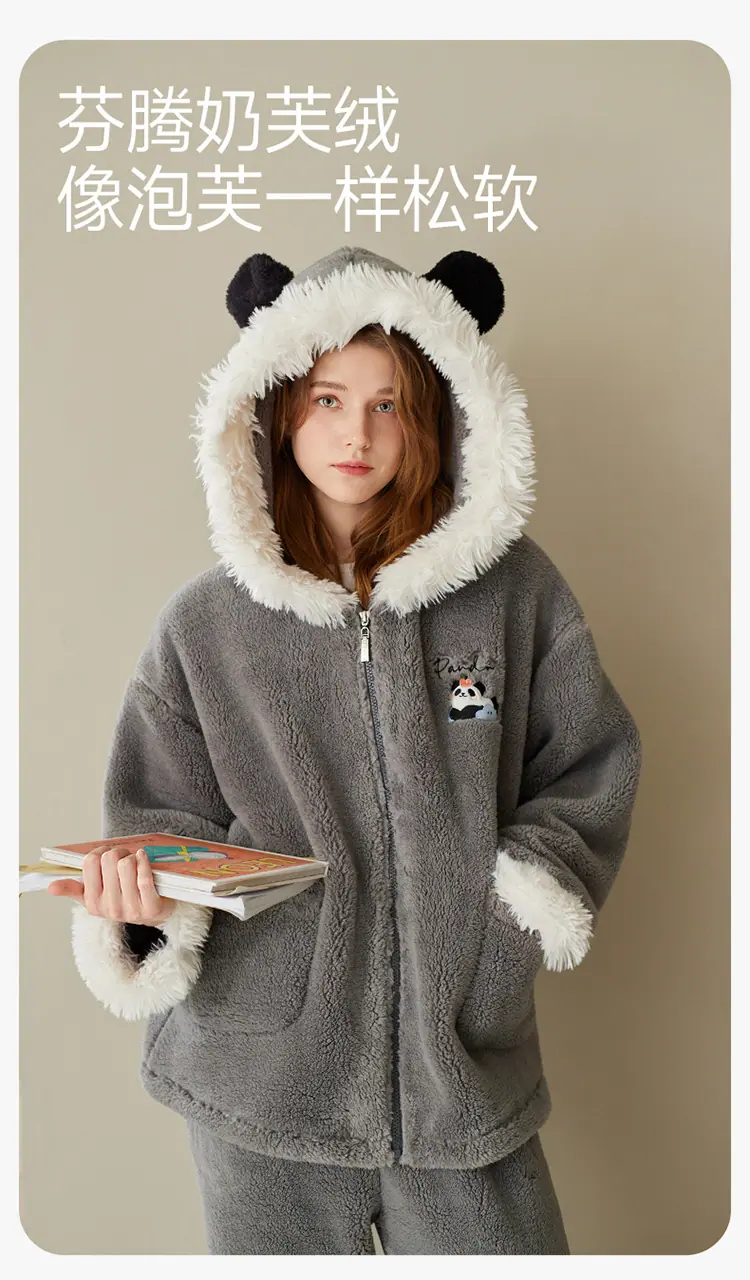 Fenteng [Cabeça de Panda com Capuz] Pijama Feminino Lã Coral Outono e Inverno Conjunto Espessado Plus Veludo Feminino Pode Usar na Rua Fofo
