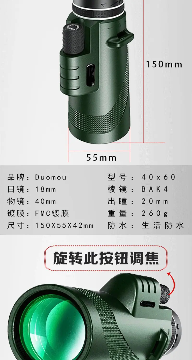 40x60 Monocular Telescope Green Model + Phone Clip