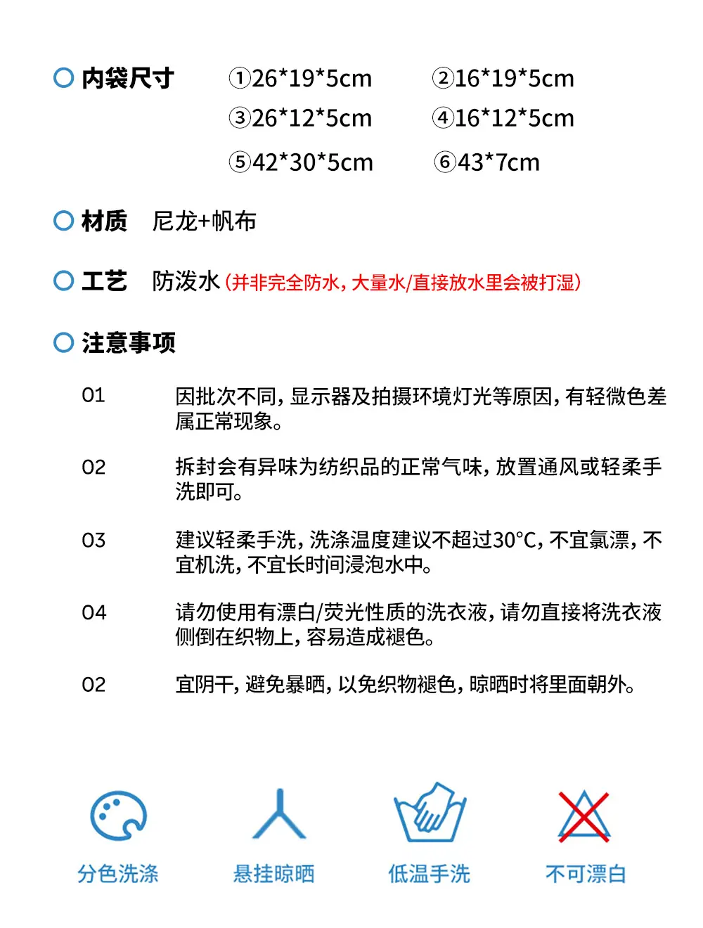 Bolsa interna (da esquerda para a direita, de cima para baixo):【26*19*5cm】【16*19*5cm】【26*12*5cm】【16*12*5cm】【42*19cm】【42*30*5cm】