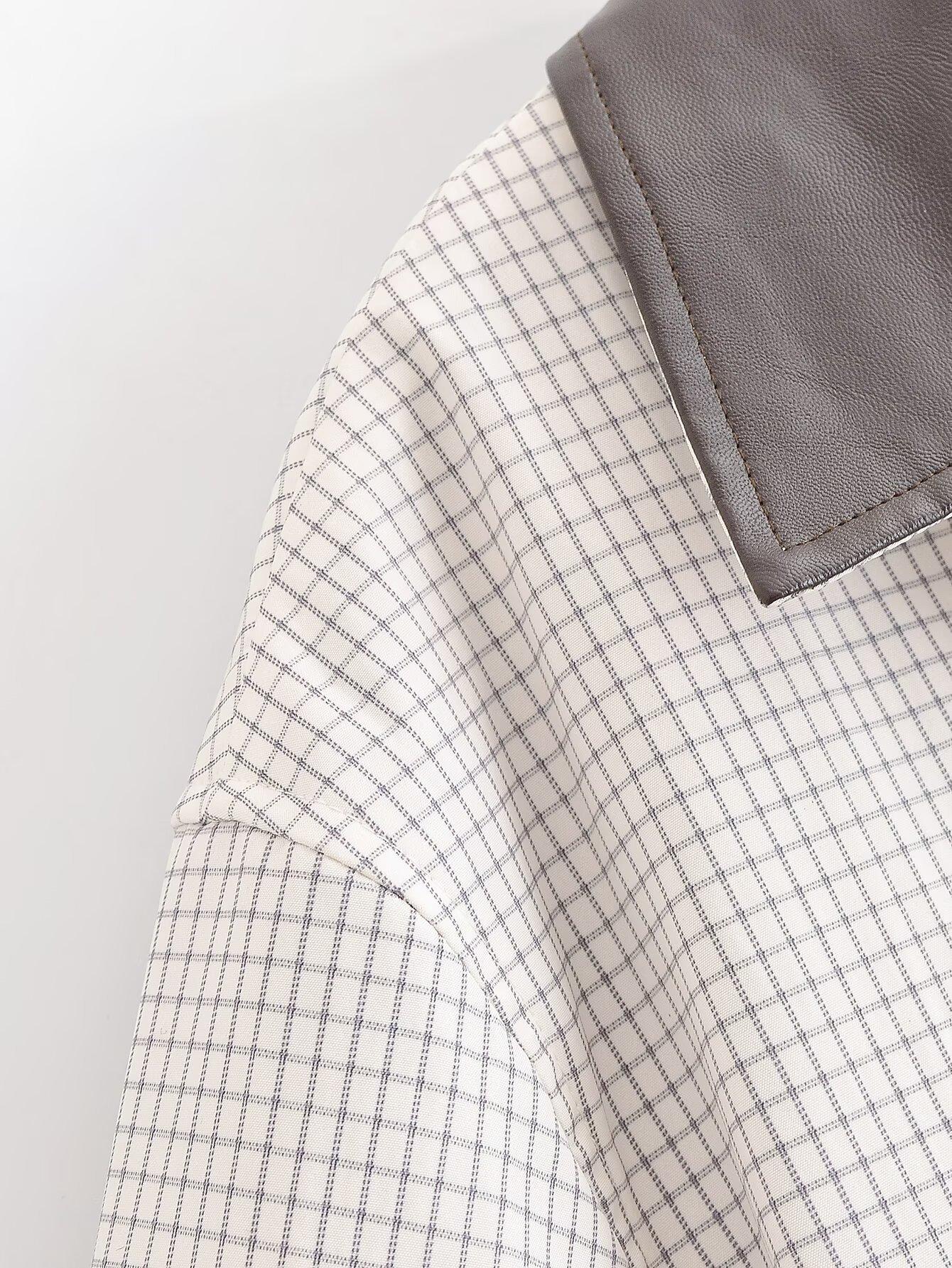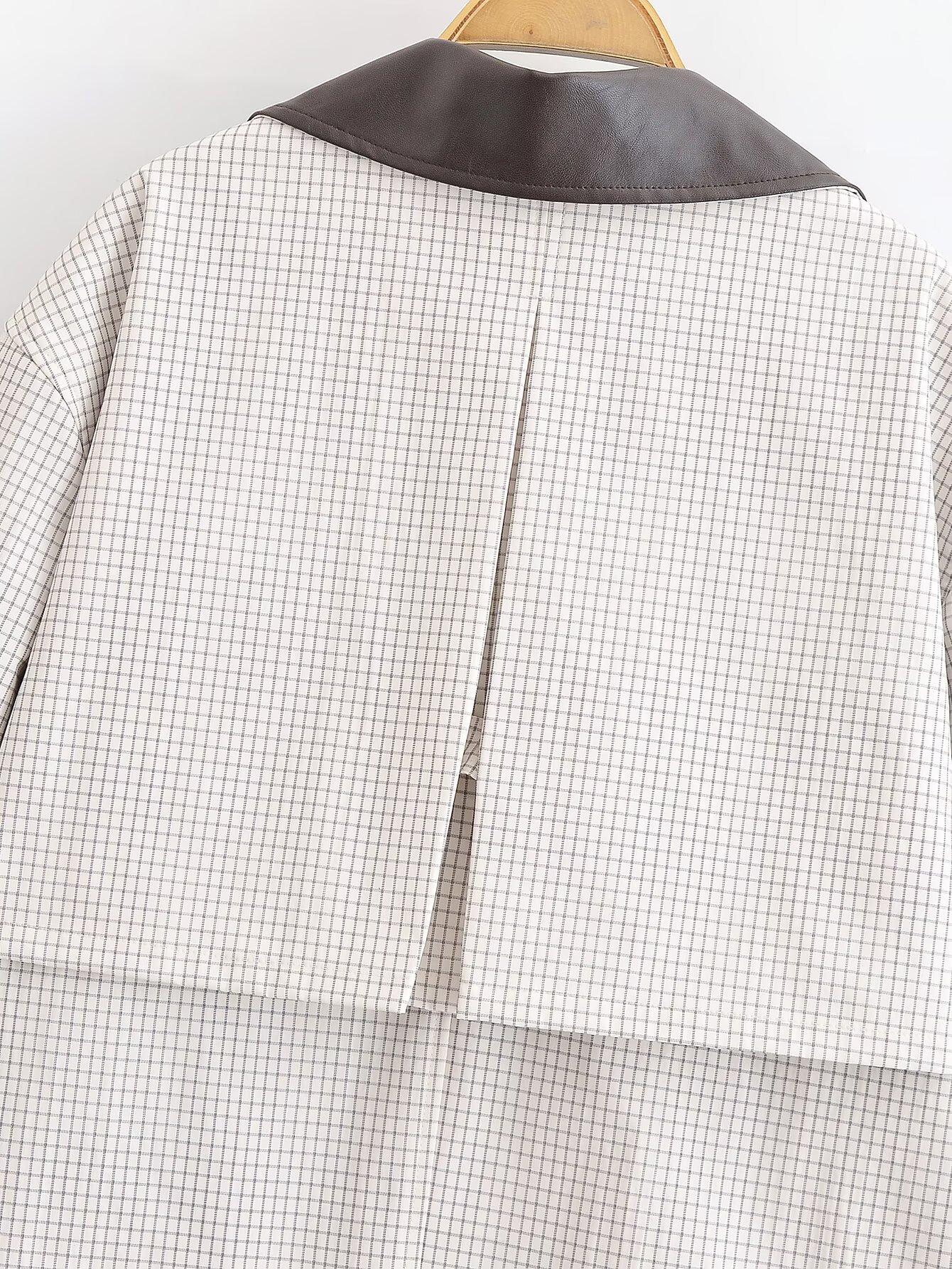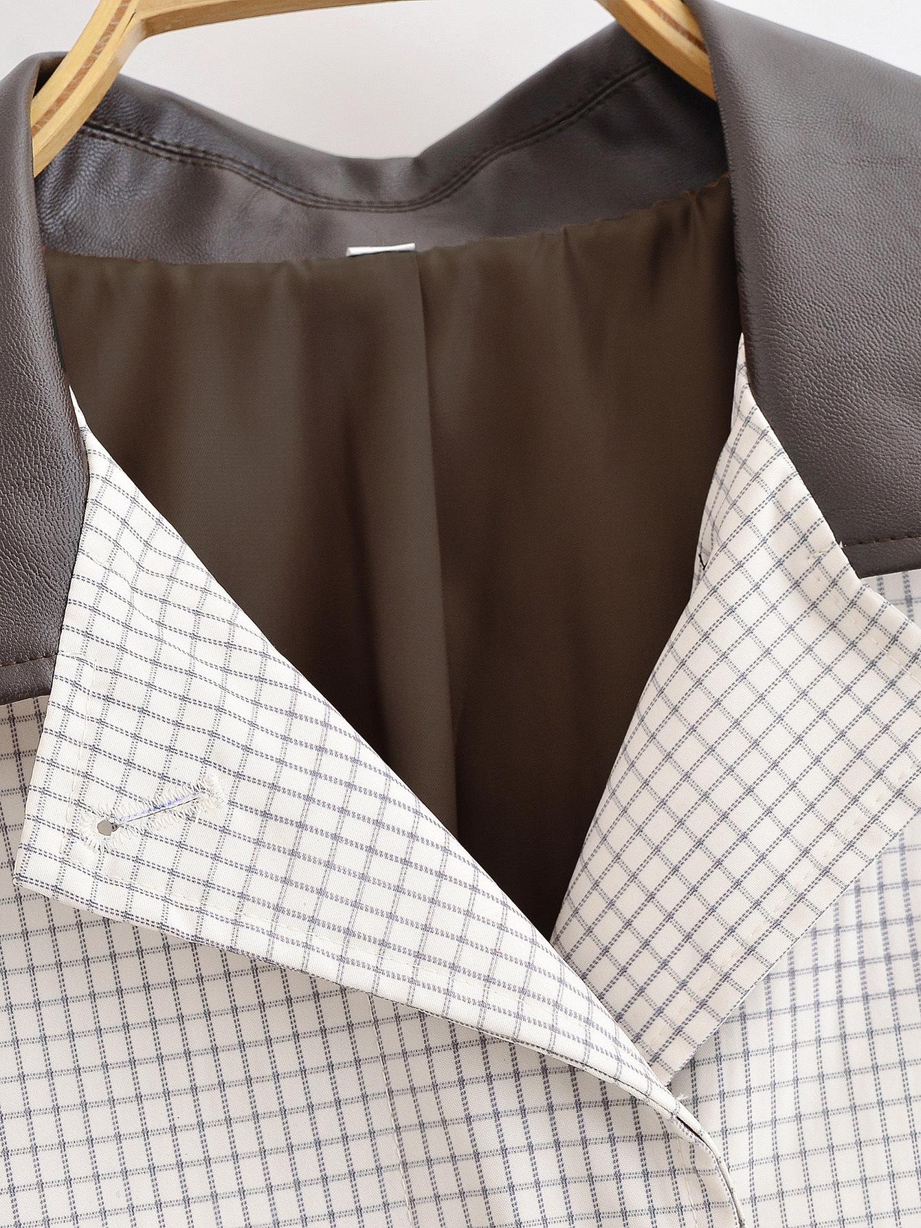 Moda feminina transfronteiriça outono/inverno 2025 estilo europeu e americano jaqueta trench coat xadrez curta com lapela PU color block mulheres A711681