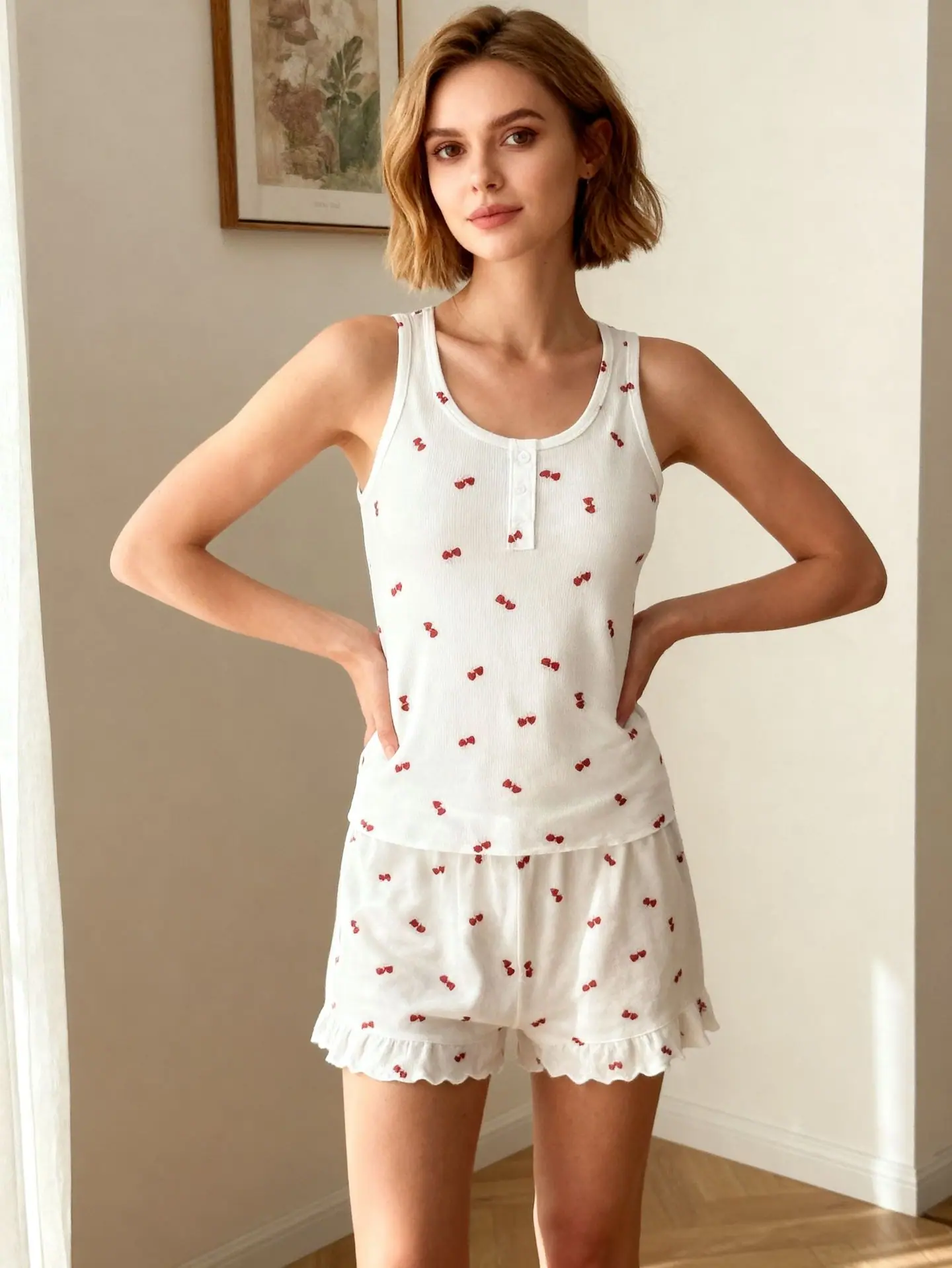 Conjunto de Pijama de Verão Europeu e Americano Novo Regata Sem Mangas com Babados Shorts Feminino Transfronteiriço Confortável Conjunto da Moda Roupa de Casa