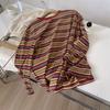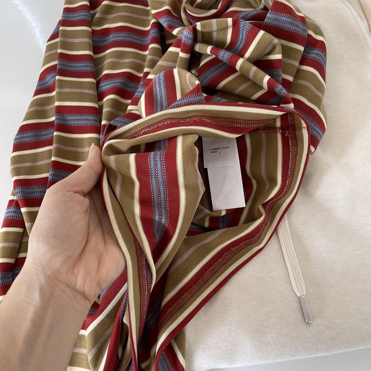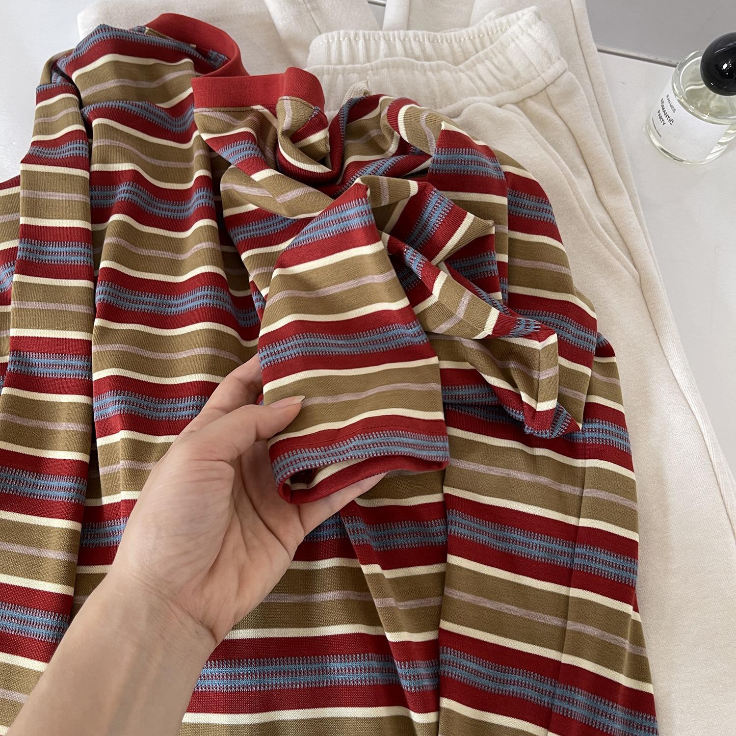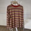 Camiseta feminina lisonjeira, elegante, retrô com listras color-block de manga comprida, novo estilo outono, modelagem solta, top casual, camada base