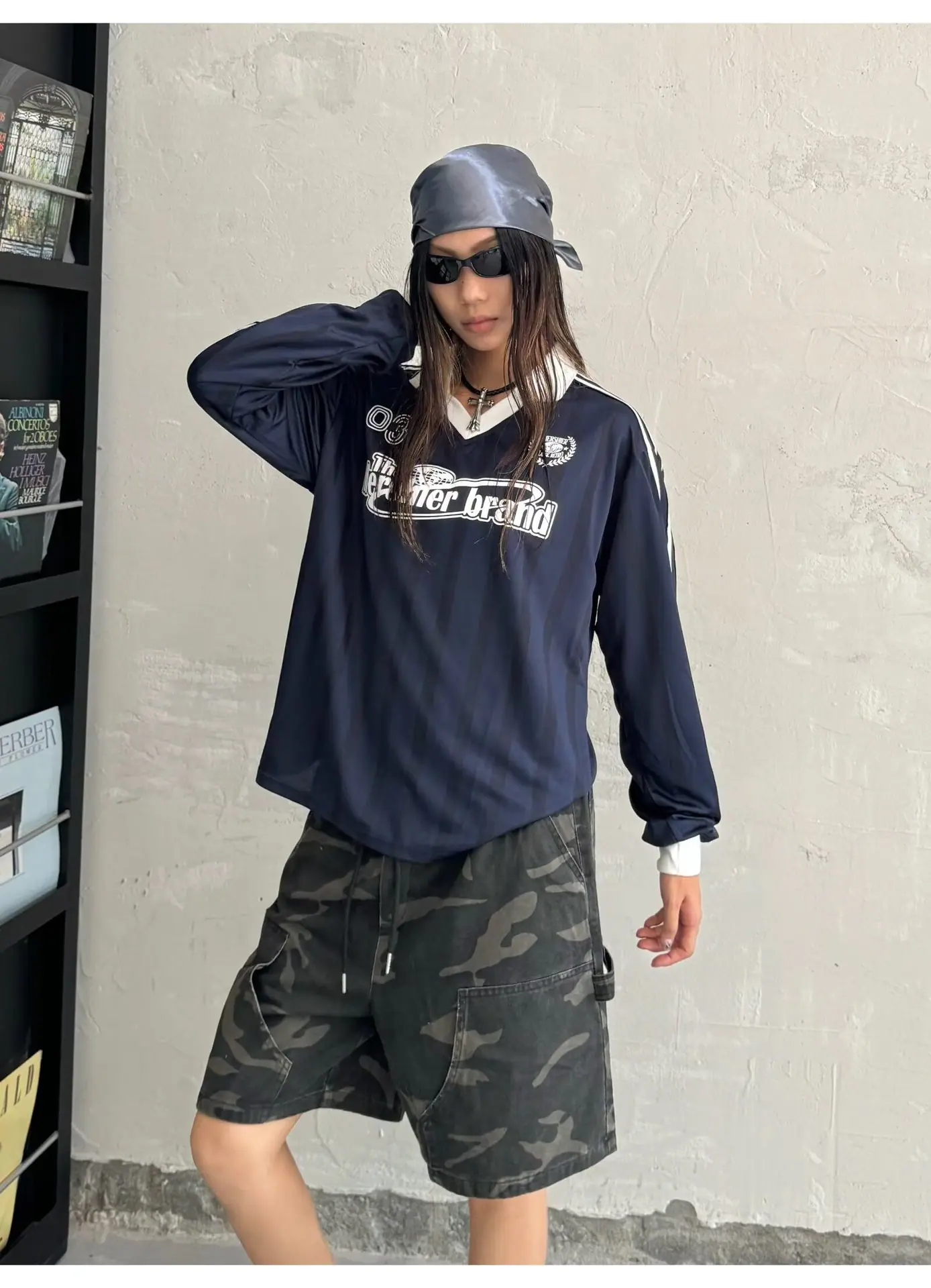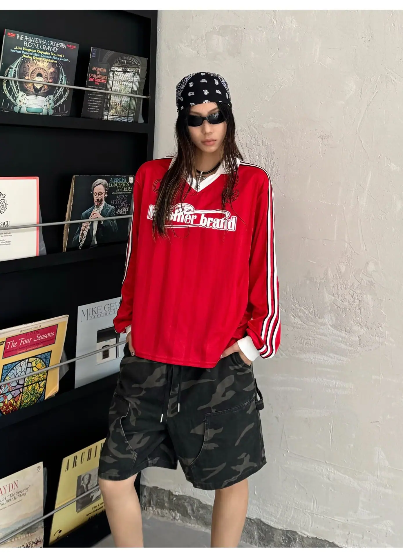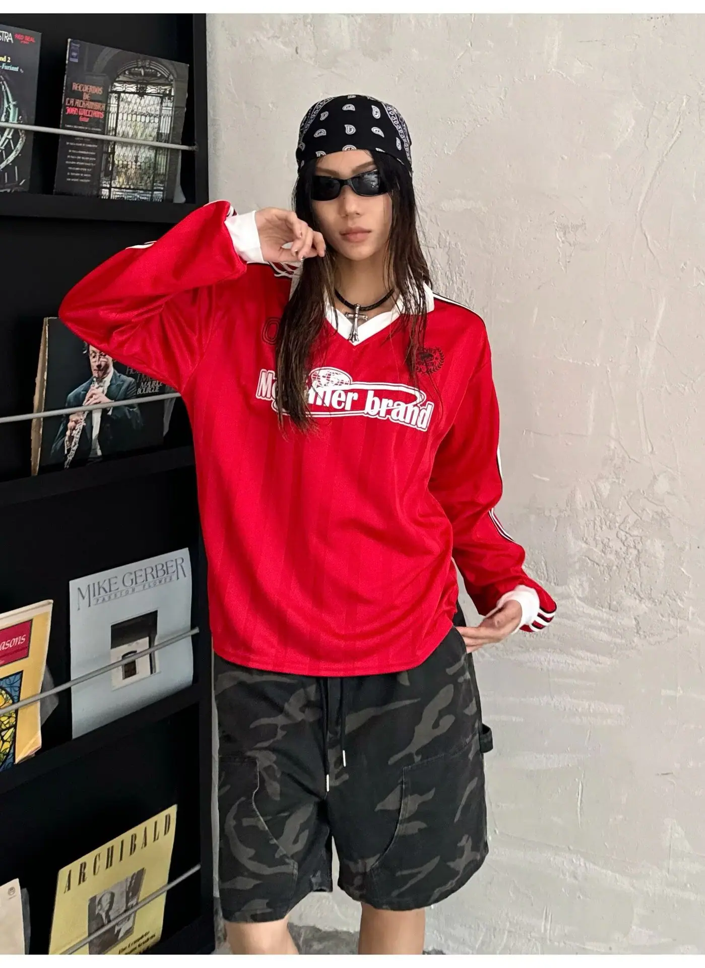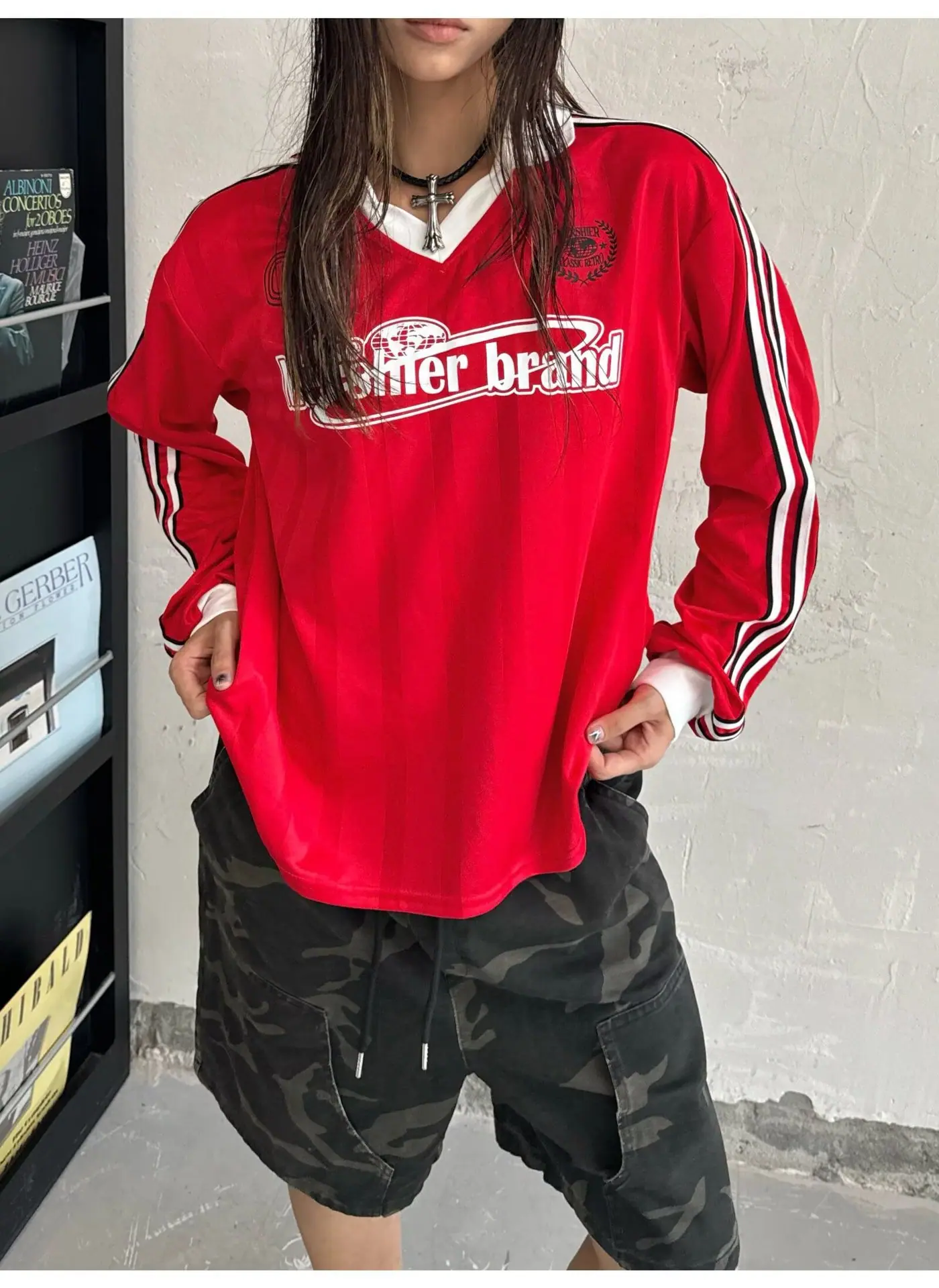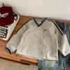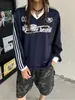 Moletom Casual Retrô Americano de Primavera e Outono Listrado Decote V Estampa de Letras Masculino e Feminino Solto Versátil Manga Longa Jersey Tendência