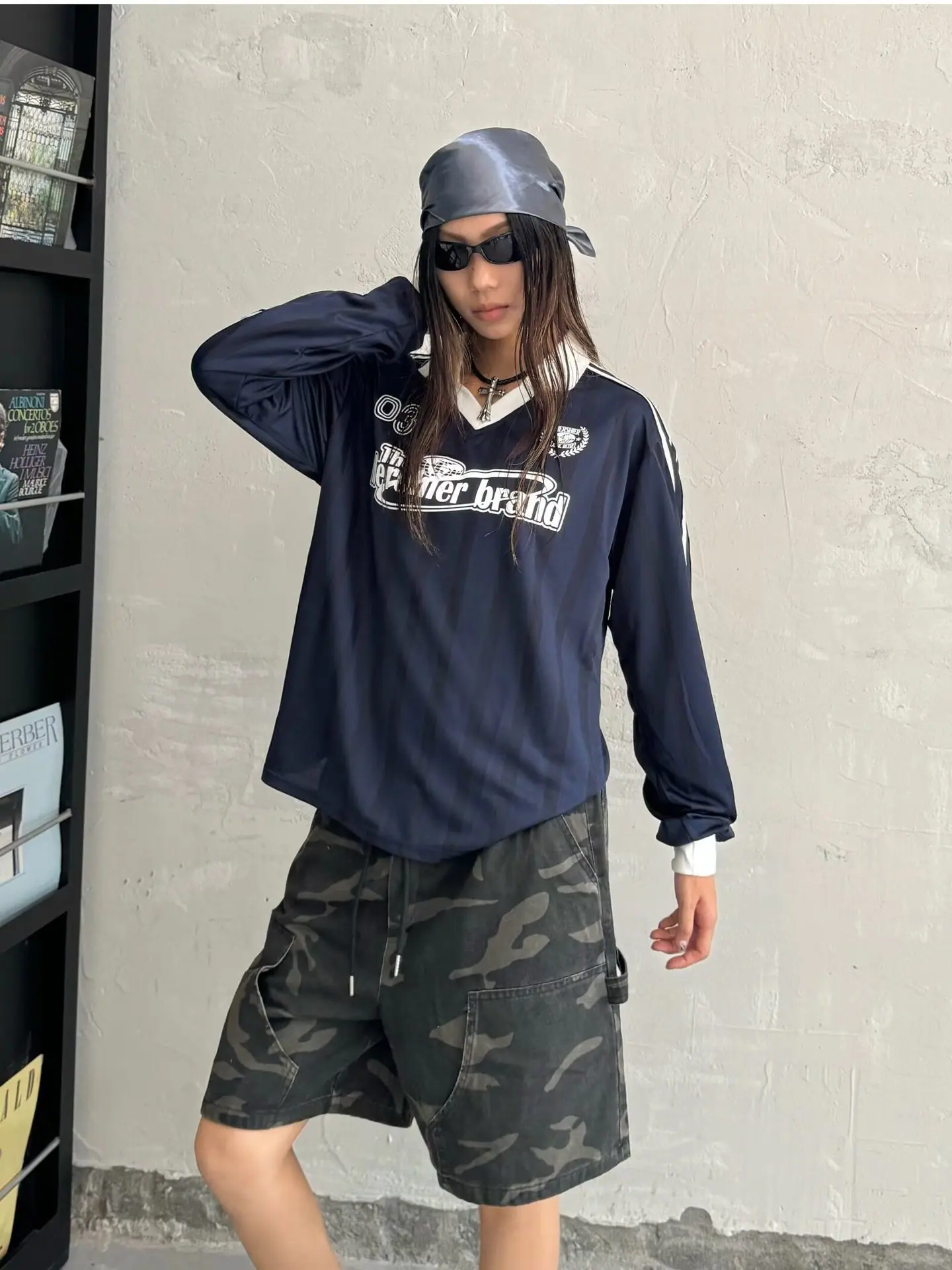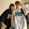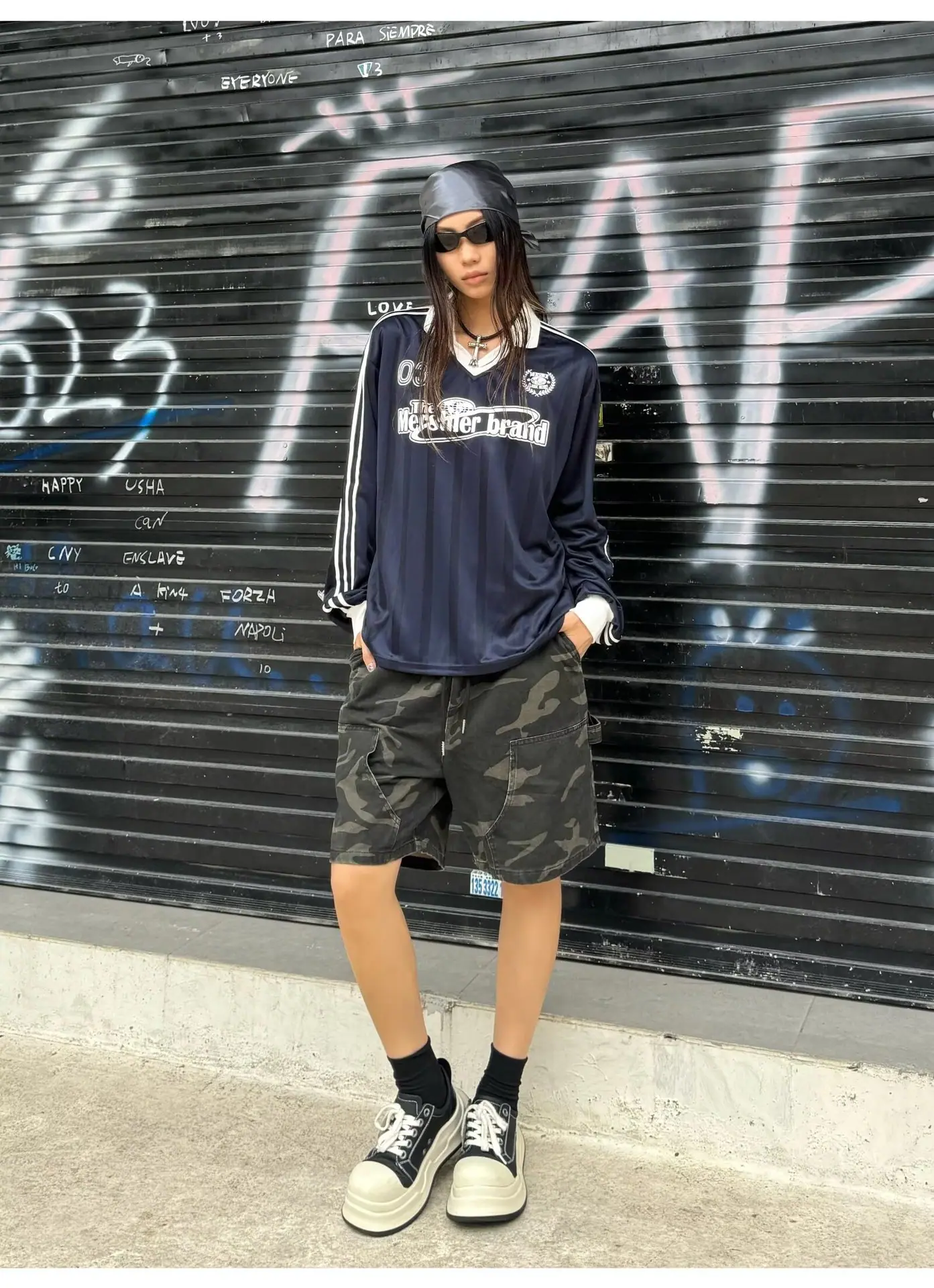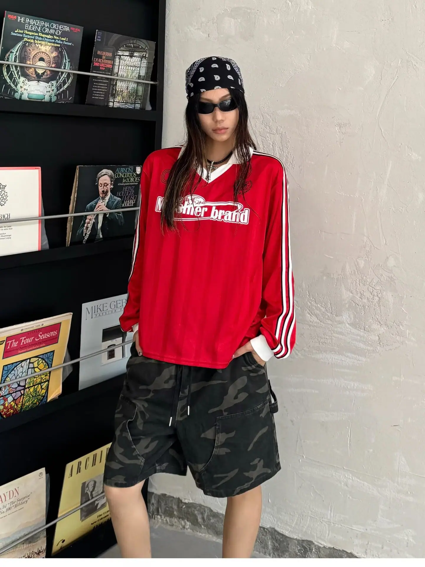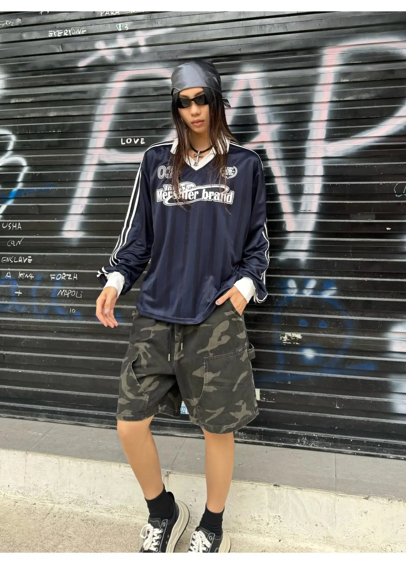 Moletom Casual Retrô Americano de Primavera e Outono Listrado Decote V Estampa de Letras Masculino e Feminino Solto Versátil Manga Longa Jersey Tendência