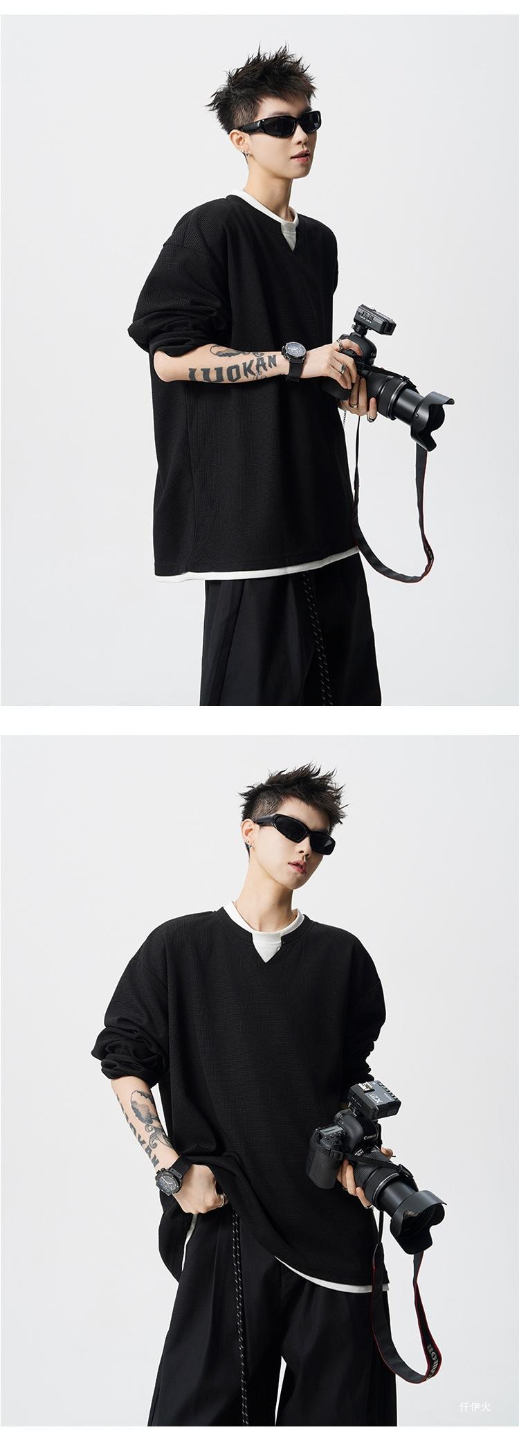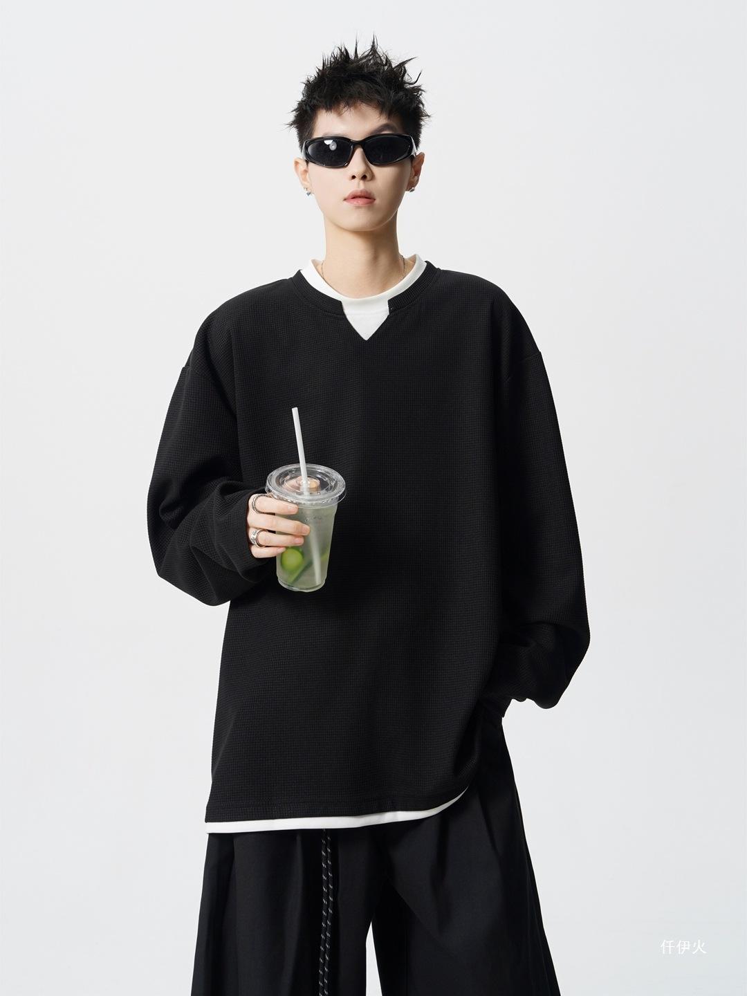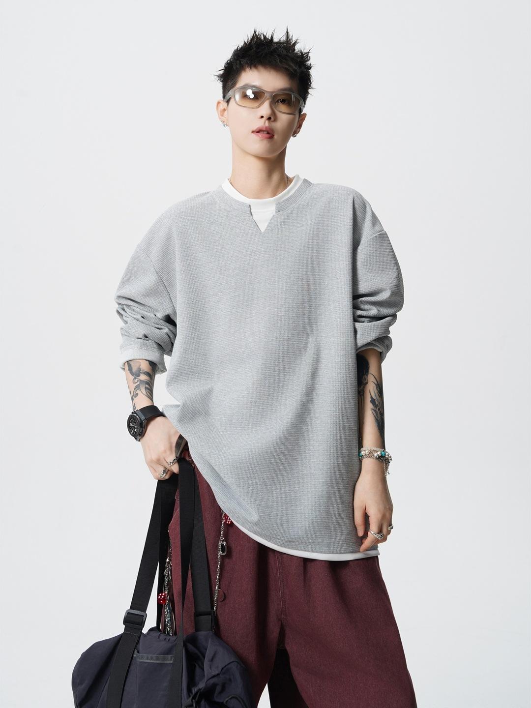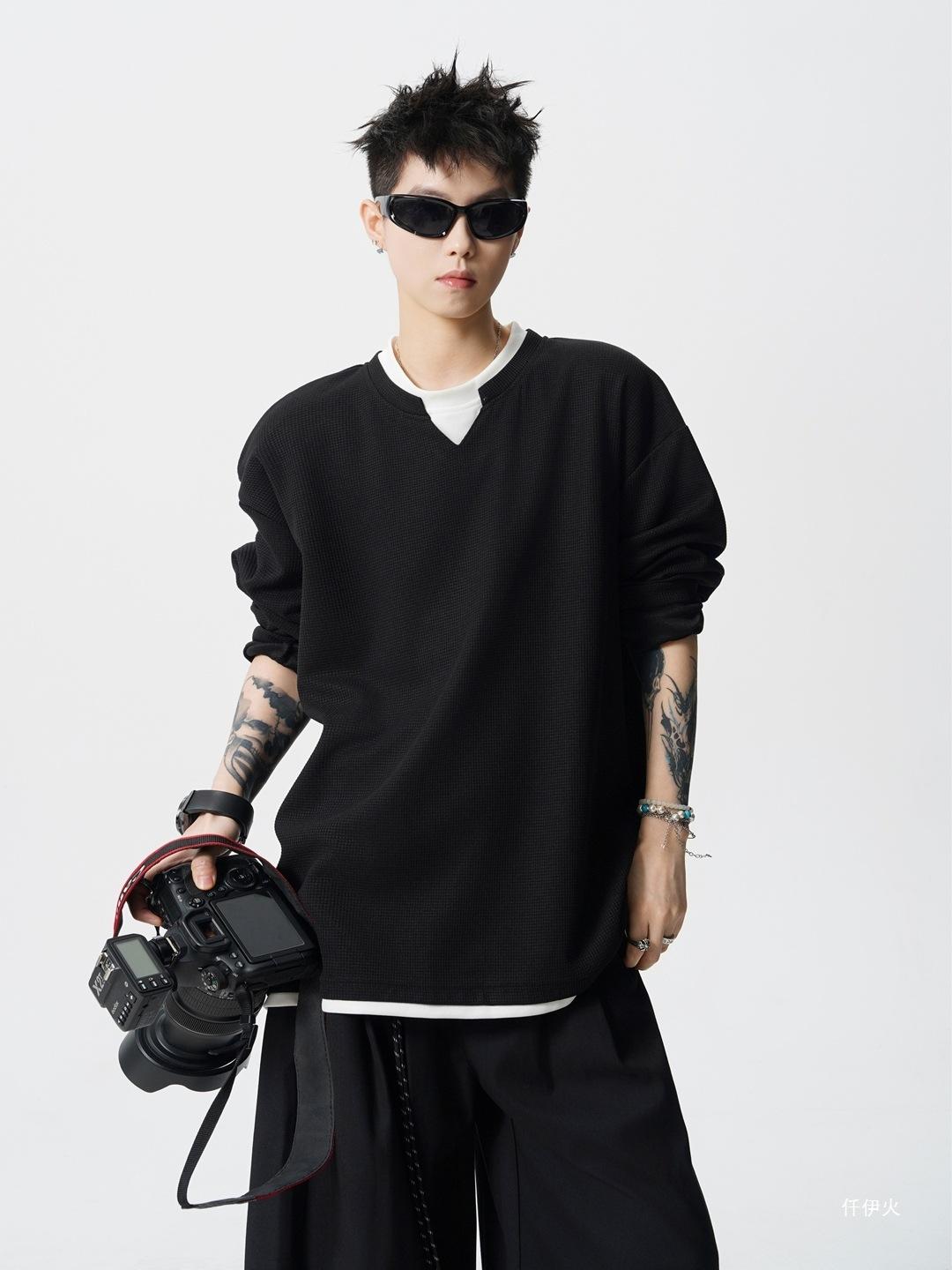 Camiseta Masculina Outono/Inverno Plus Size Decote V Tricô Waffle Manga Longa Aparência de Duas Peças Camiseta Base Camiseta Top Marca de Tendência Masculina
