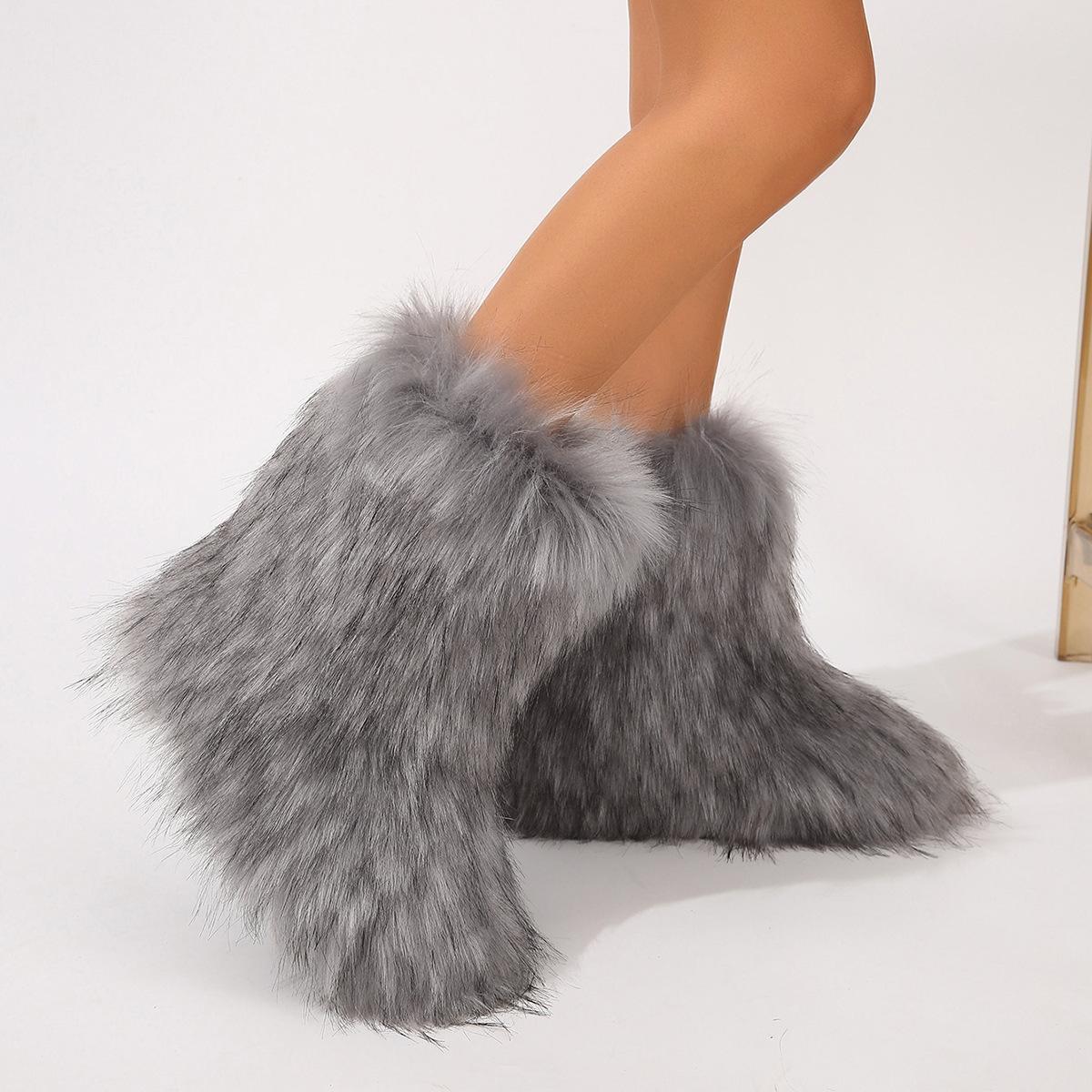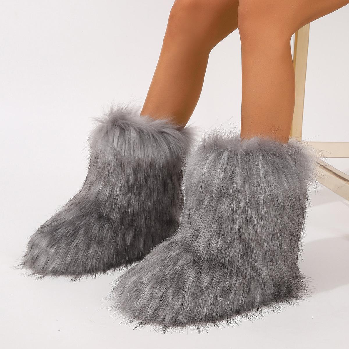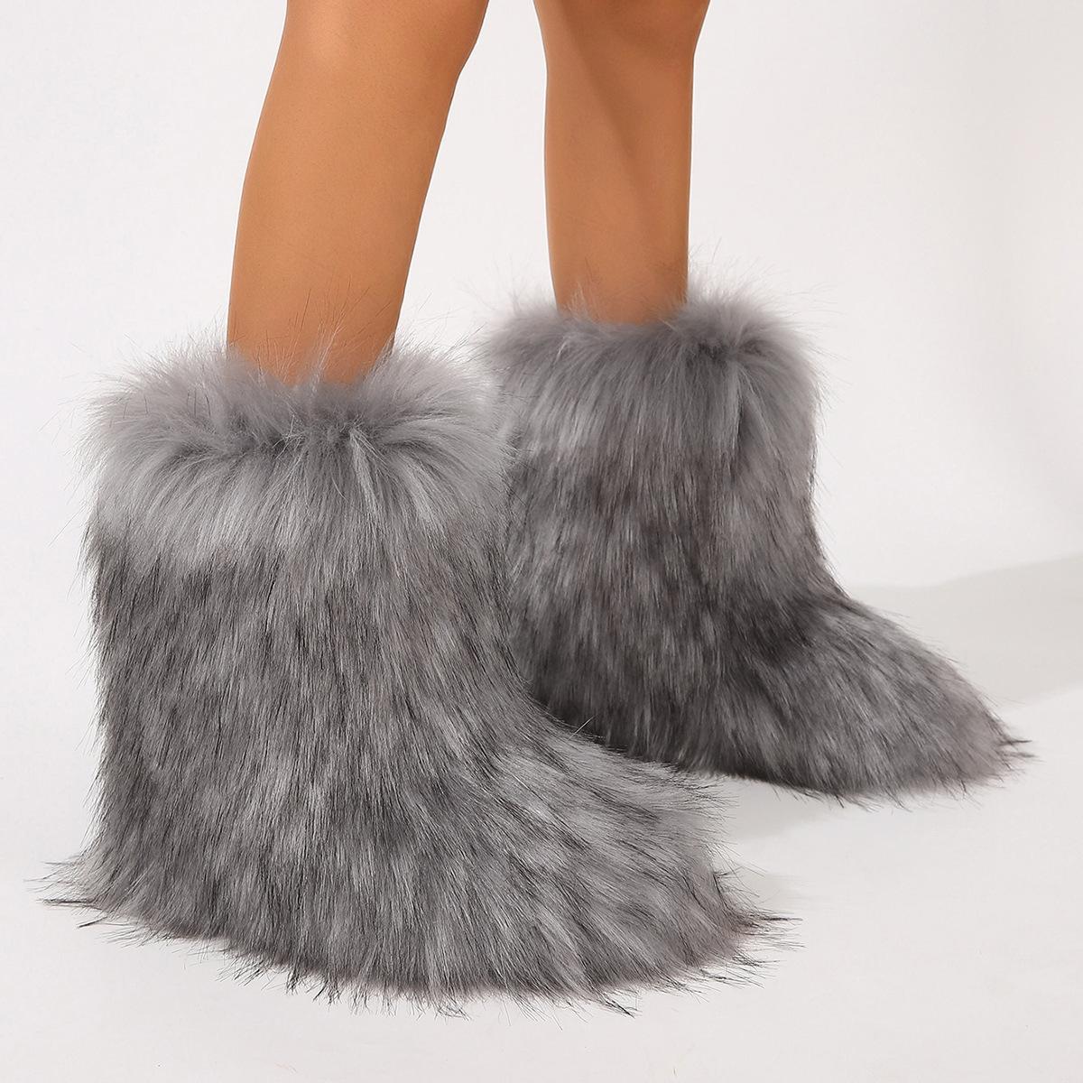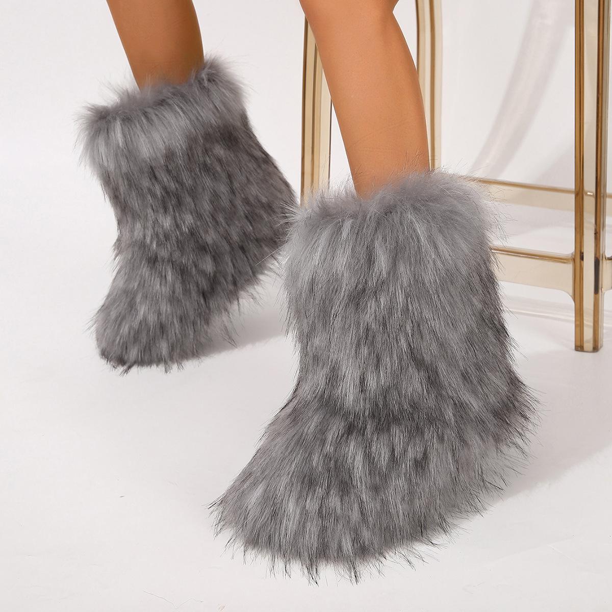 Botas de Neve Femininas Transfronteiriças Europeias e Americanas Flat Cano Alto Pele Sintética de Guaxinim Raposa Pele Sintética Inverno Quente Cano Médio