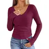 2026 Amazon Europeia e Americana Nova Versátil Cor Sólida Decote V Moda Slim Manga Longa Canelada Escovada Camiseta Feminina