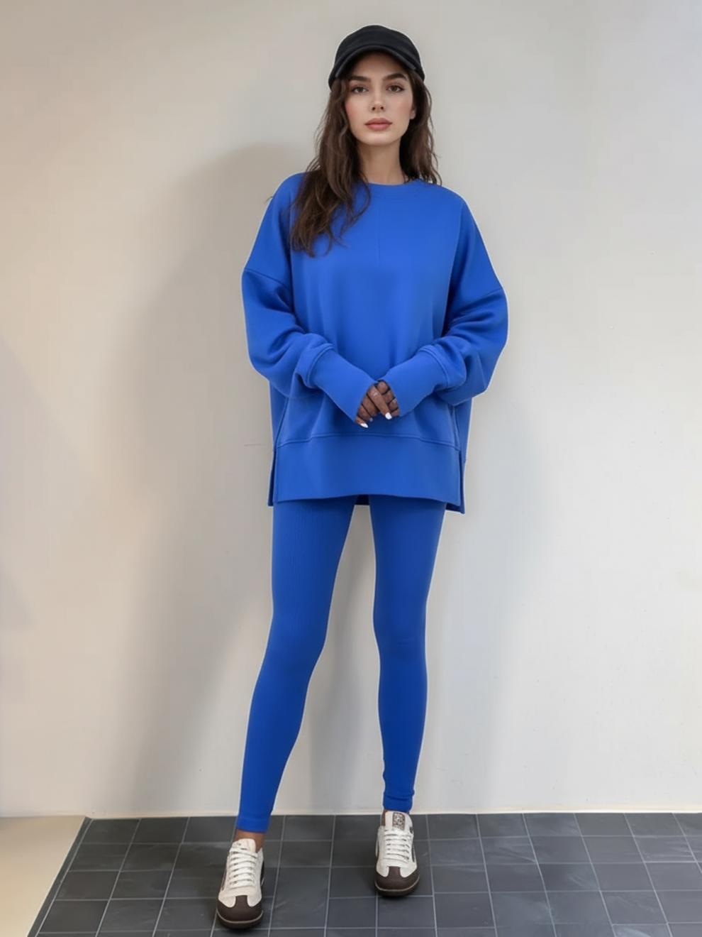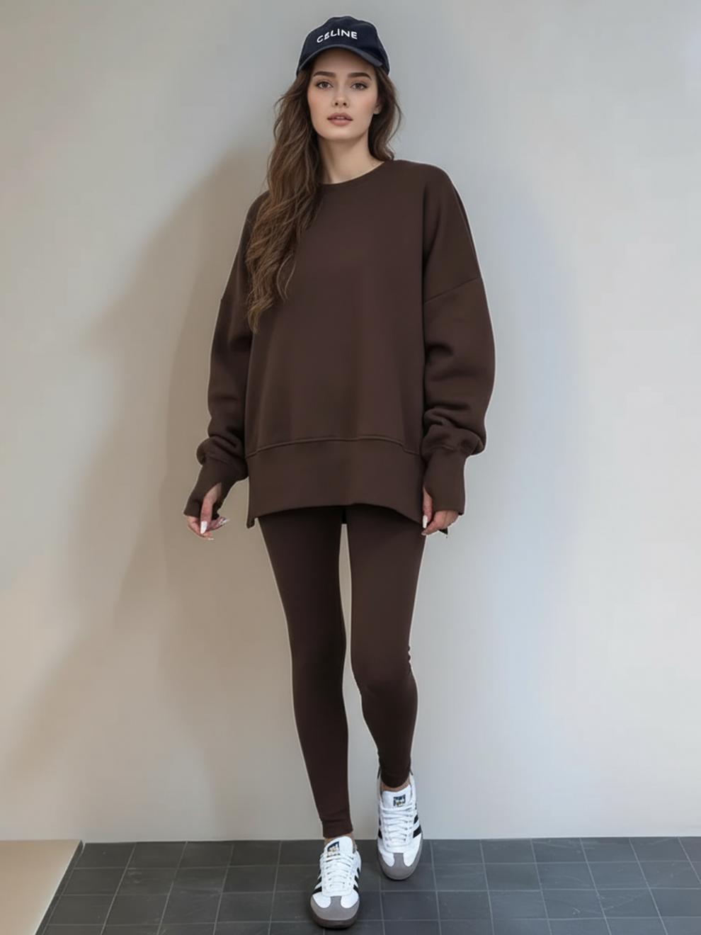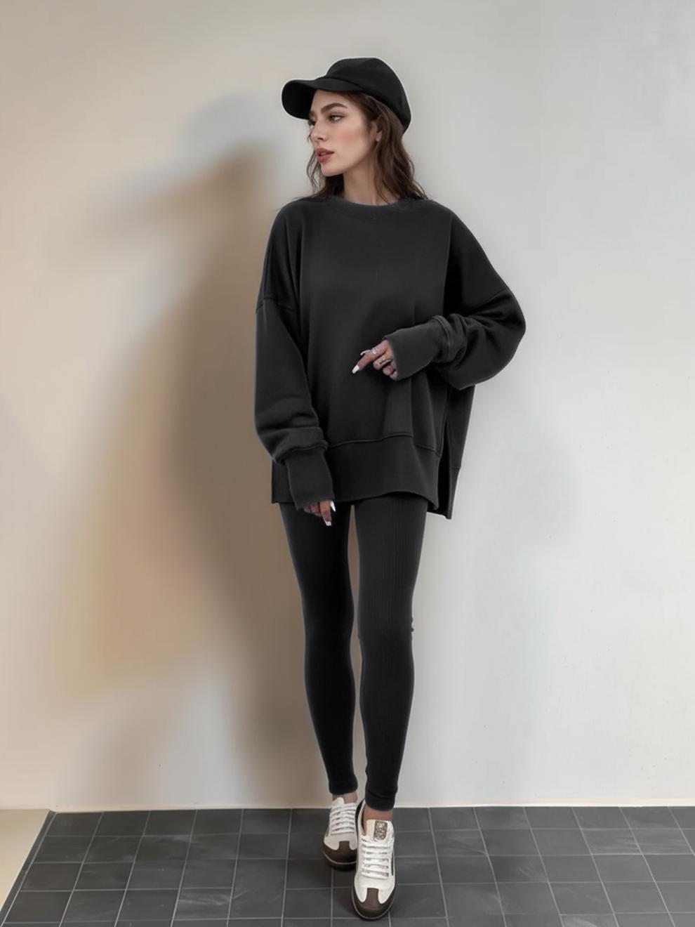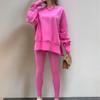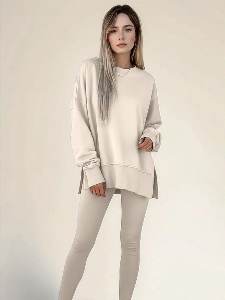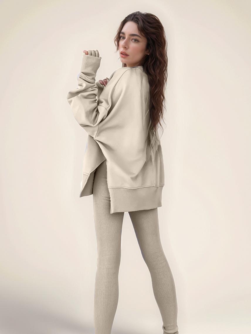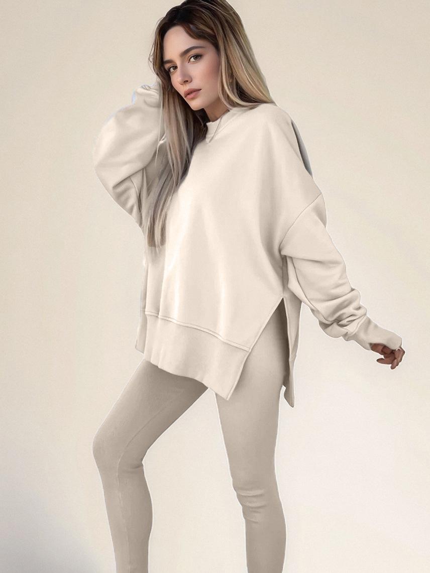 Conjunto de Moletom Feminino Europeu e Americano Casual Solto Manga Longa Gola Redonda Fenda Top Calça Longa Skinny Outono/Inverno 2025 Amazon