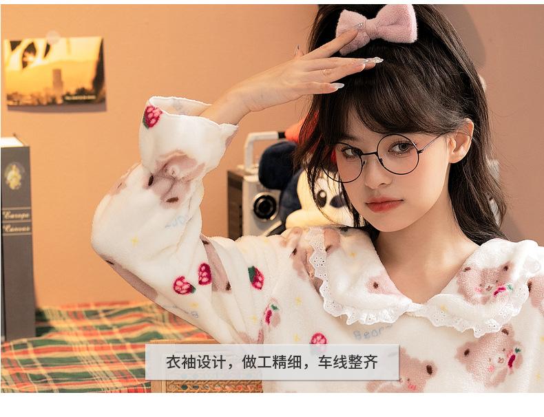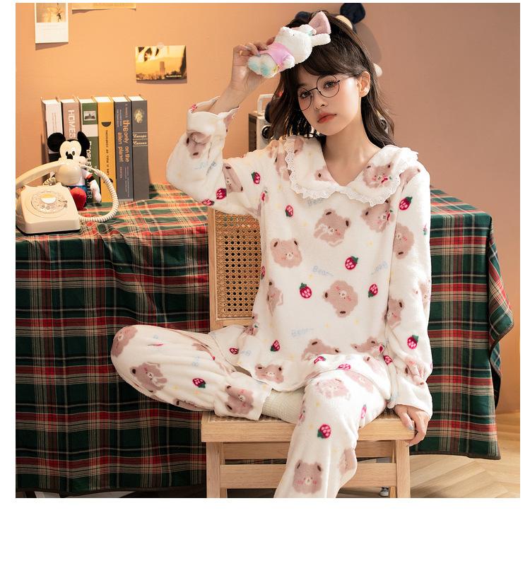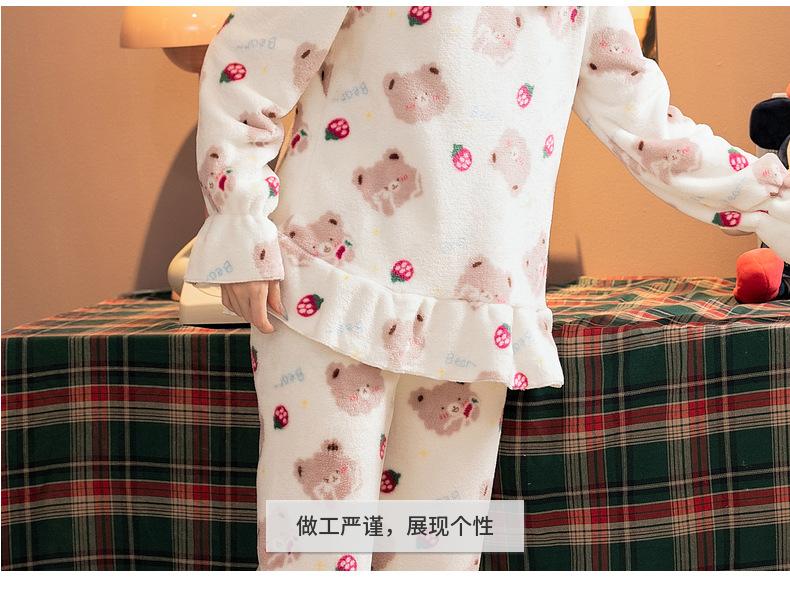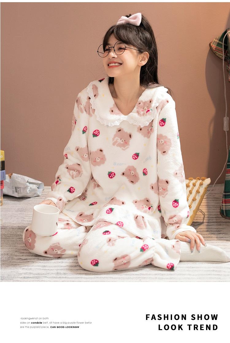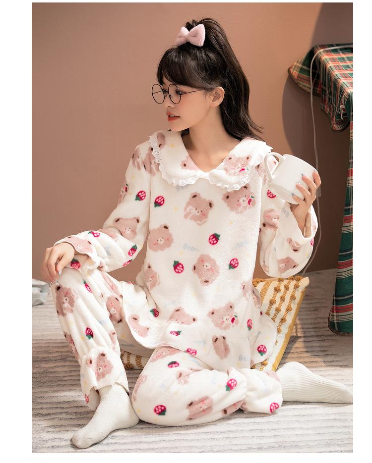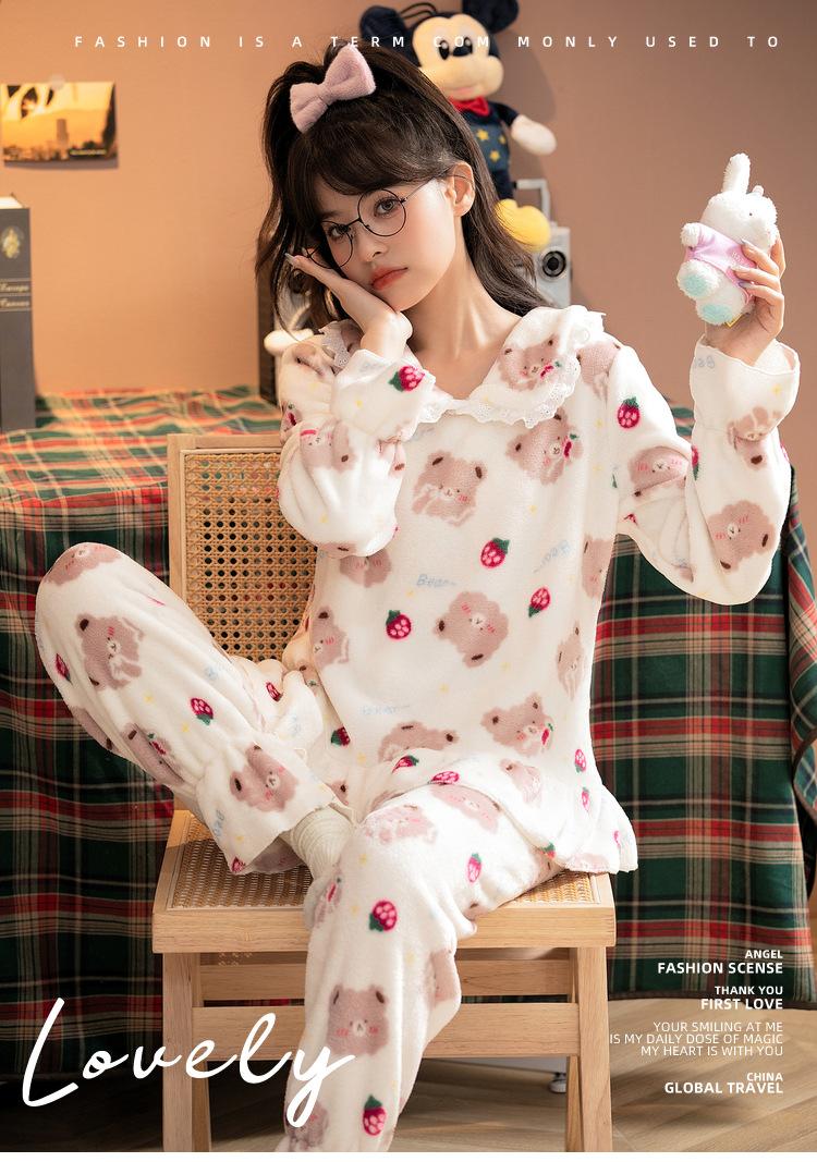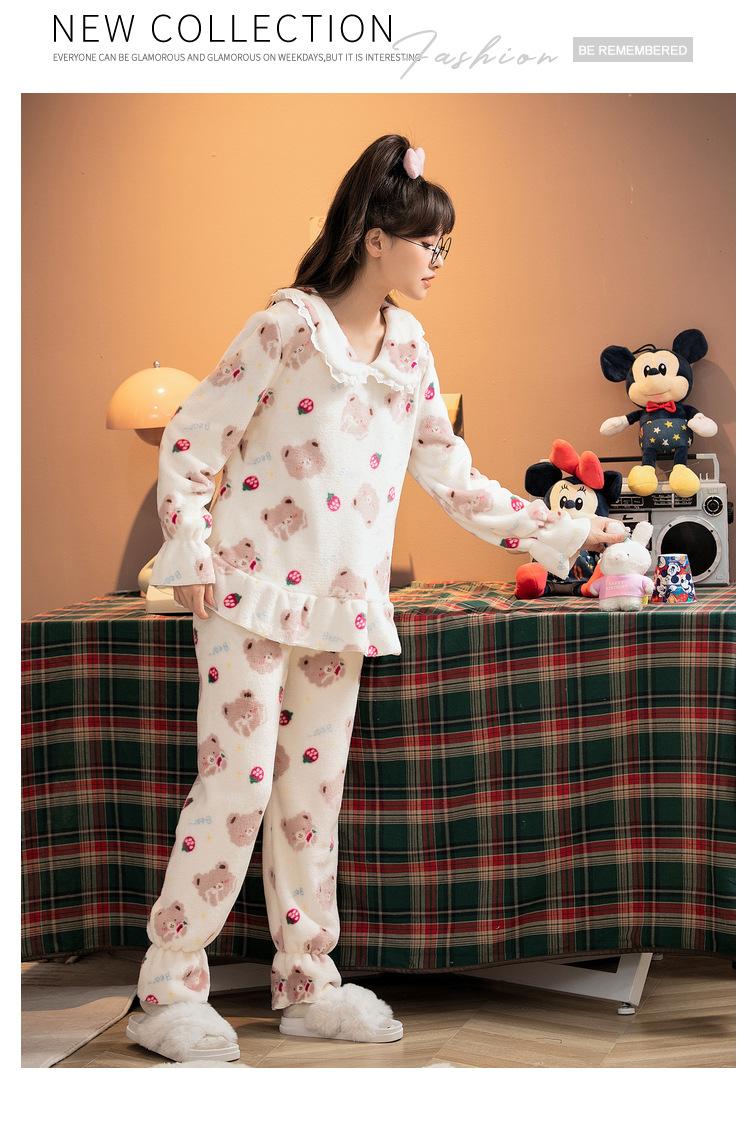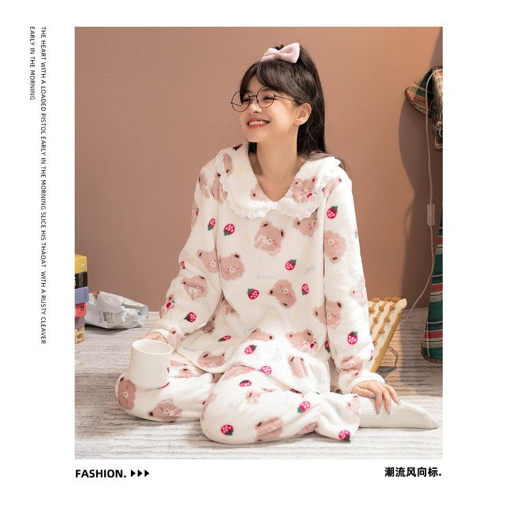 Pijama Estilo Coreano para Mulheres Veludo Coral Inverno Novo Veludo Espessado Flanela Outono e Inverno Senhoras Princesa Conjunto de Roupa de Casa