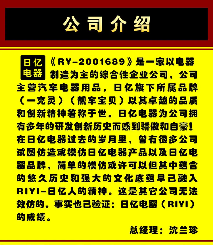 A Riyi Electric tem mais de 40 séries de produtos, as principais categorias incluem: bombas de ar para carros, aspiradores de pó para carros, ventiladores para carros, refrigeradores para carros, cinzeiros para carros, suportes para celulares para carros, kits de emergência para carros, isqueiros para carros, lavadores de carros, séries de ferramentas de ferragens para carros, séries de garantia final e mais de 20 séries principais de produtos. A empresa garante a qualidade de seus produtos com equipamentos de teste avançados, gestão científica e processo de fabricação razoável.