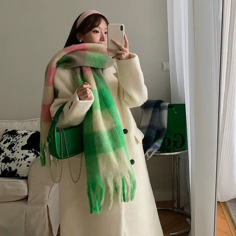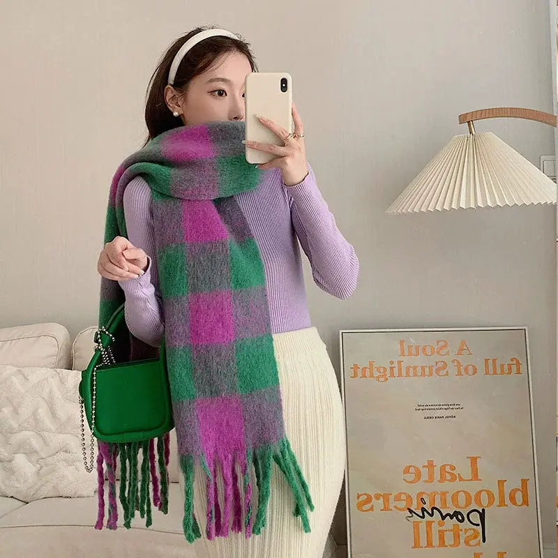 Glicínia e bambu verde ~ nicho combinação de cores xadrez contraste cachecol engrossado inverno roupa exterior à prova de frio xadrez cachecol quente para o pescoço