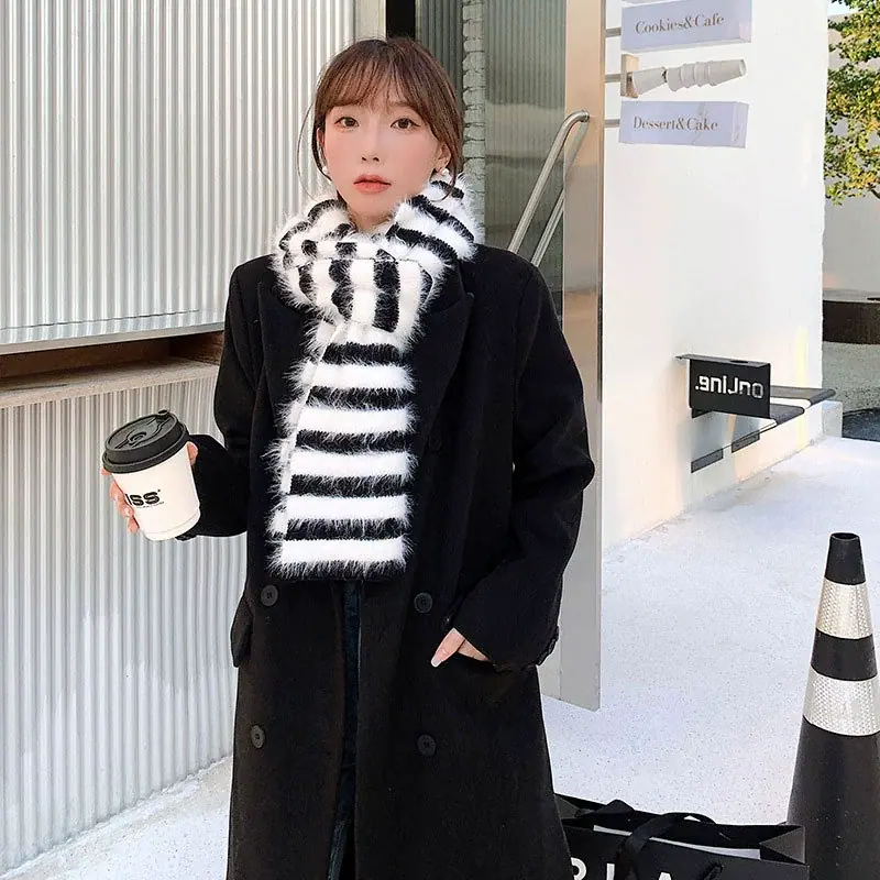 Jade preto branco ~ cachecol listrado de tricô de vison sintético de pelo longo decorativo simples e forte para mulheres, cachecol de pescoço para casal espesso à prova de frio