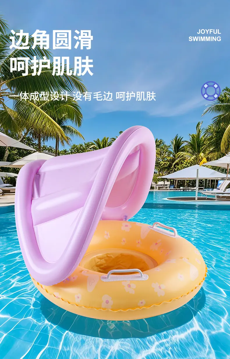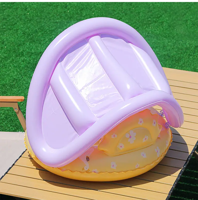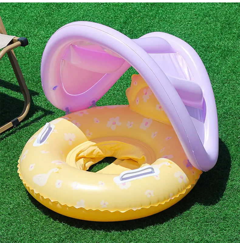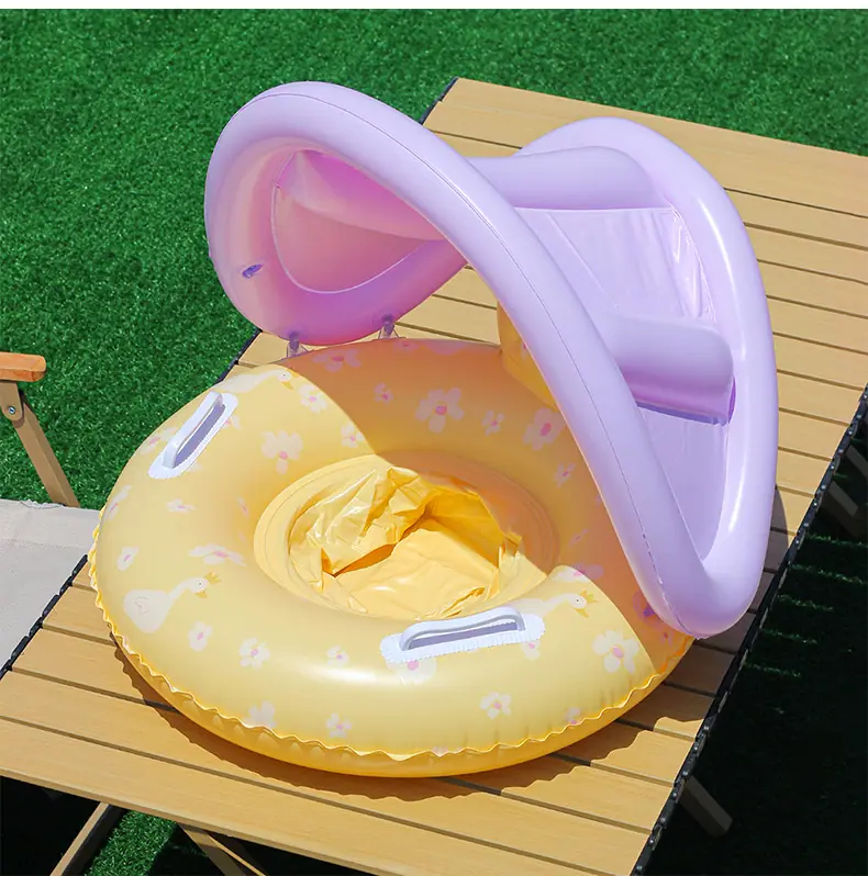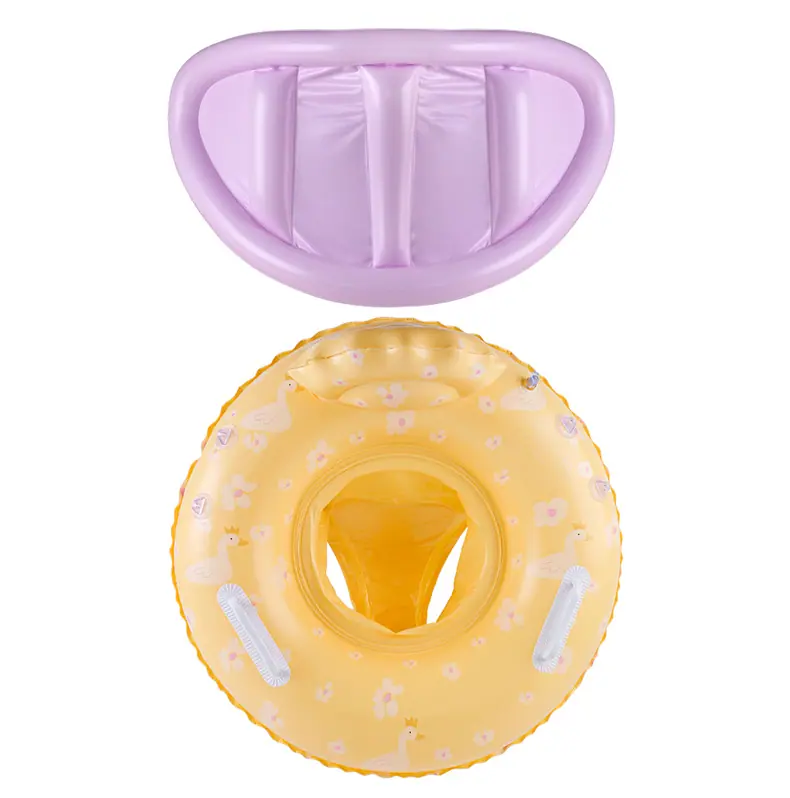 Novo Assento Infantil Amarelo com Estampa de Flor e Proteção Solar com Alça e Encosto Confiável Assento Inflável para Água para Bebê Atacado