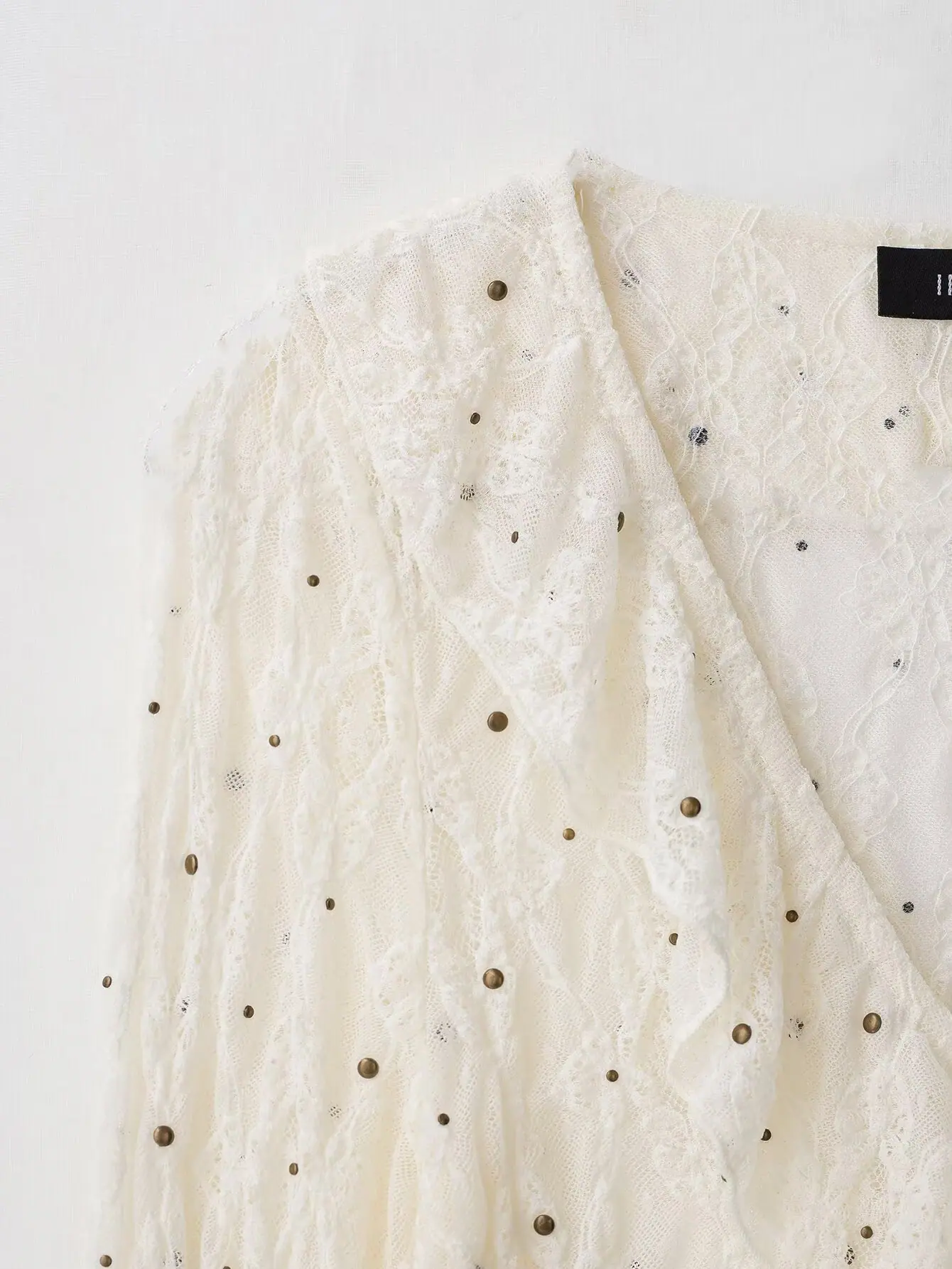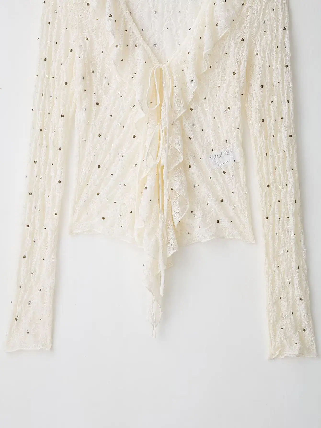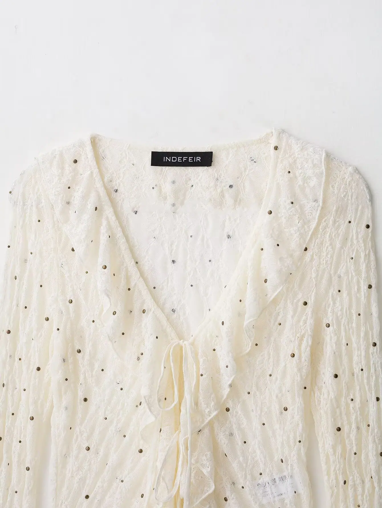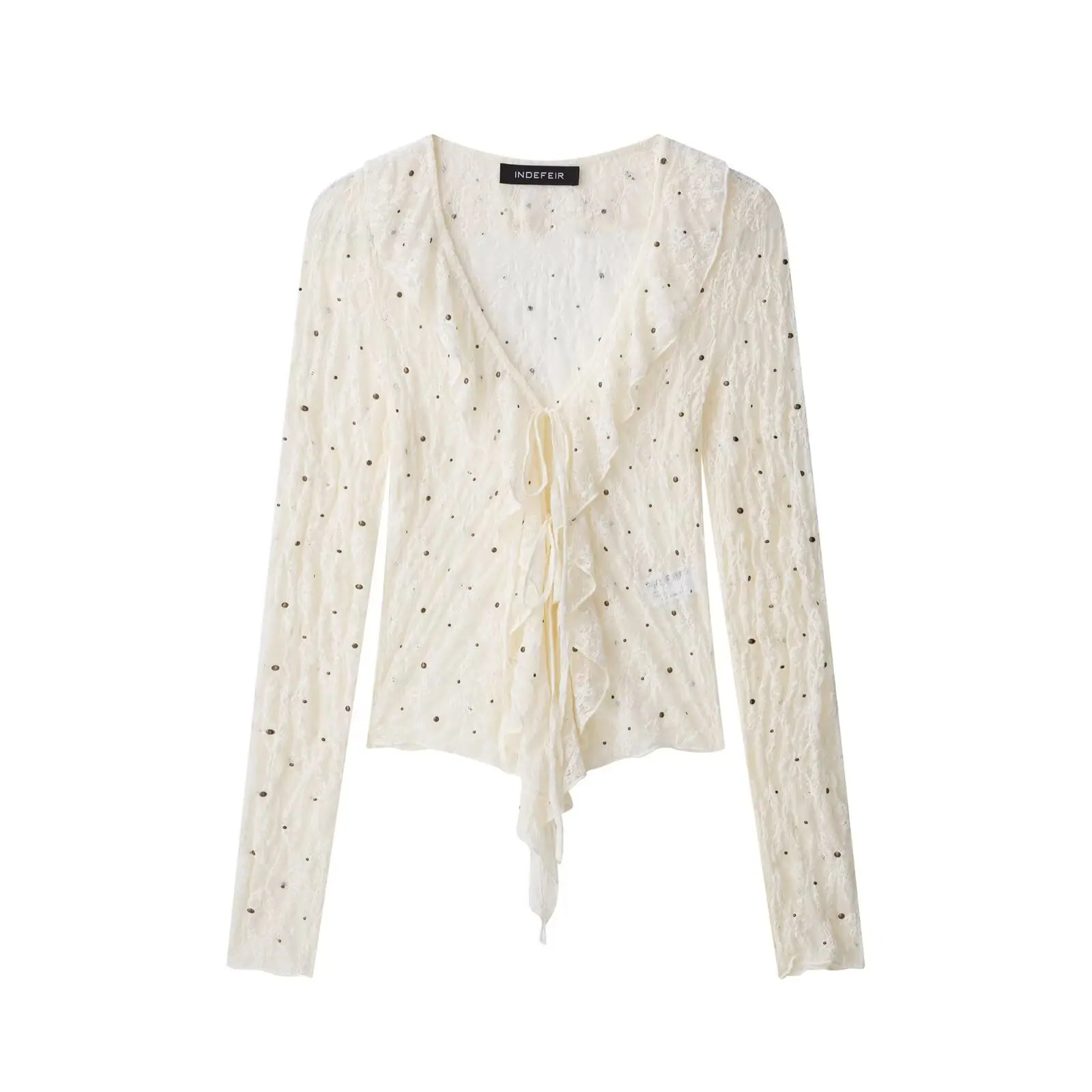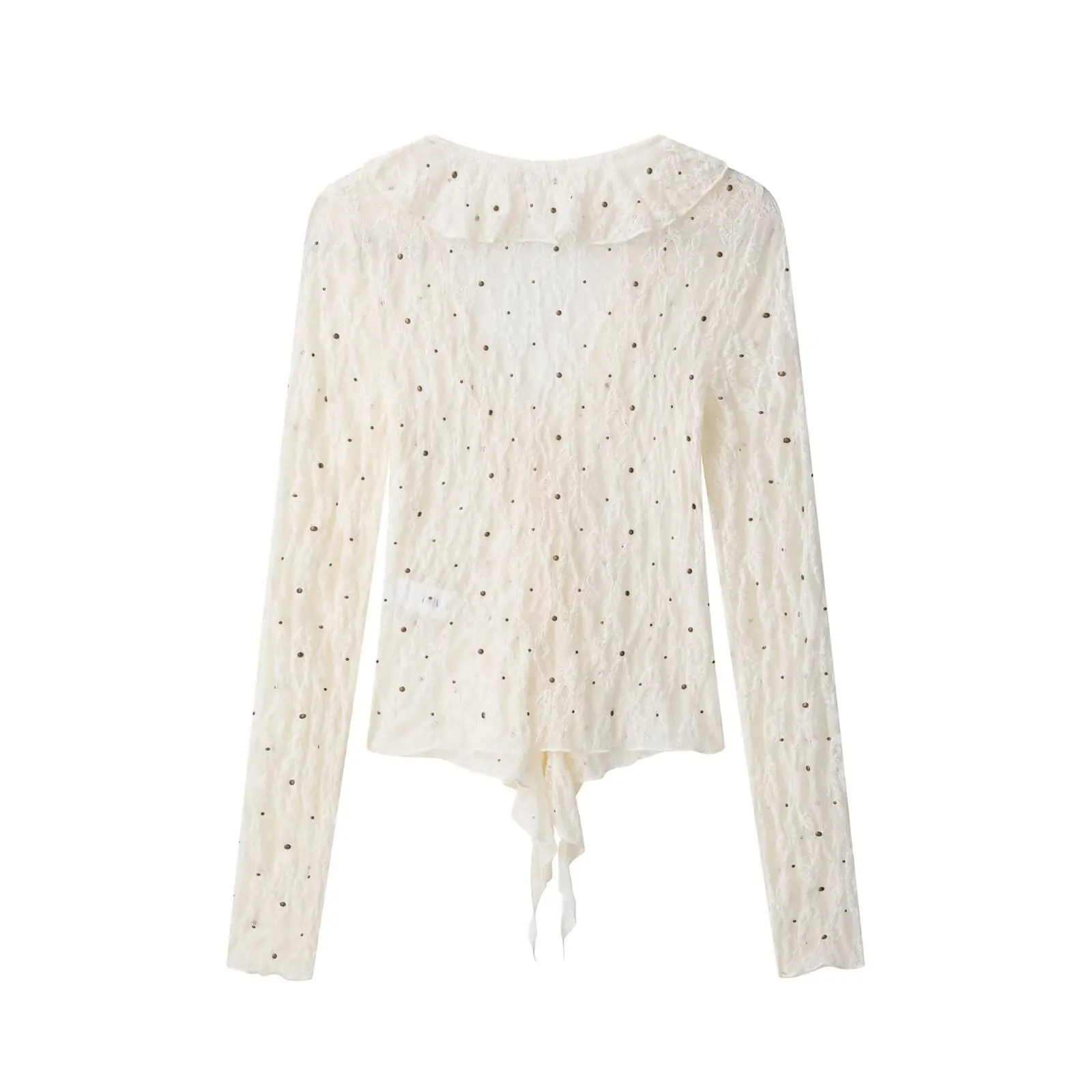 Outono 2025 Nova Roupa Feminina Estilo Europeu e Americano Moda Temperamento Rebite Gola Babado Renda Plissada Manga Longa Top Feminino