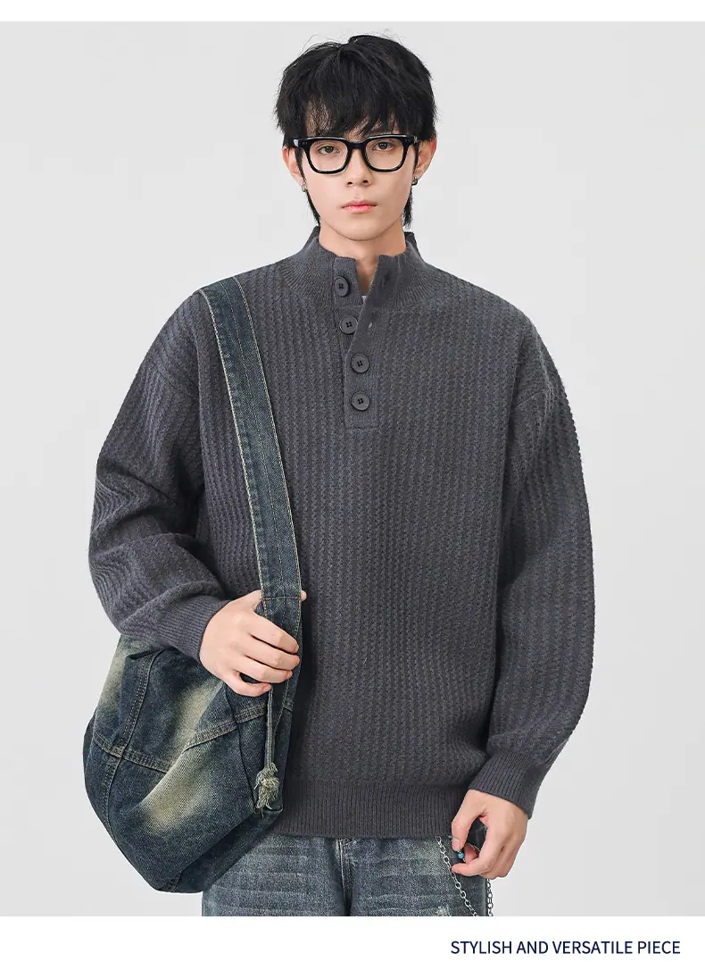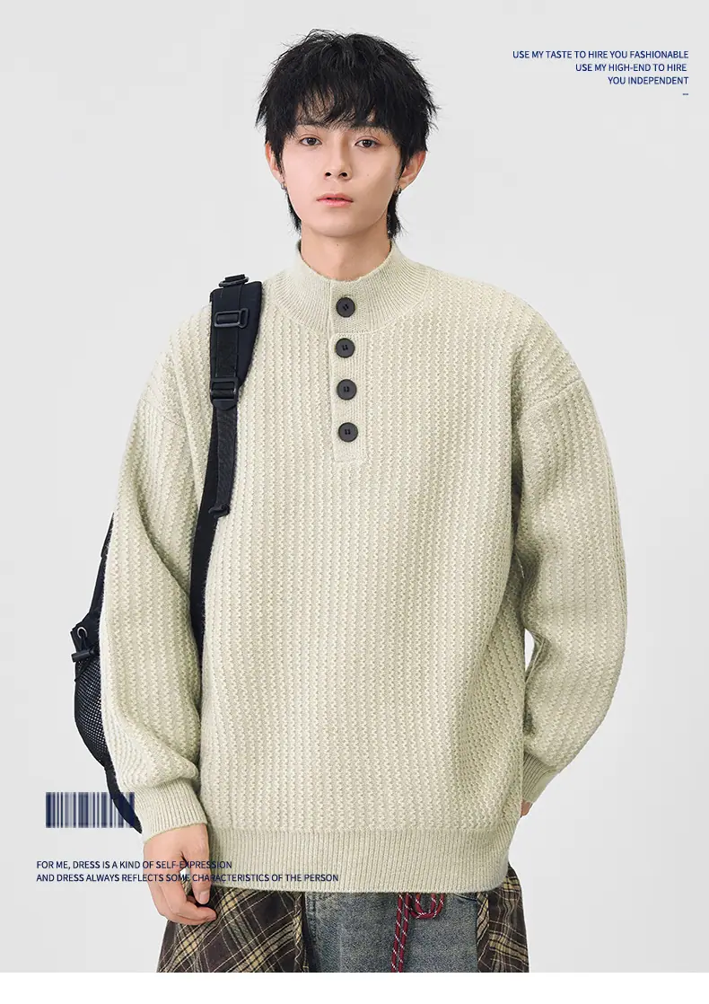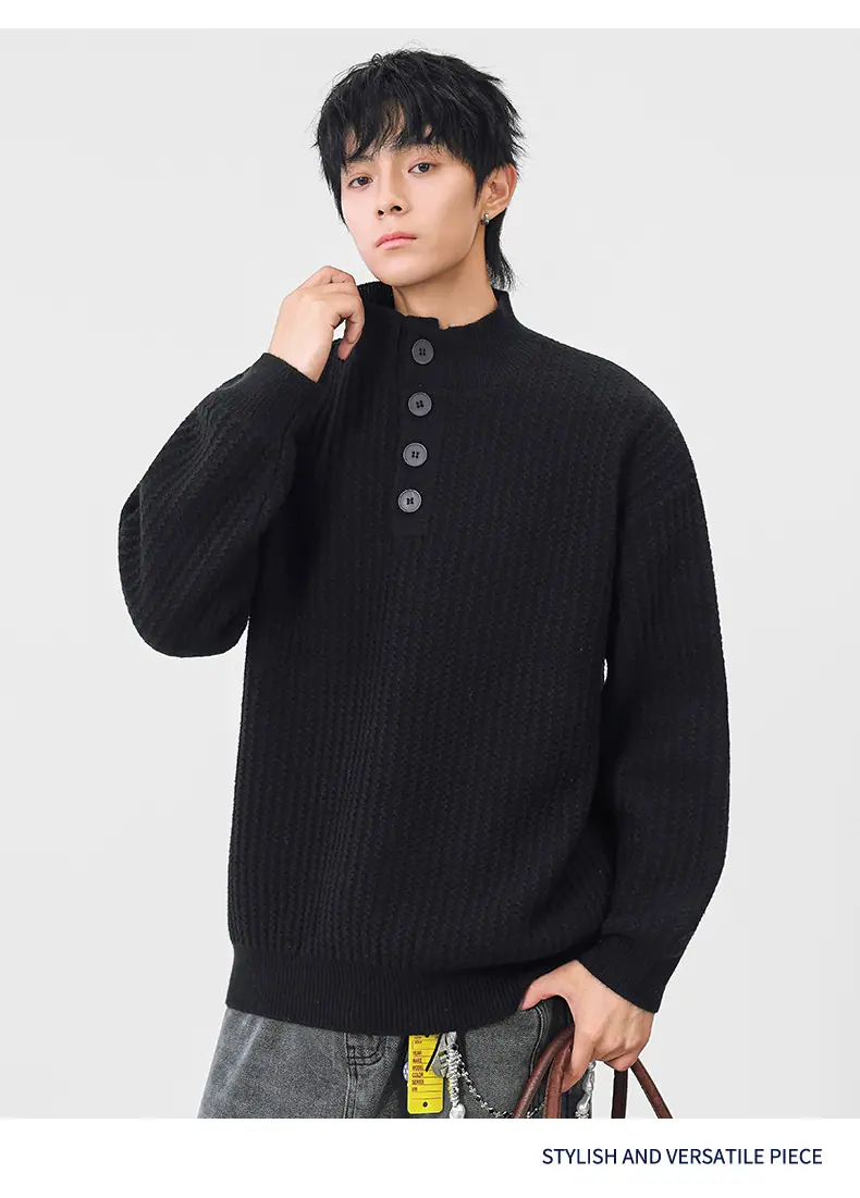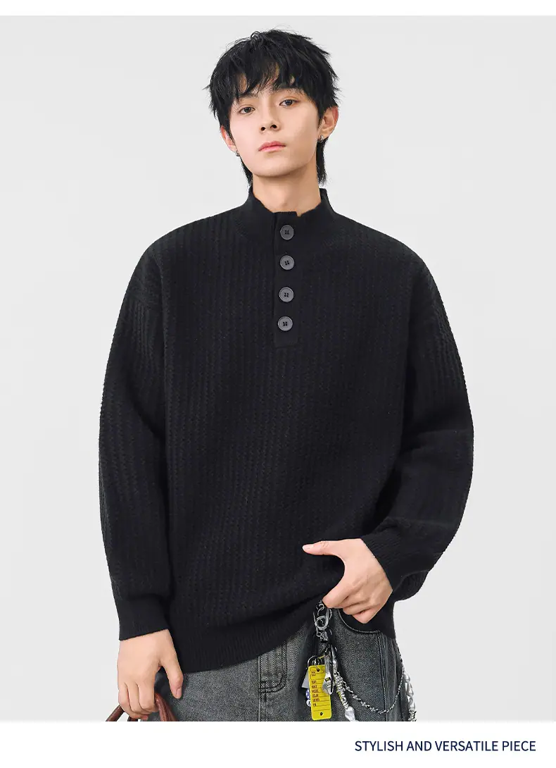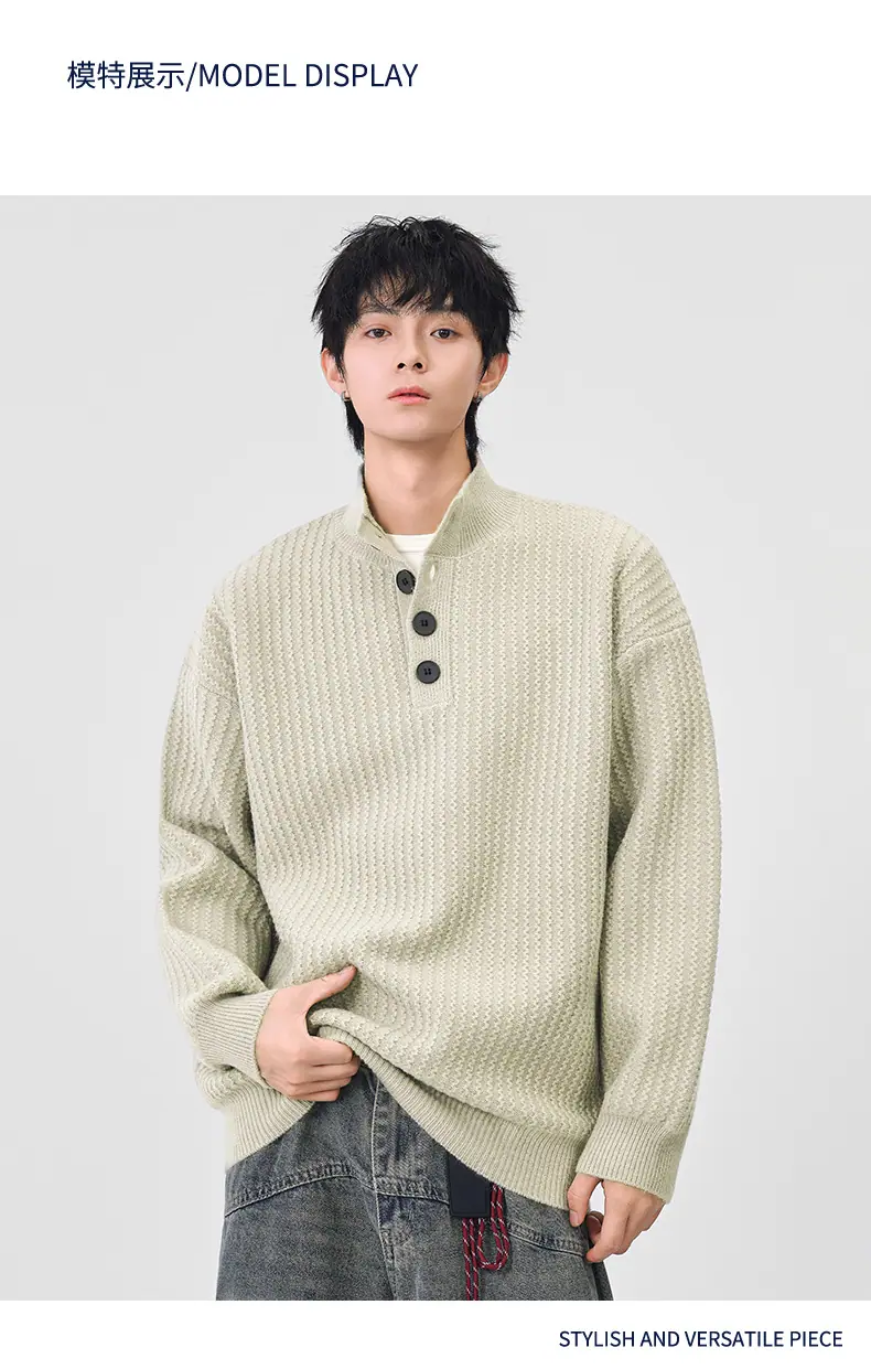 Tricô Masculino 2025 Outono/Inverno Novo Pulôver Gola Alta Pulôver com Botões Suéter Versátil Tendência Solta Japonesa Espesso